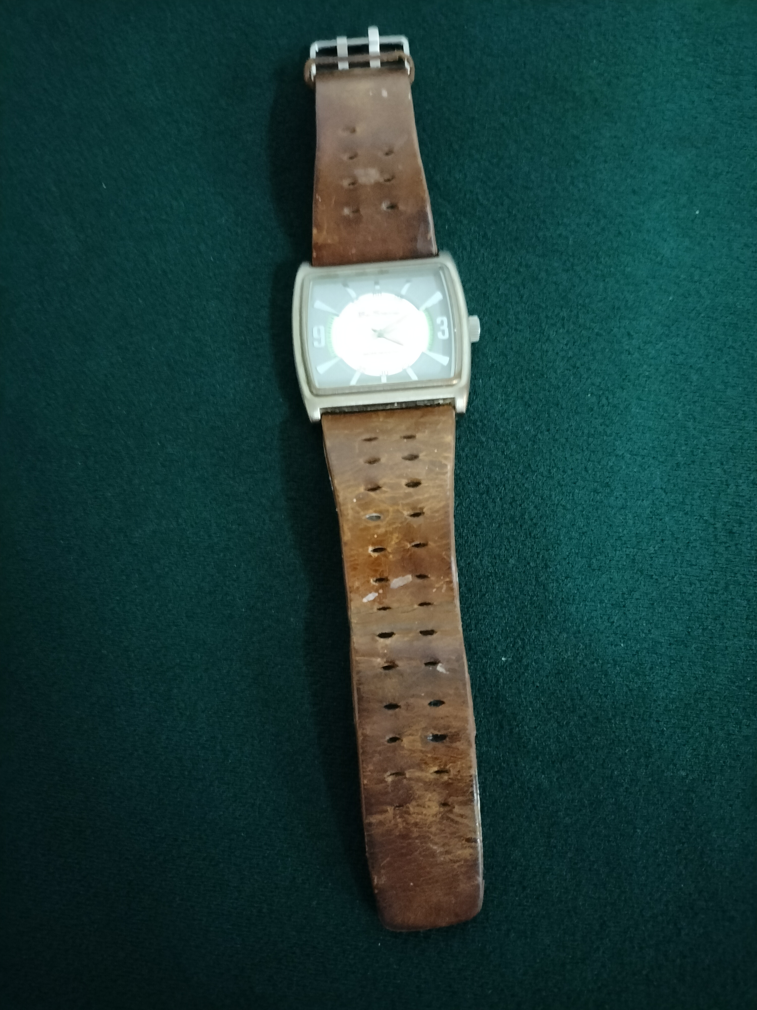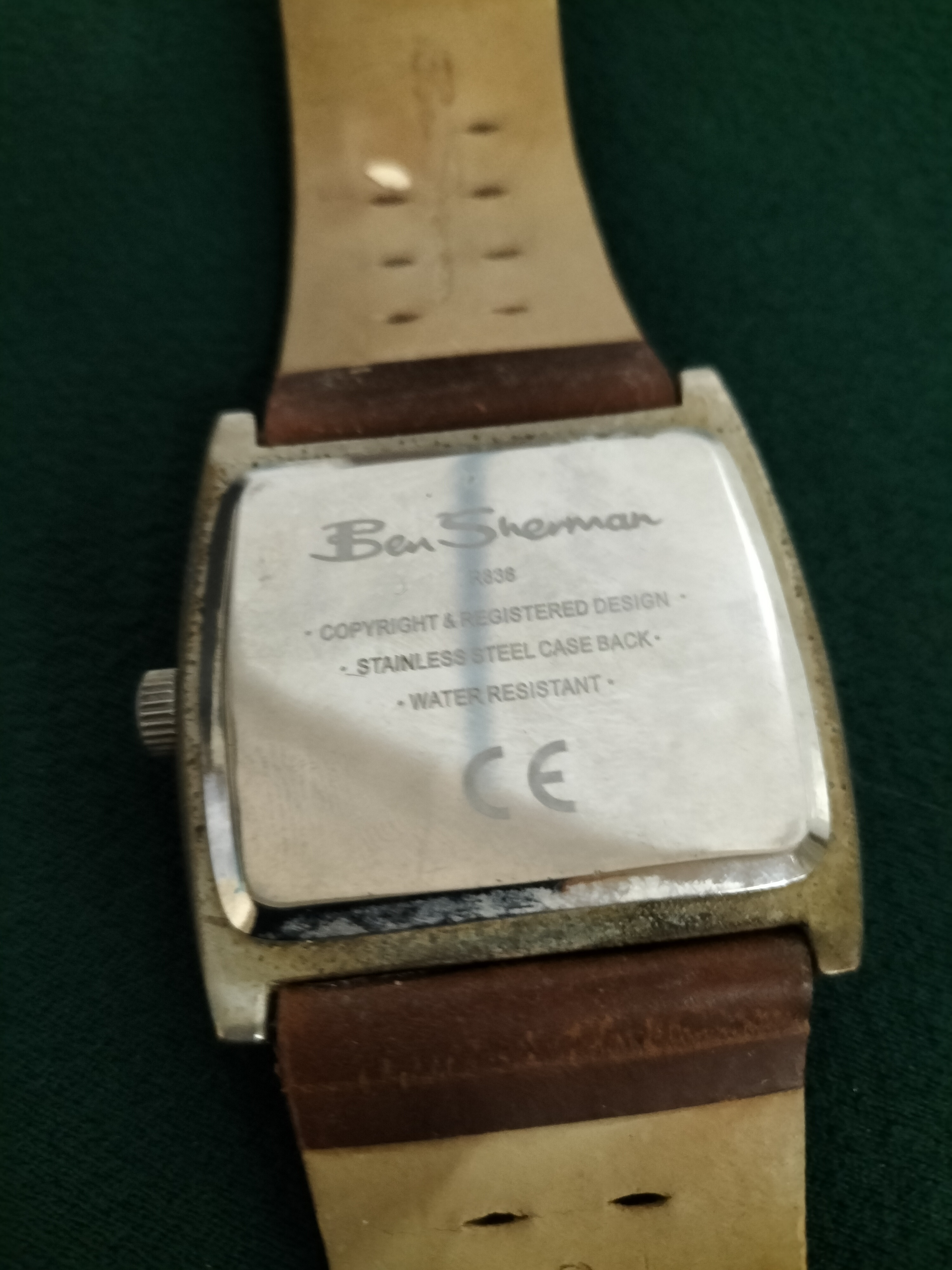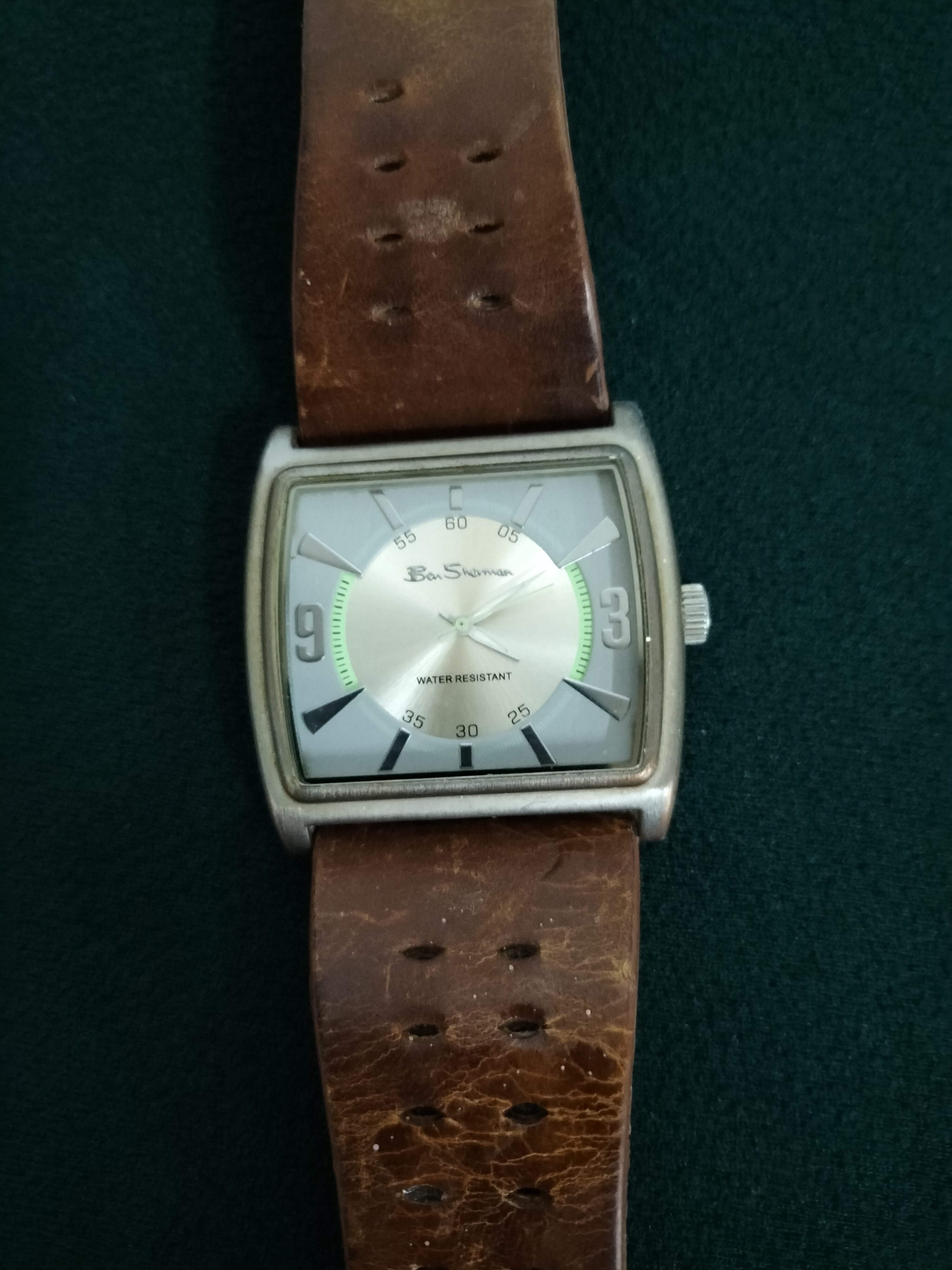 A Ben Sherman R838 wristwatch featuring a square silver-toned dial, stainless steel case back, and a brown perforated leather strap.