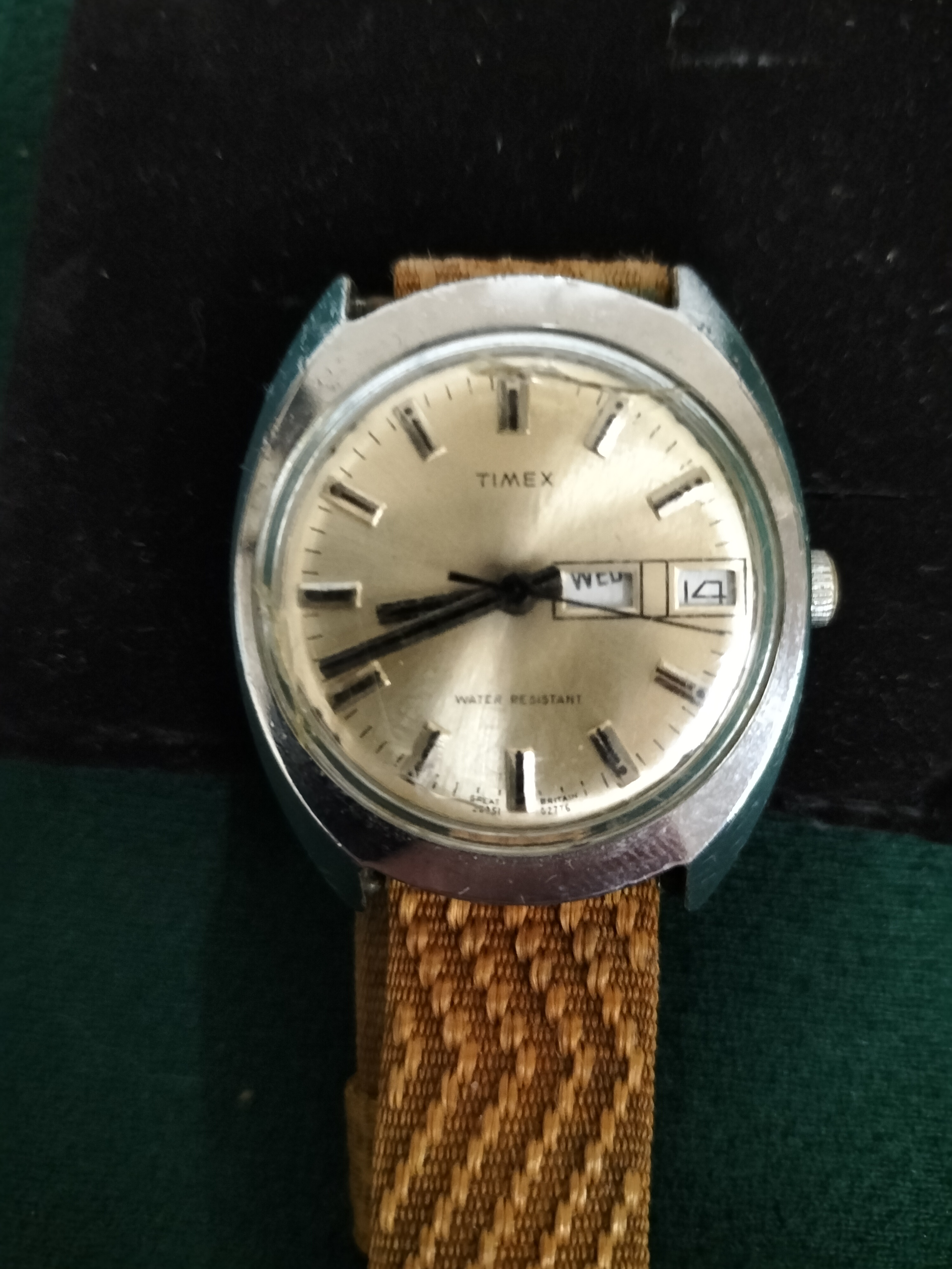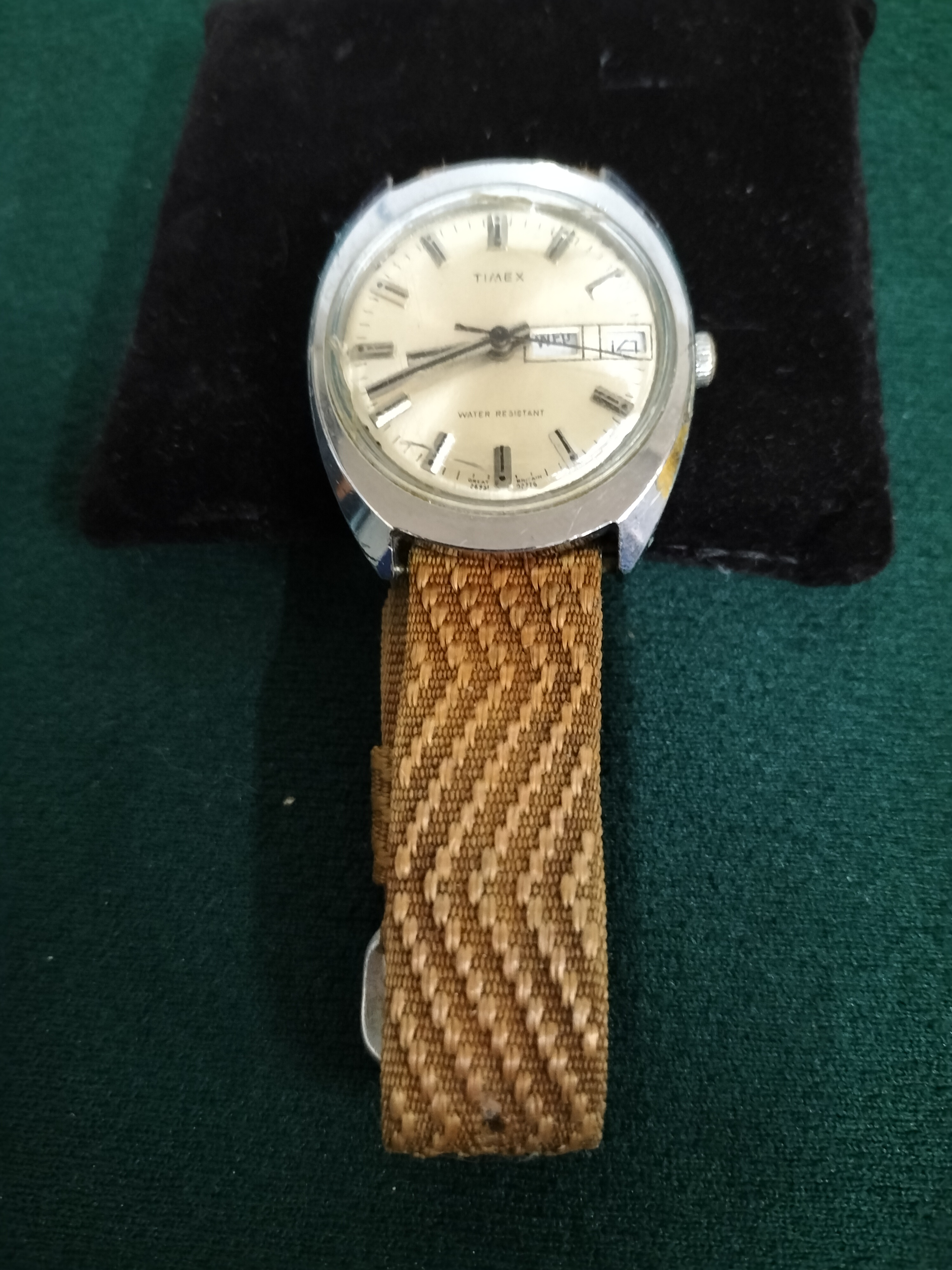 A silver-toned Timex wristwatch featuring a champagne dial with day-date display, marked Great Britain, on a brown woven strap.