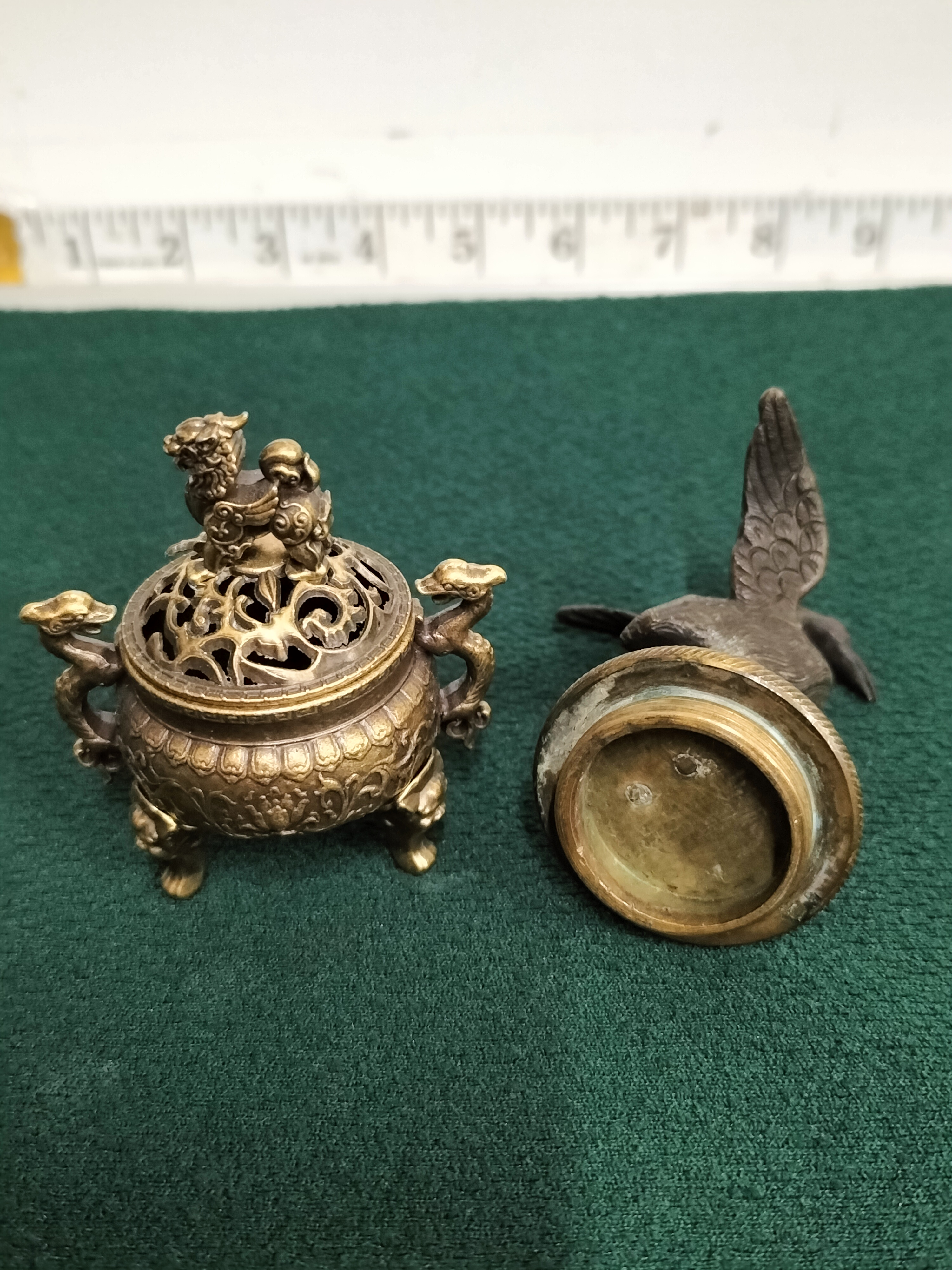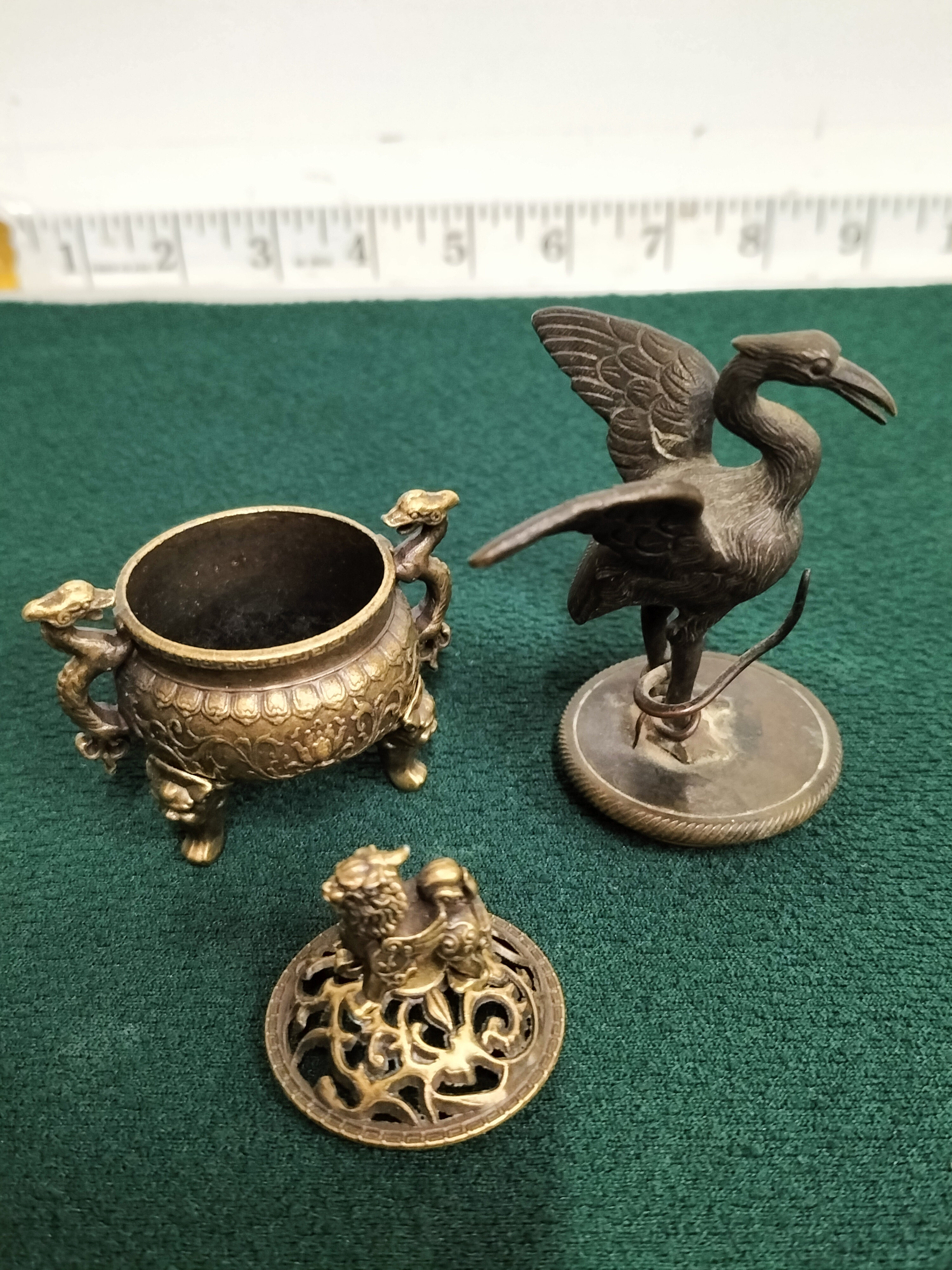 Two decorative metal objects of Asian influence. The first is a cast brass incense burner, or censer, comprising a globular body decorated with floral and scrollwork motifs in high relief. The vessel is supported by three beast-mask tripod feet and features two dragon-head handles. It includes a removable reticulated lid with scrollwork piercing, topped with a Shishi finial. The second item is a cast Bronzel figurine of a crane or heron with outspread wings, standing on a circular base with a serpent-like form at the feet. Neither item displays visible maker’s marks or signatures.