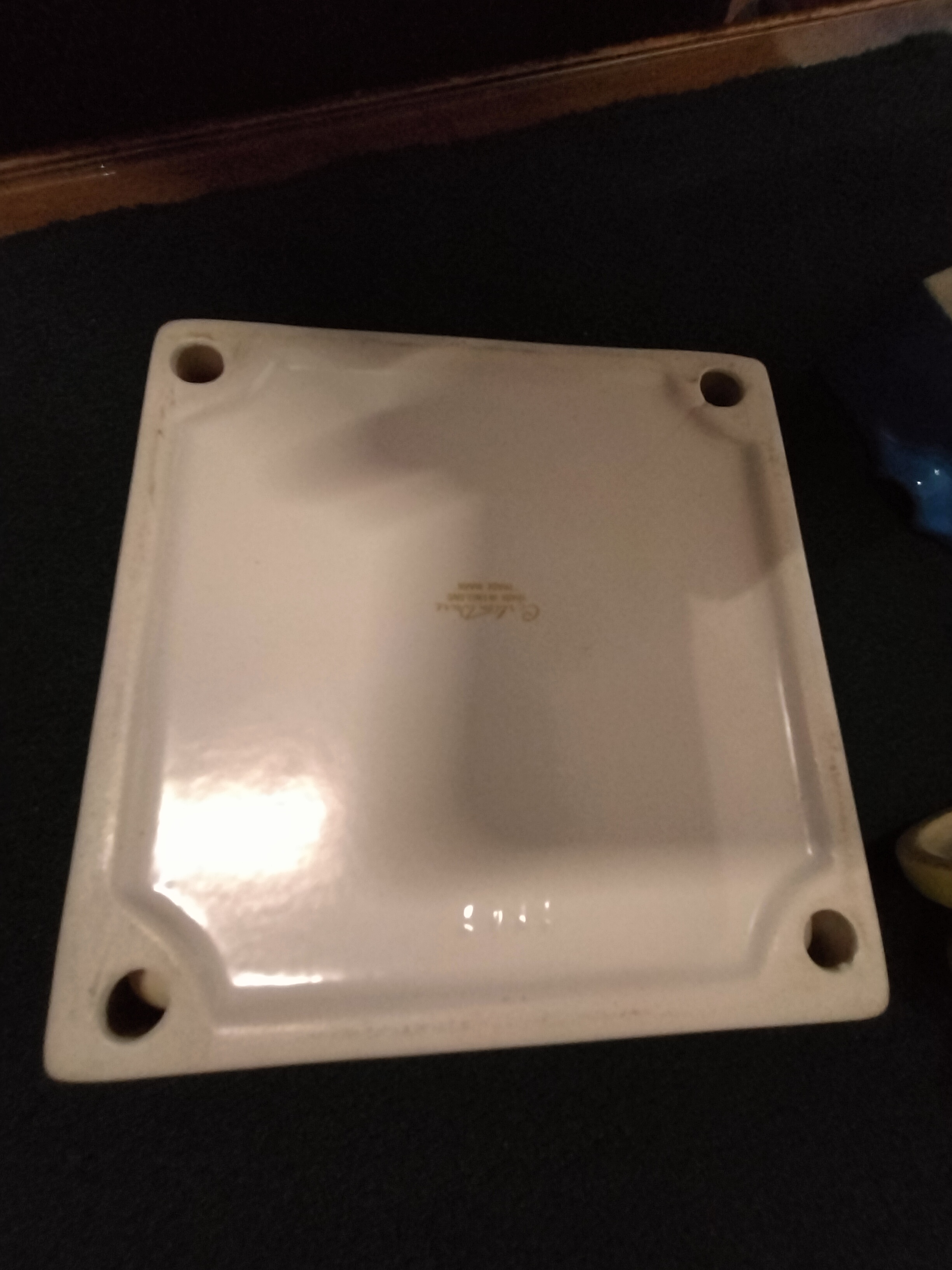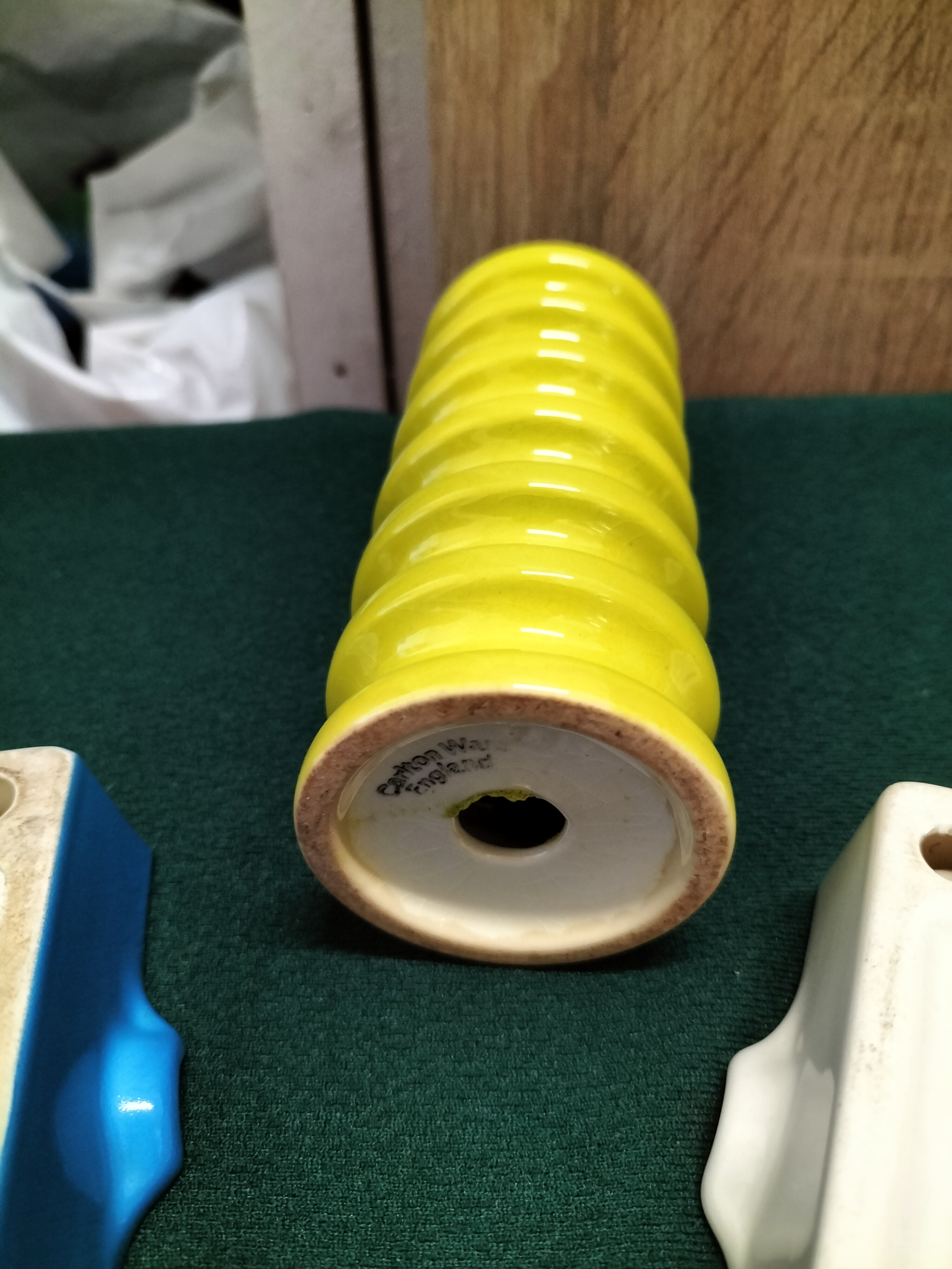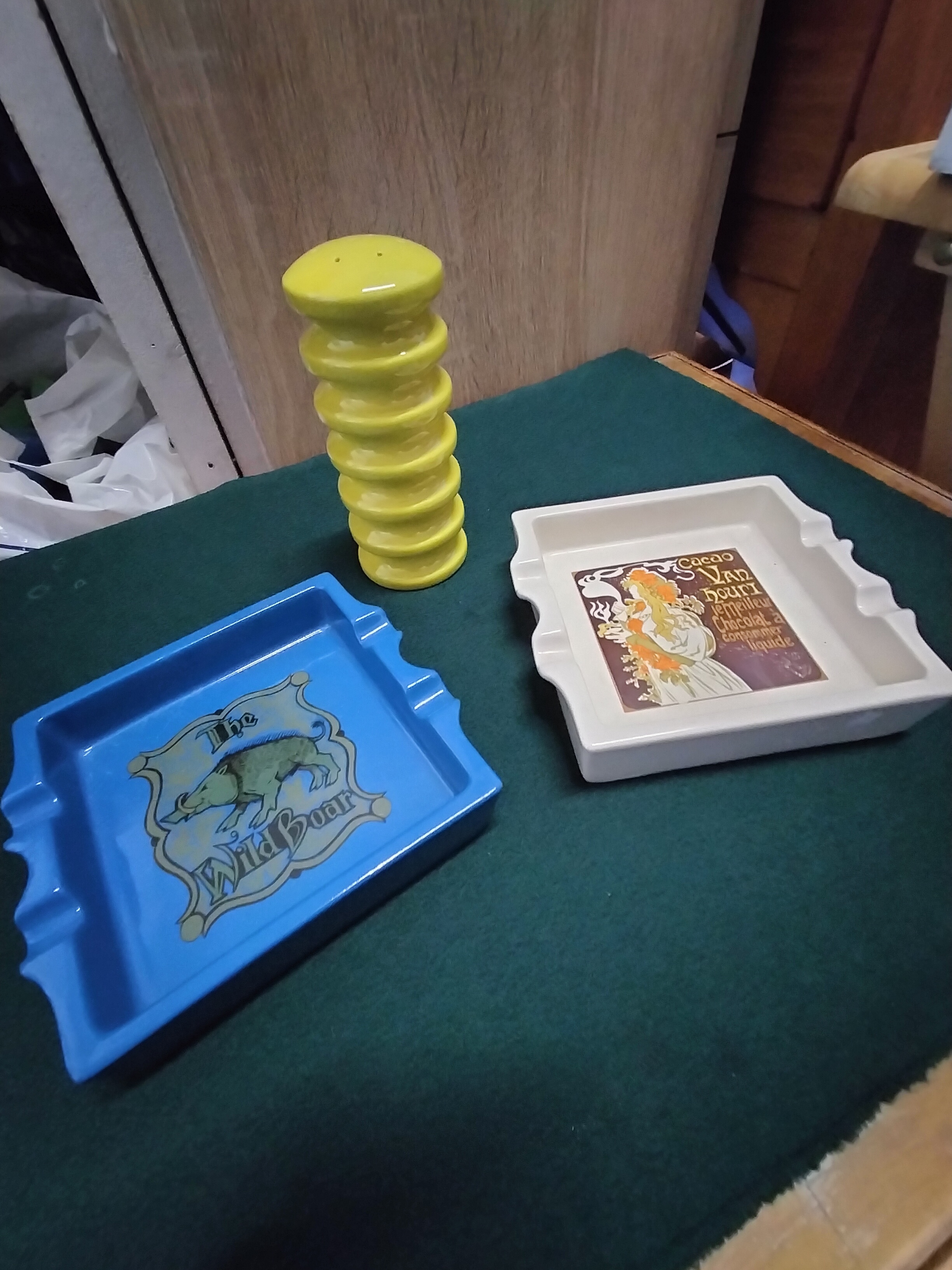 A trio of Carlton Ware comprising a blue ashtray with The Wild Boar graphic, a white Cacao Van Houten advertising ashtray, and a yellow ridged shaker marked Carlton Ware England to the base.