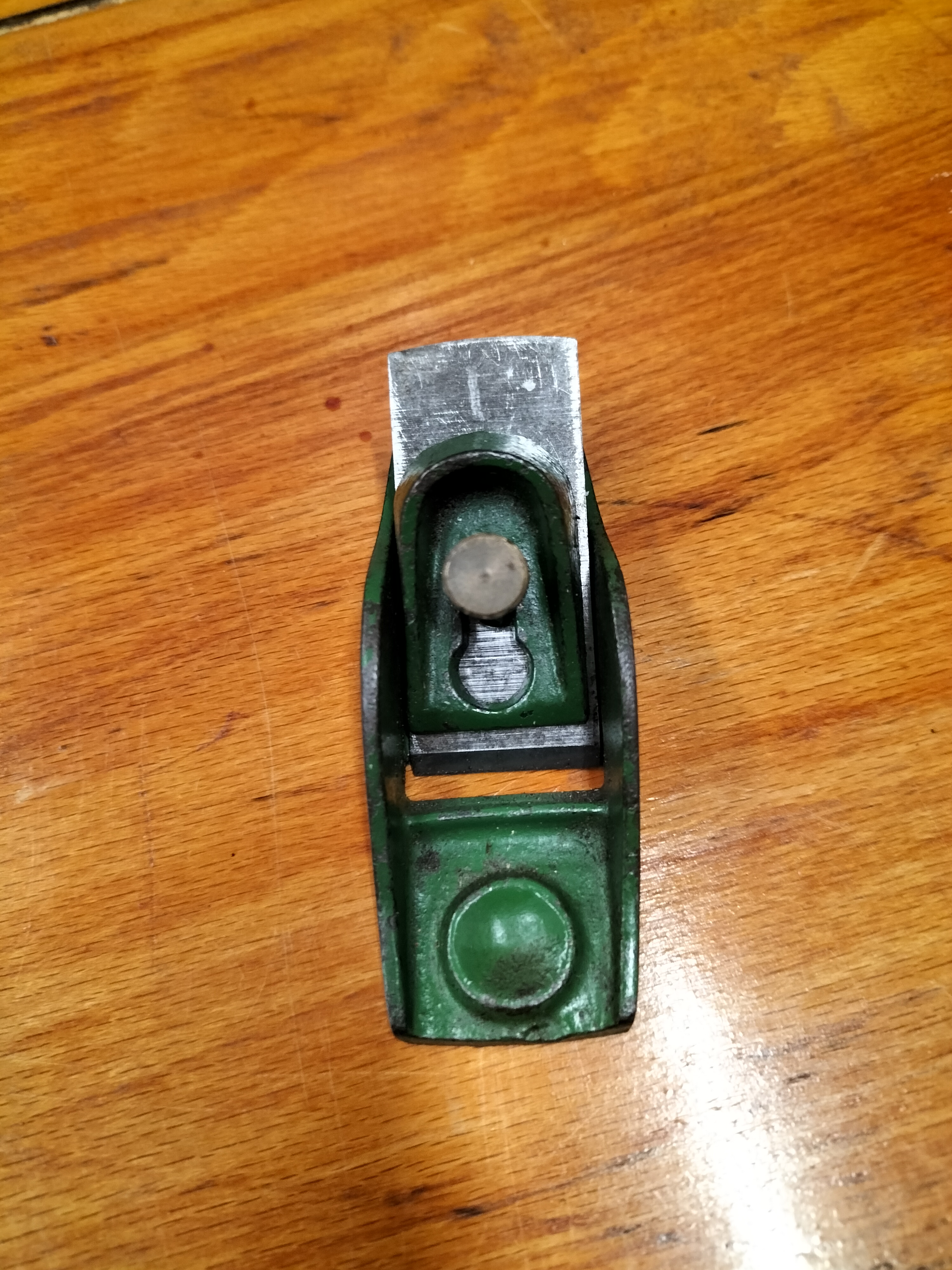 A small hand-held block plane featuring a green-painted cast metal body and a silver-toned metal blade.