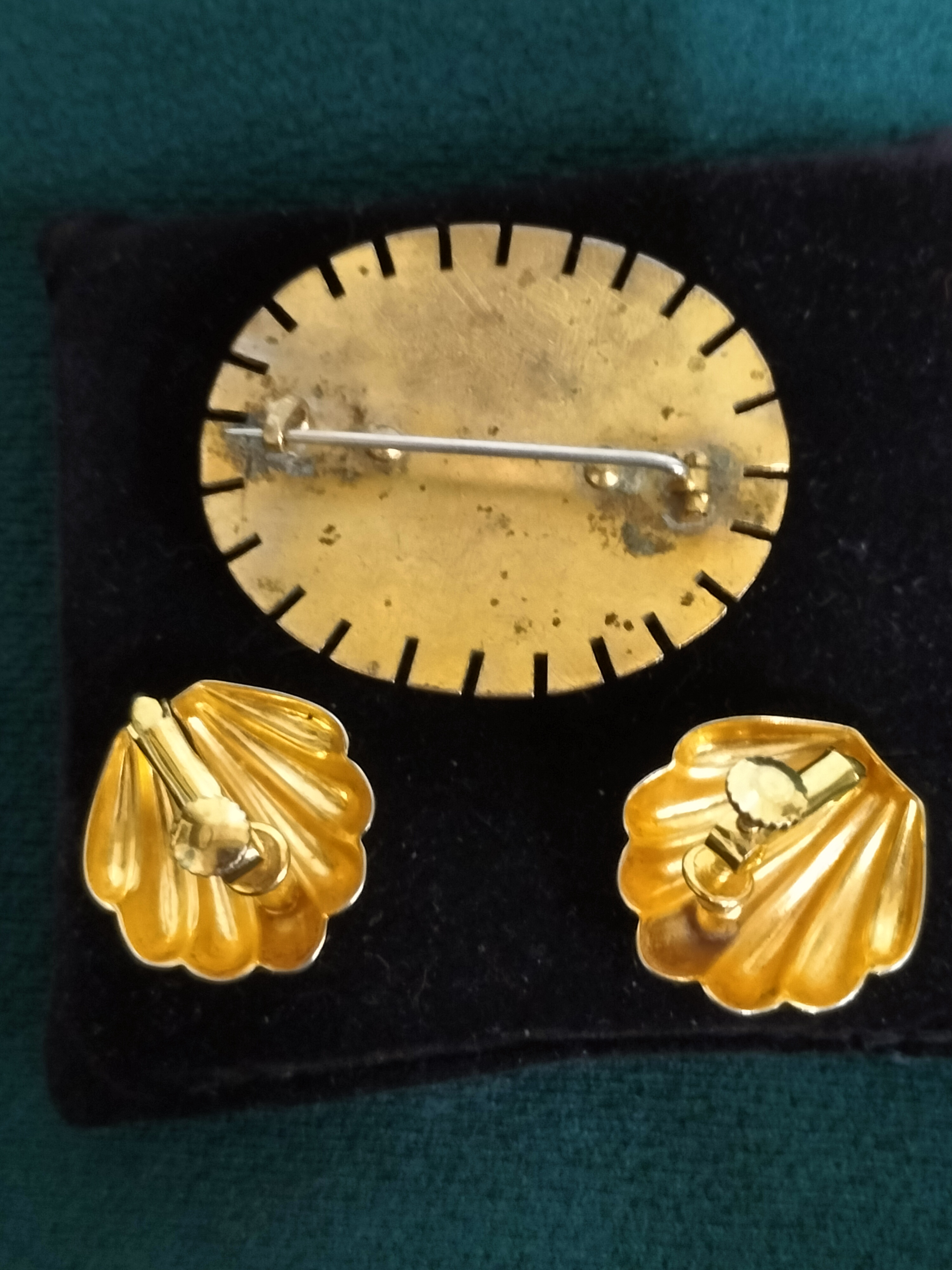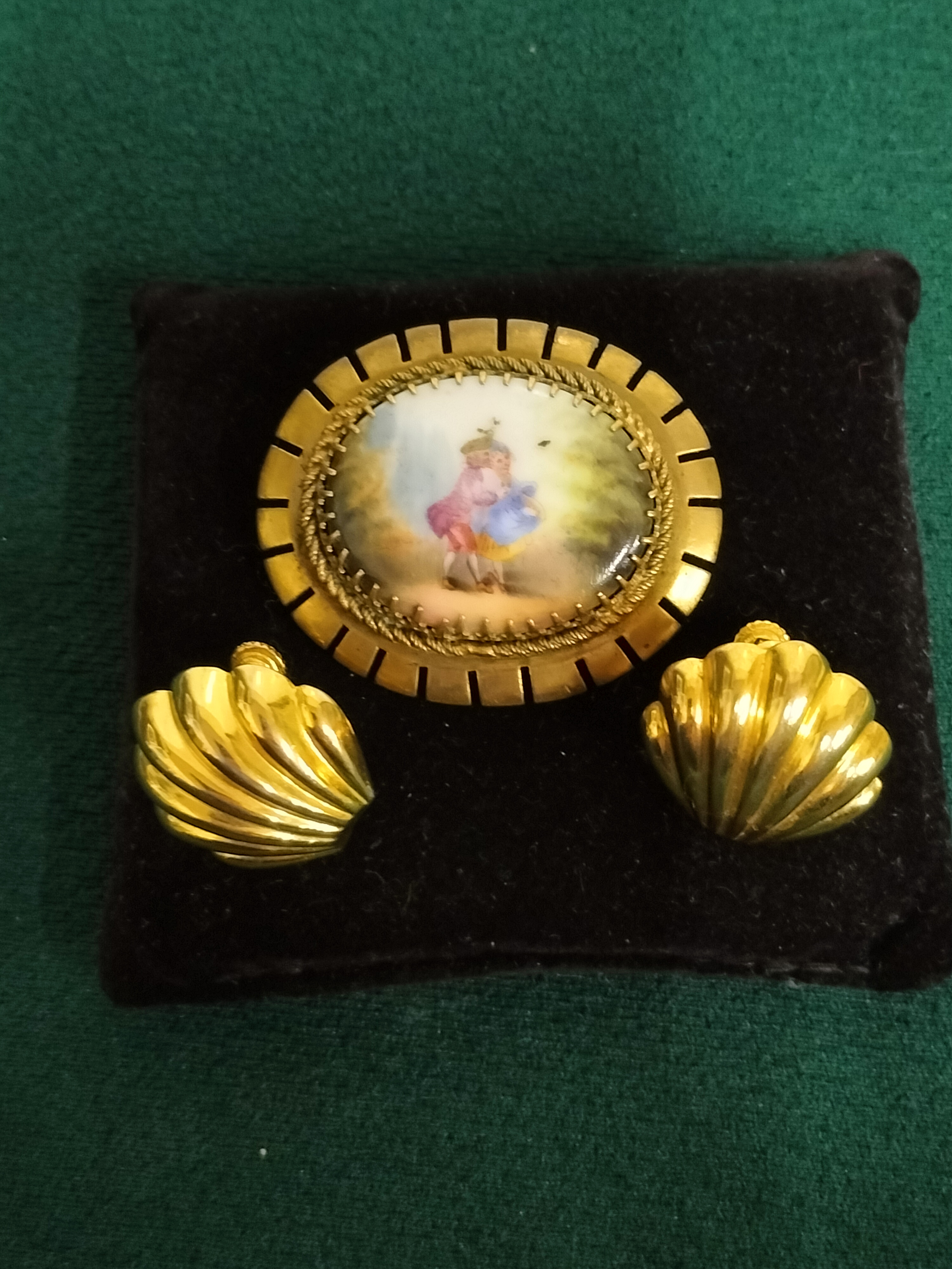 A trio of gold-toned jewellery comprising an oval brooch featuring a painted scene of a couple and shell-shaped earrings.