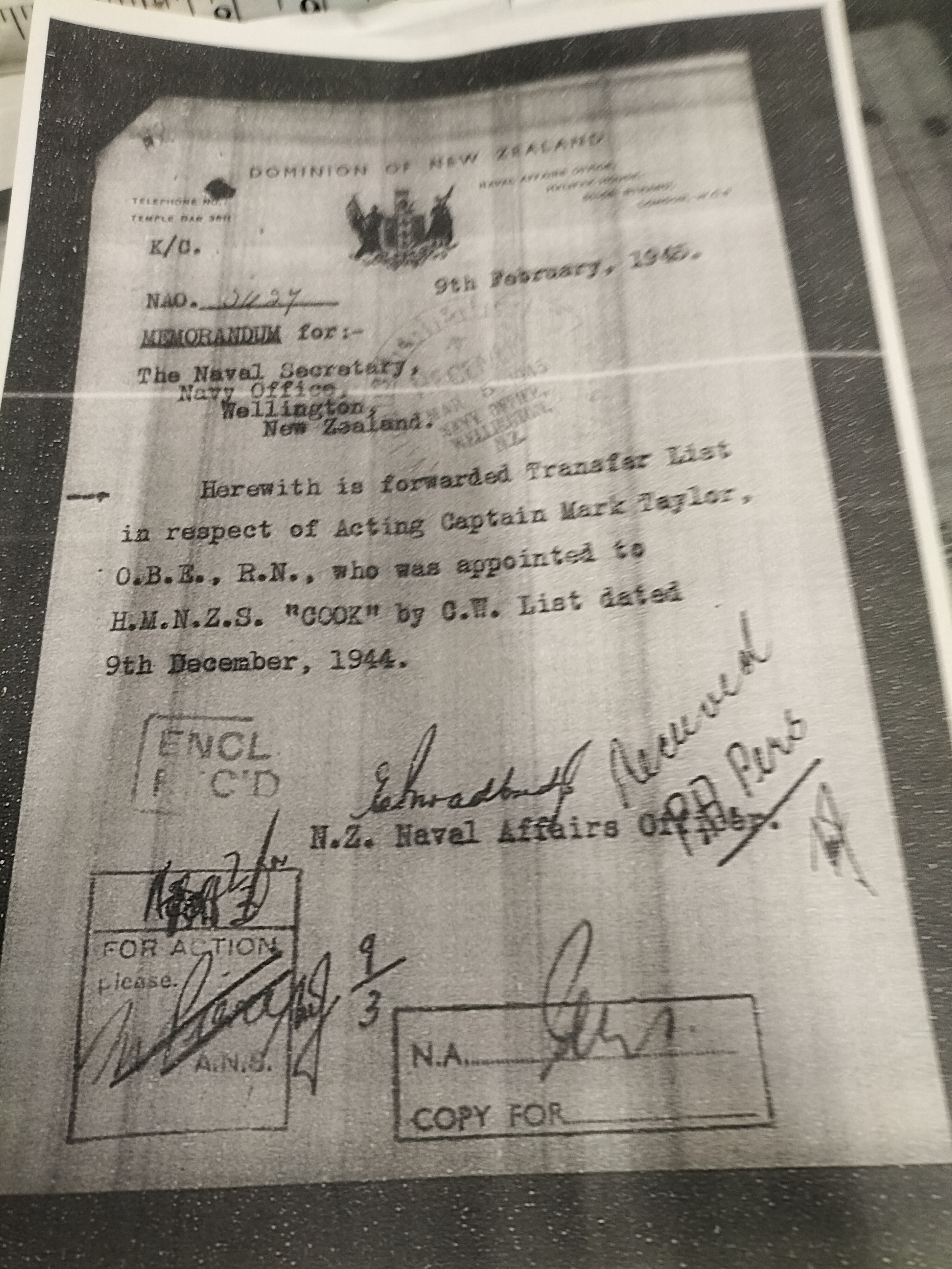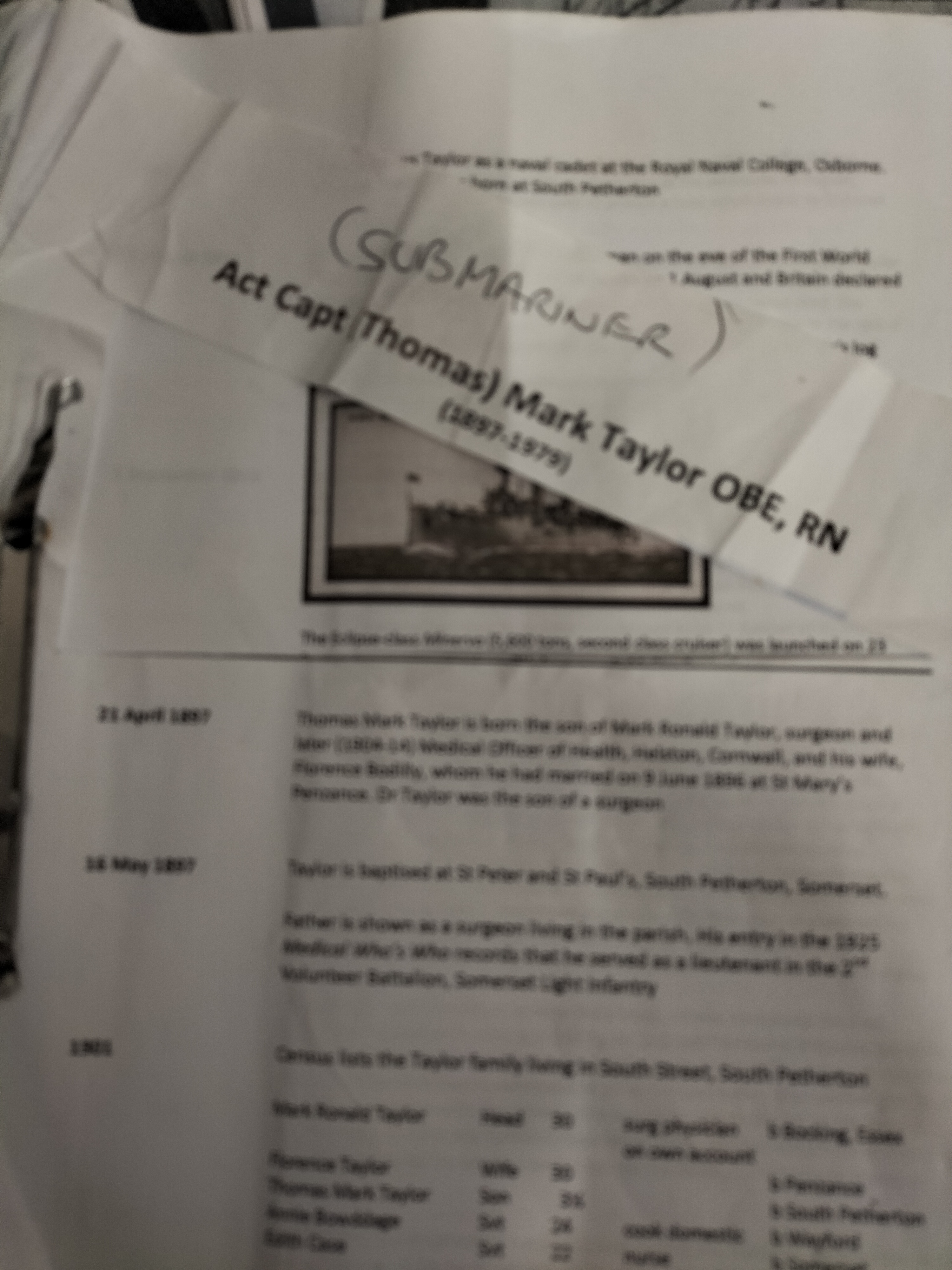 Seven silver and bronze-toned military medals with multi-coloured ribbons including an OBE, alongside naval service documents and research papers for Acting Captain Thomas Mark Taylor OBE, RN.