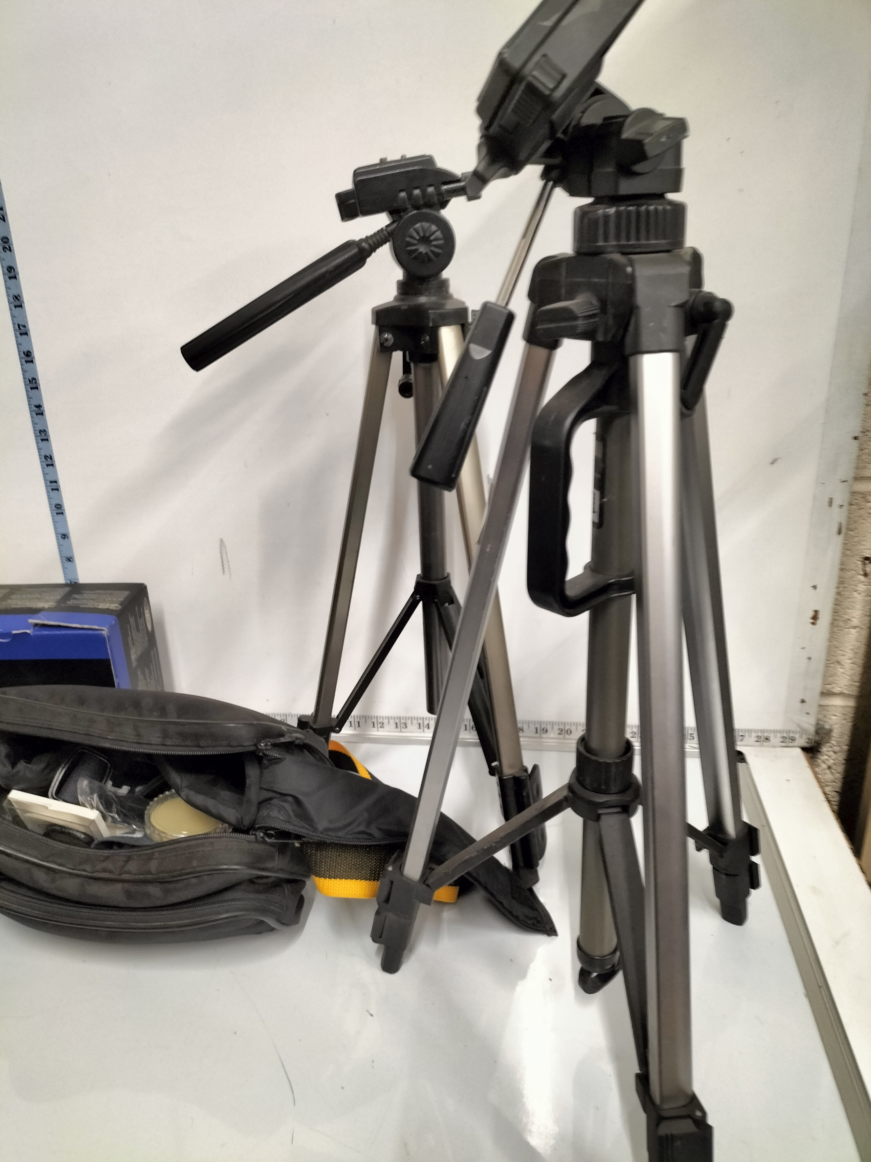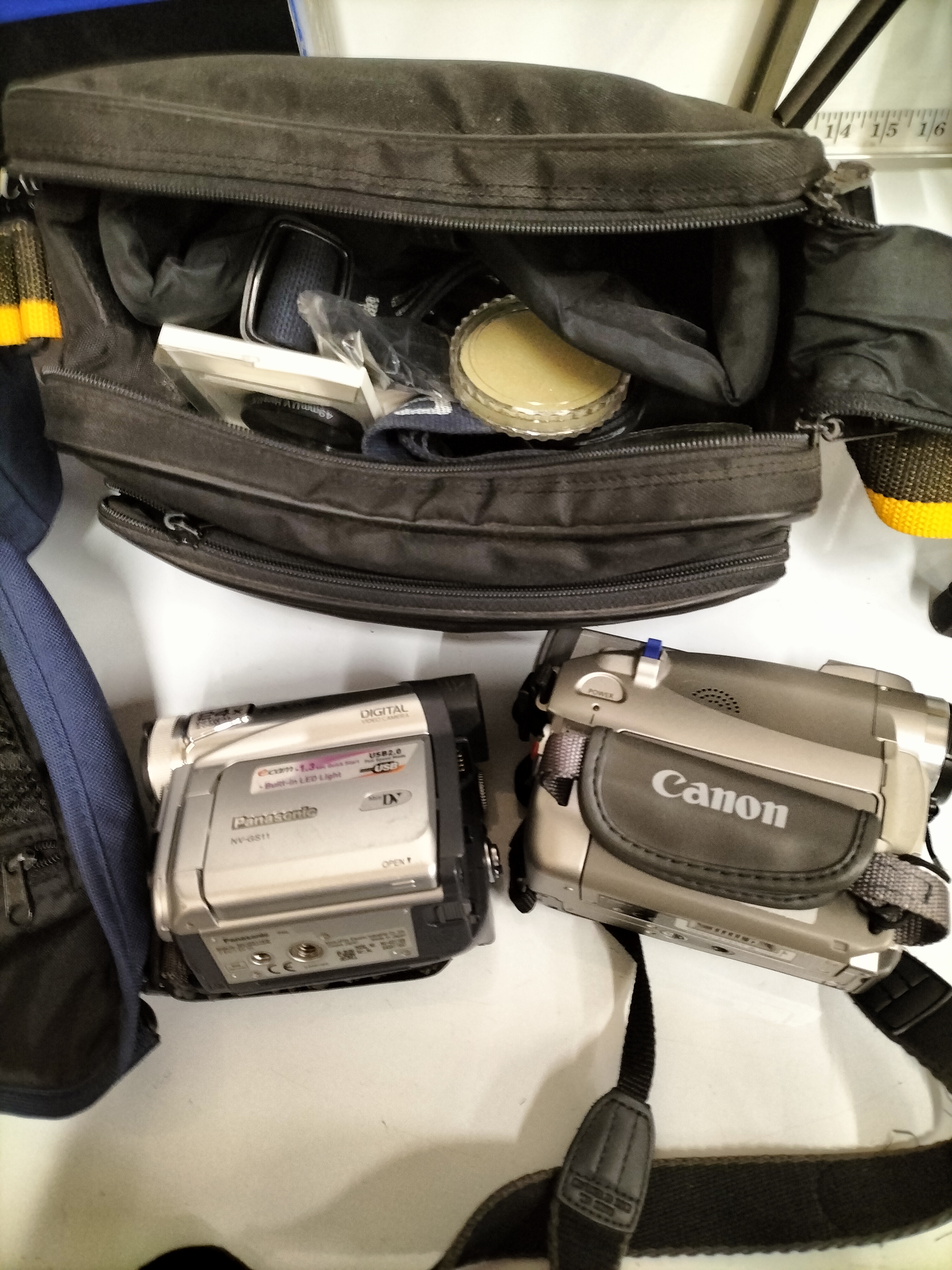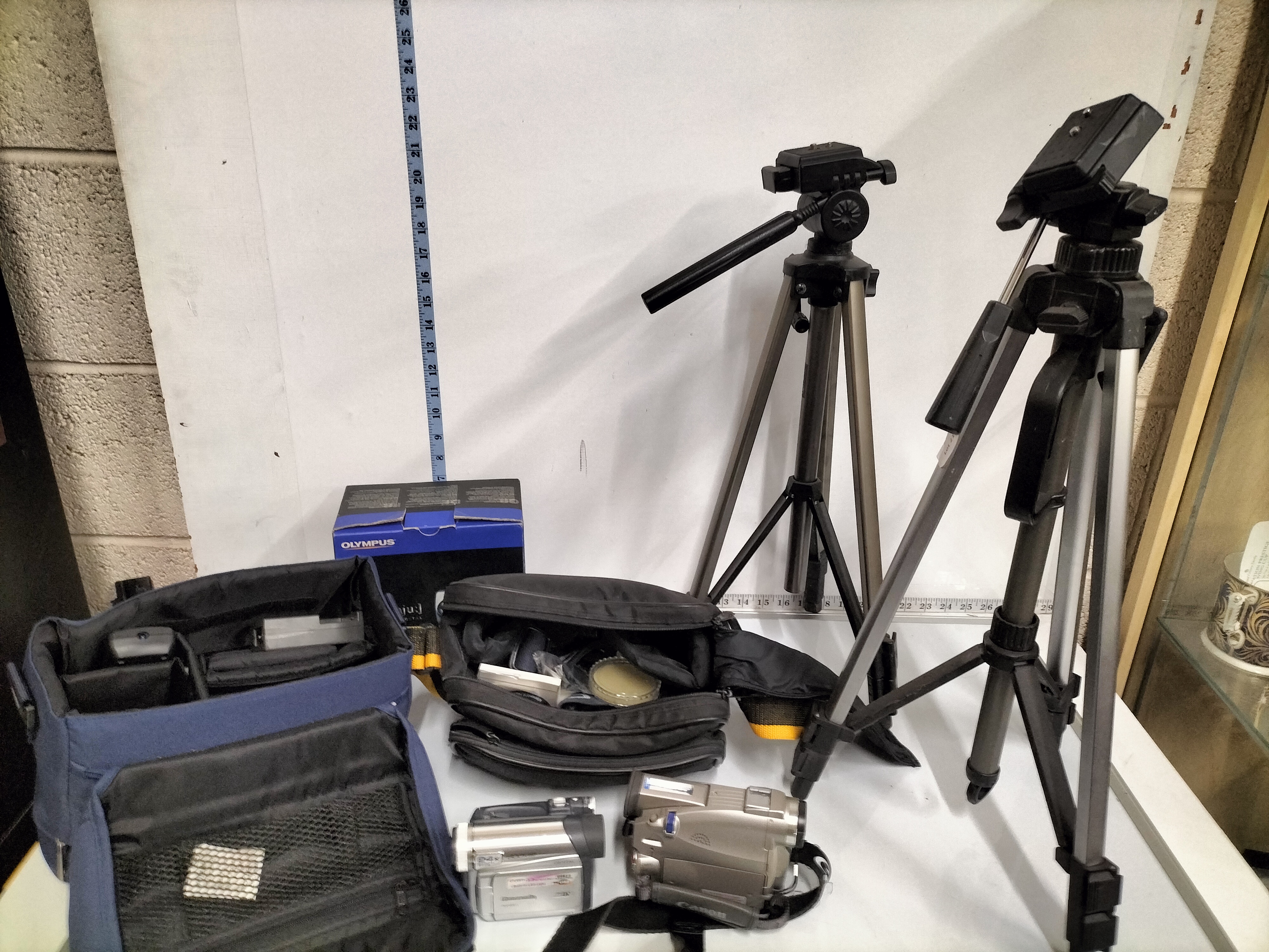 A collection of digital camcorders and cameras including an Olympus Stylus 300/400 with original box, two tripods measuring approximately 50cm to 60cm in height, several bags and various accessories.