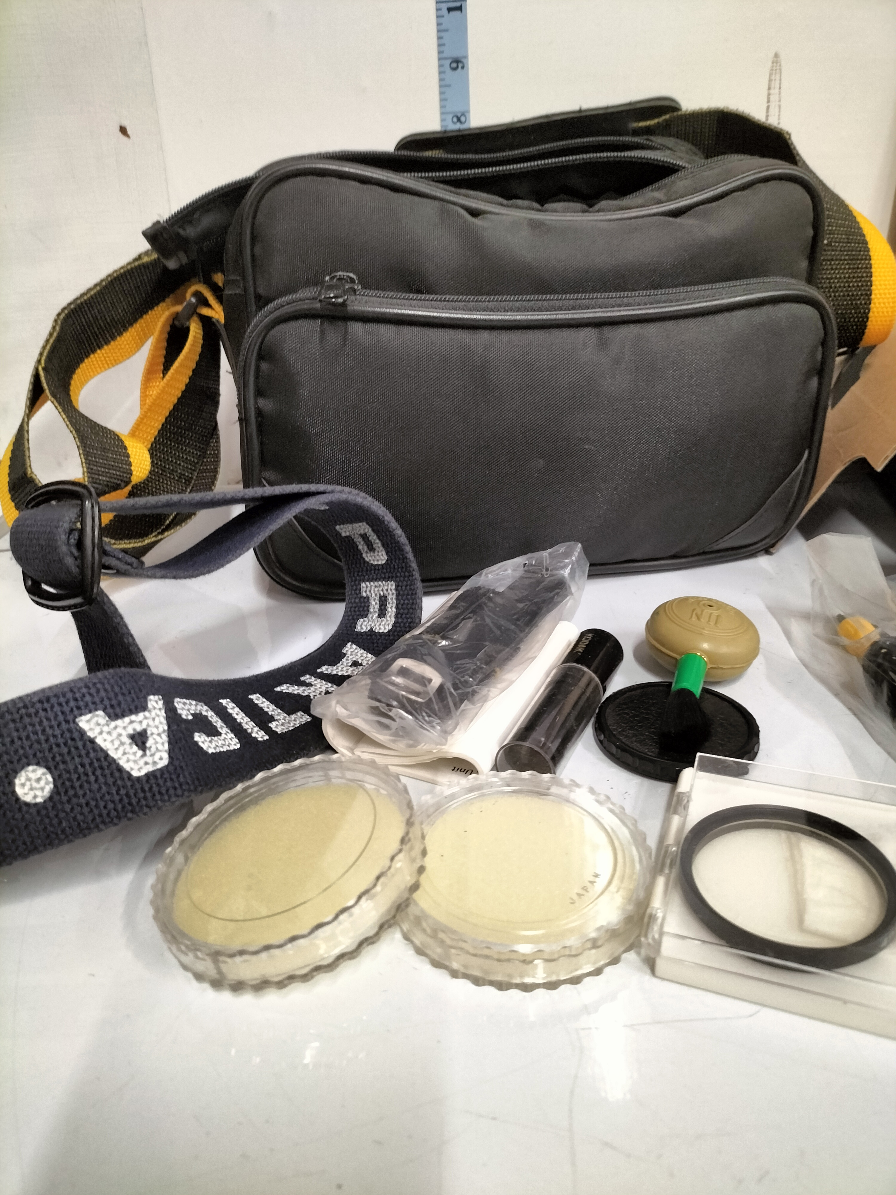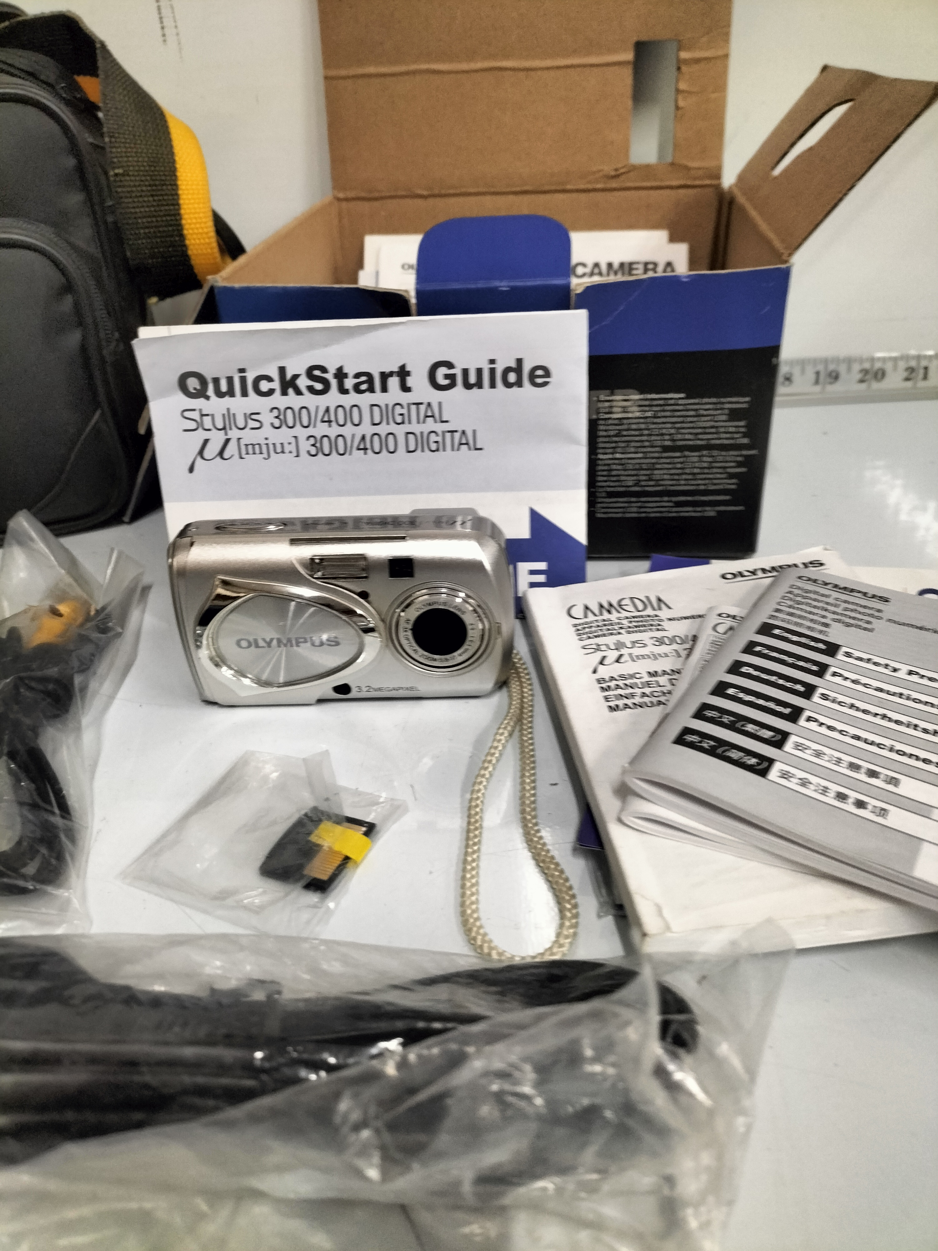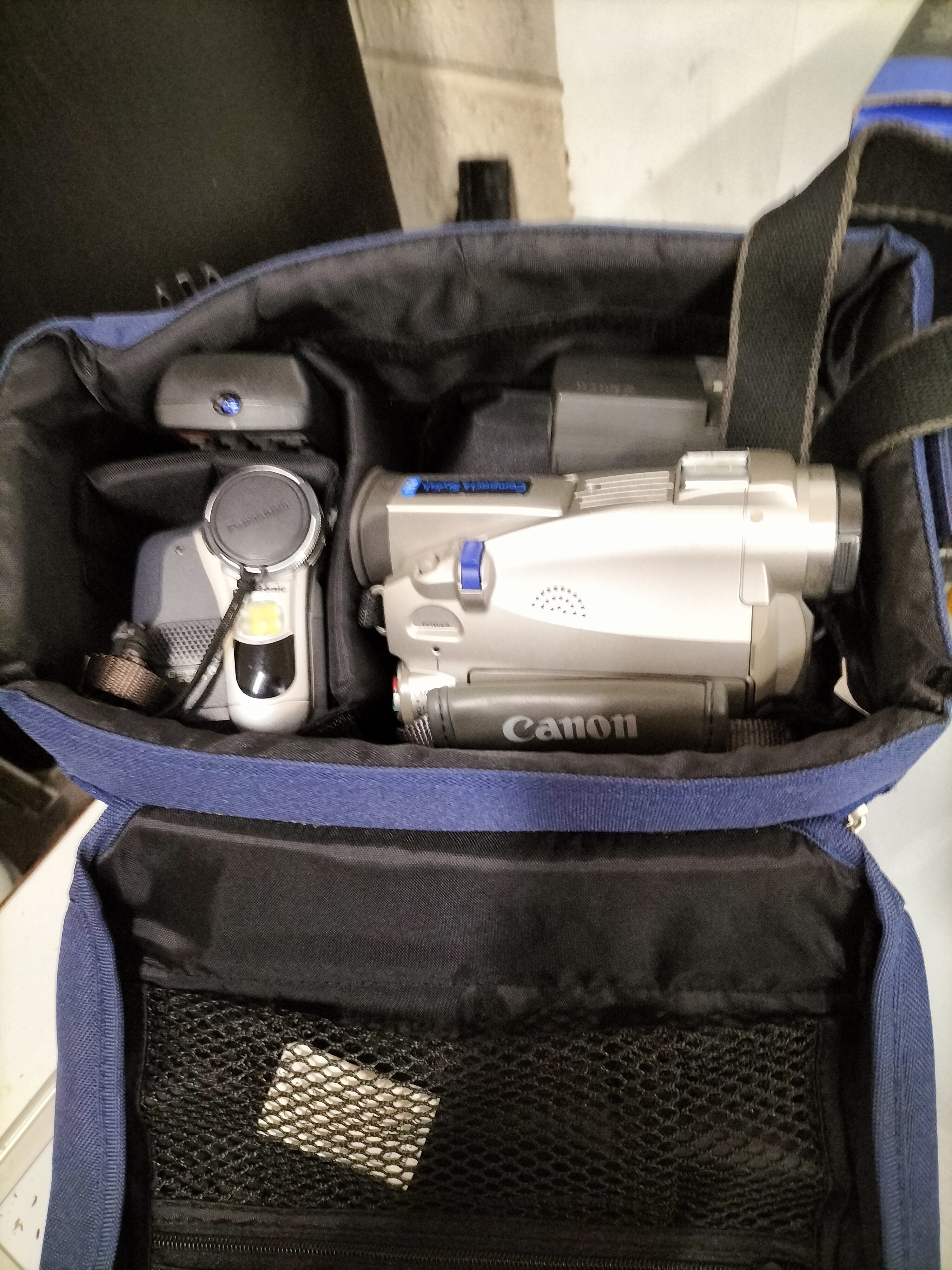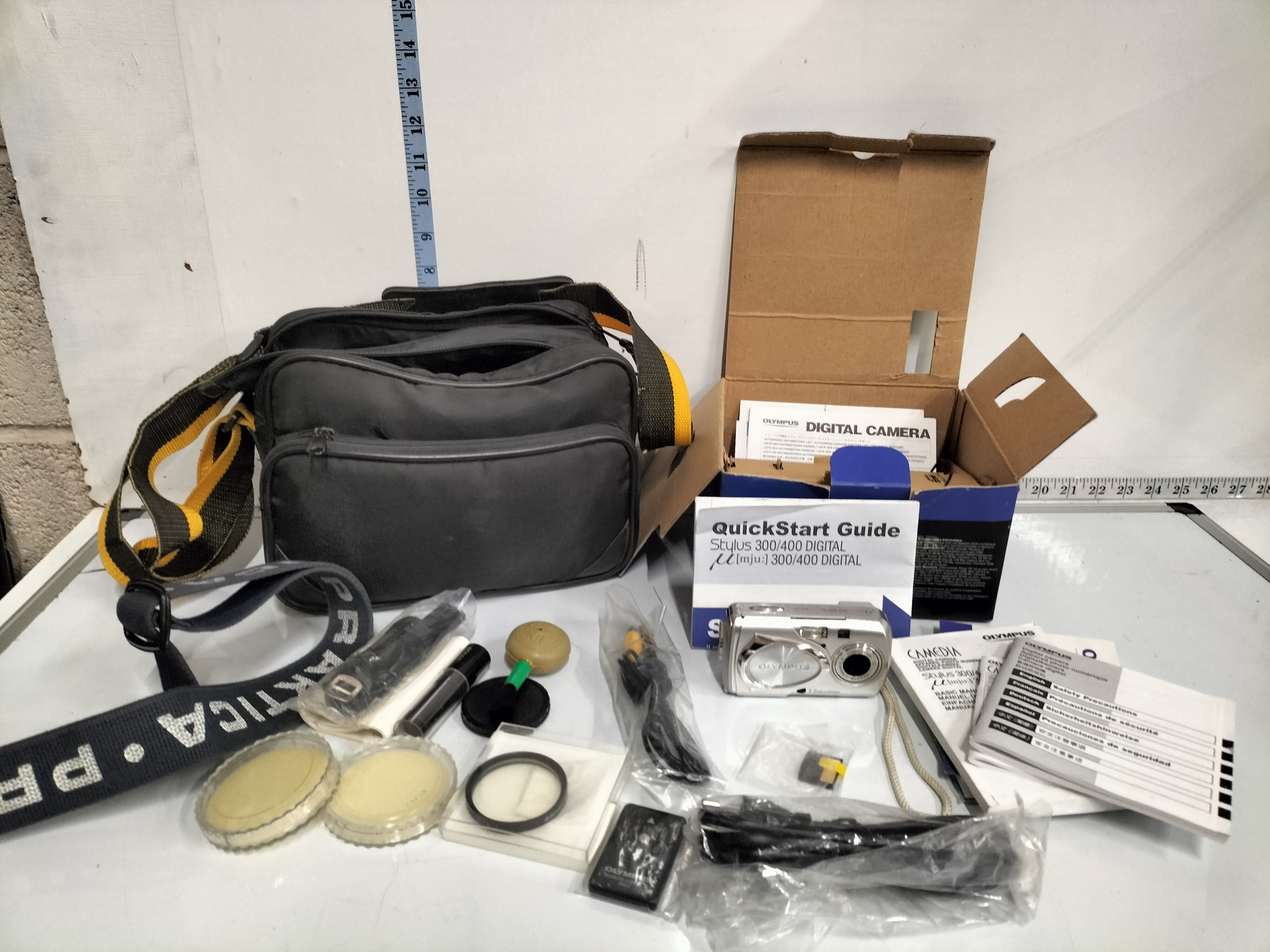 A collection of digital camcorders and cameras including an Olympus Stylus 300/400 with original box, two tripods measuring approximately 50cm to 60cm in height, several bags and various accessories.