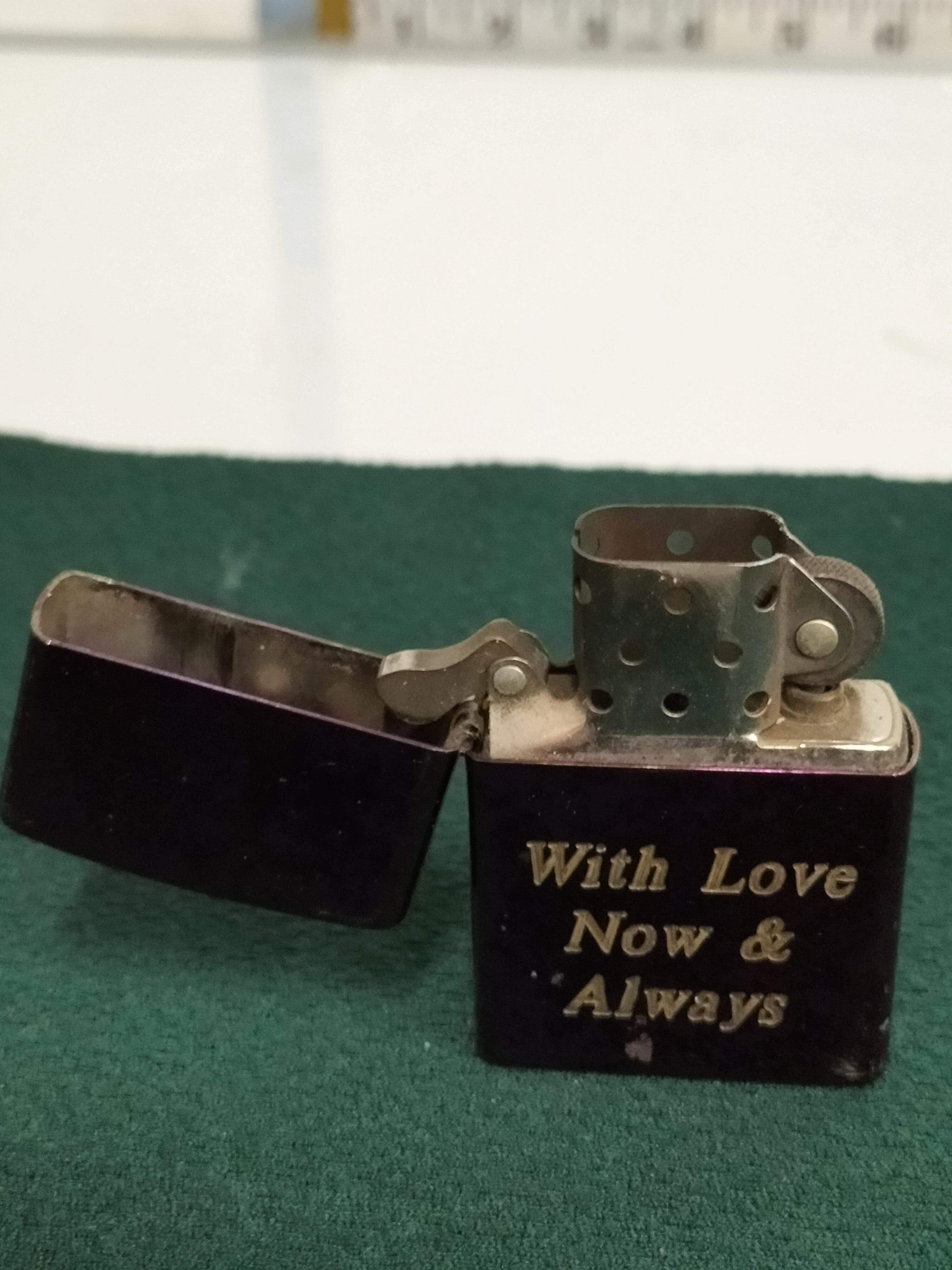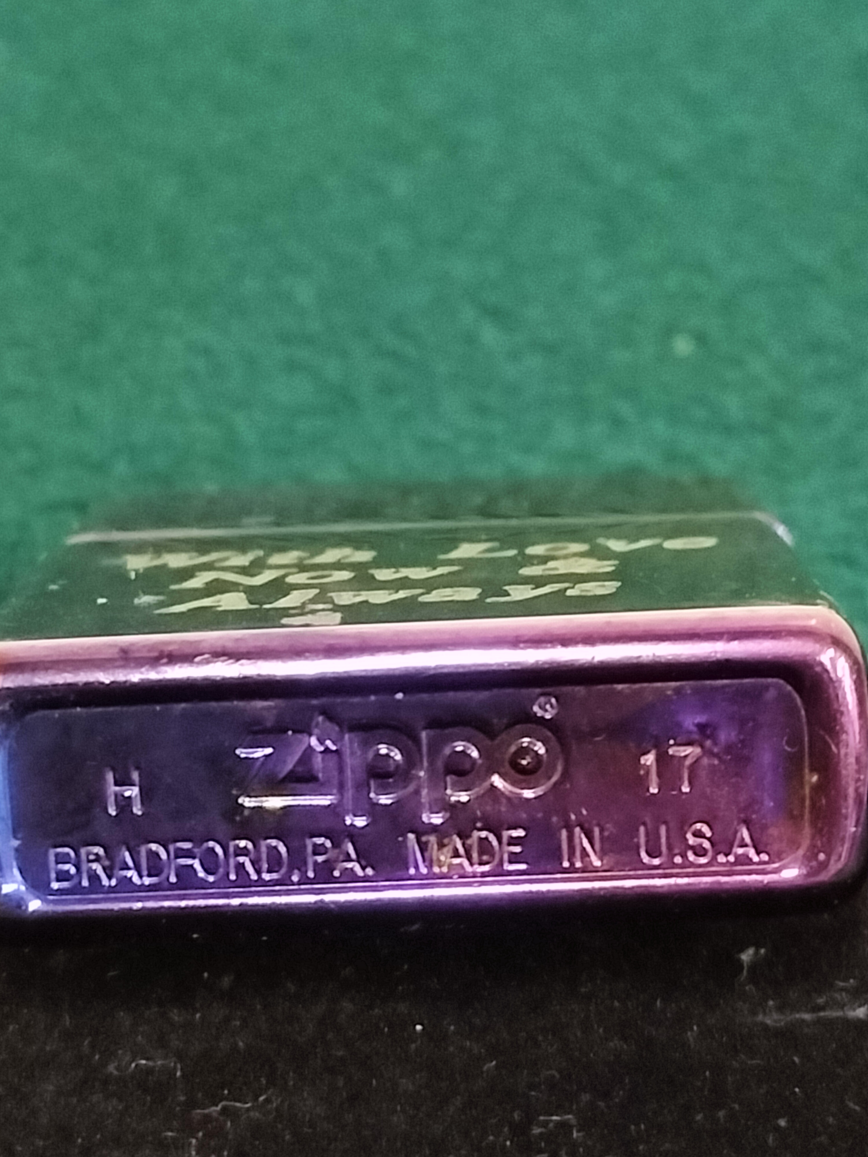 A purple Zippo windproof lighter featuring the engraved inscription With Love Now & Always and base markings H 17 Bradford, PA.