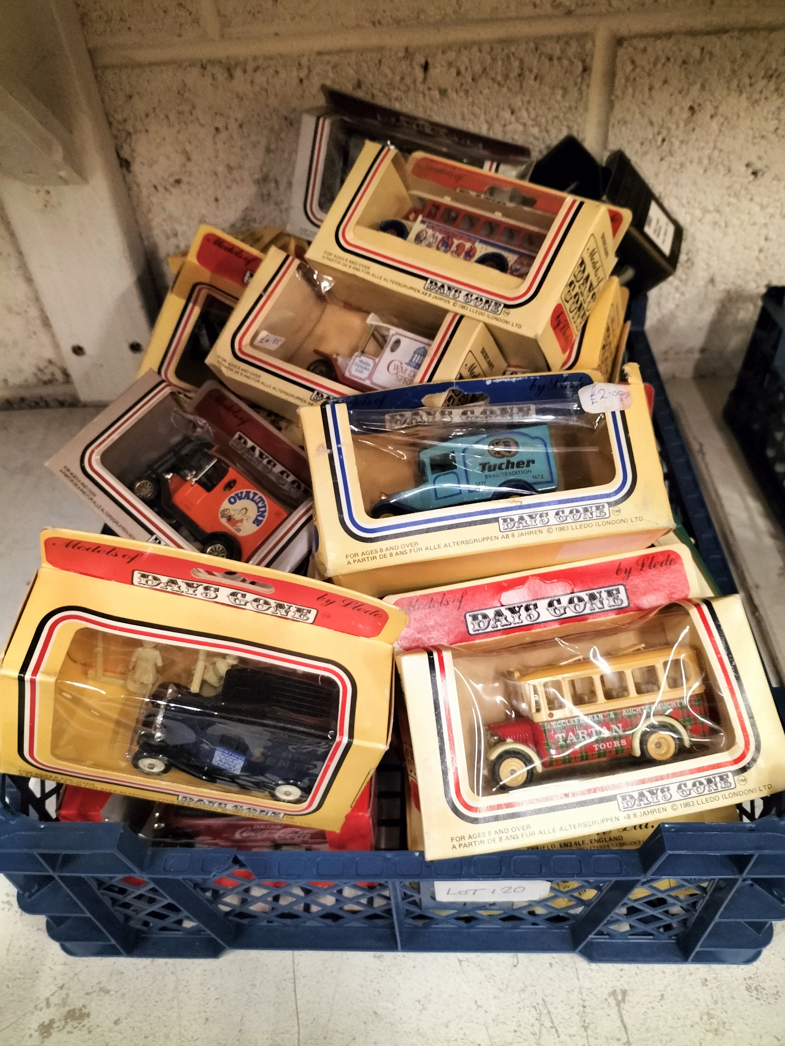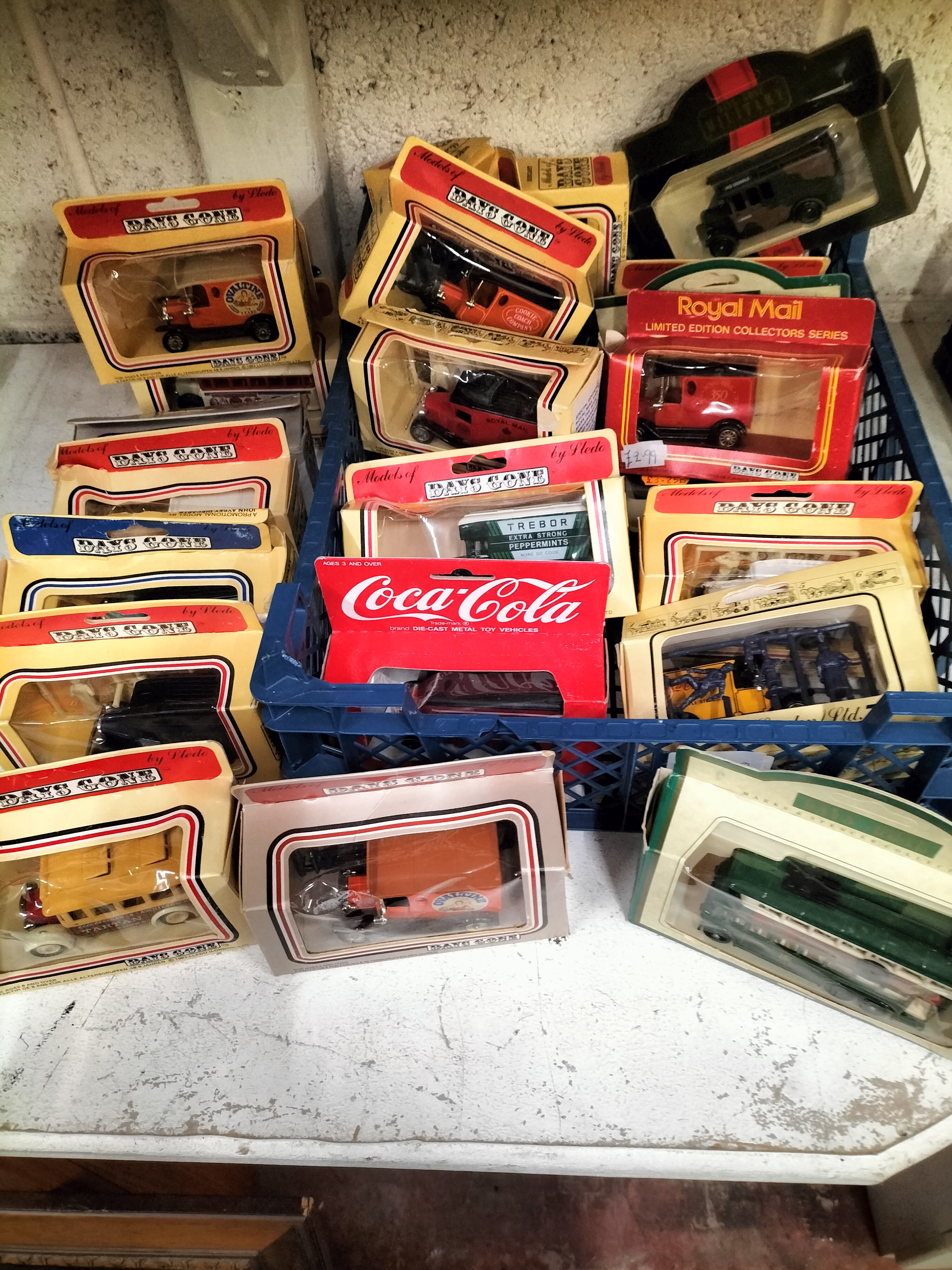 A collection of multi-coloured die-cast toy vehicles in original packaging, featuring various liveries including Coca-Cola, Royal Mail, Ovaltine, and Tartan Tours.