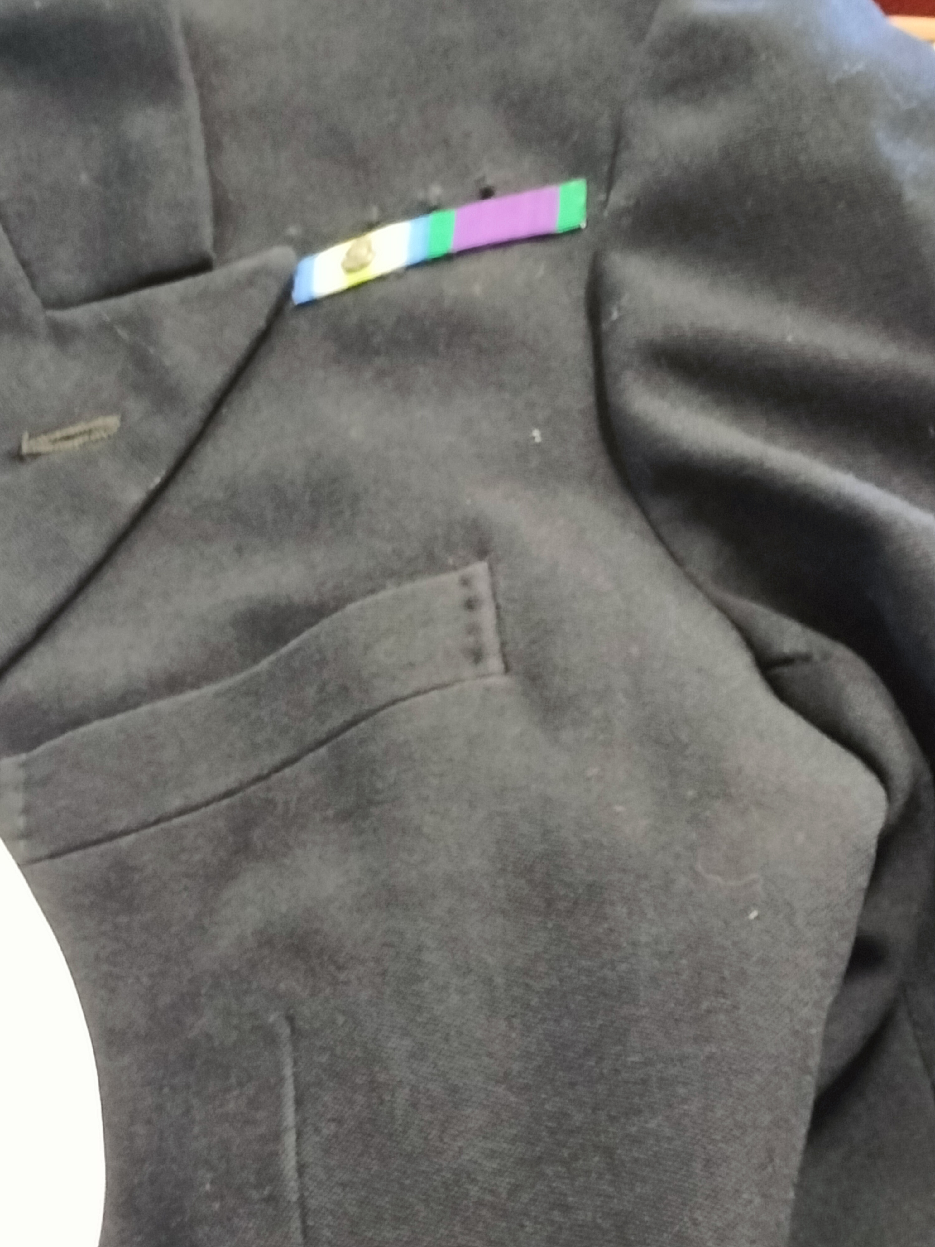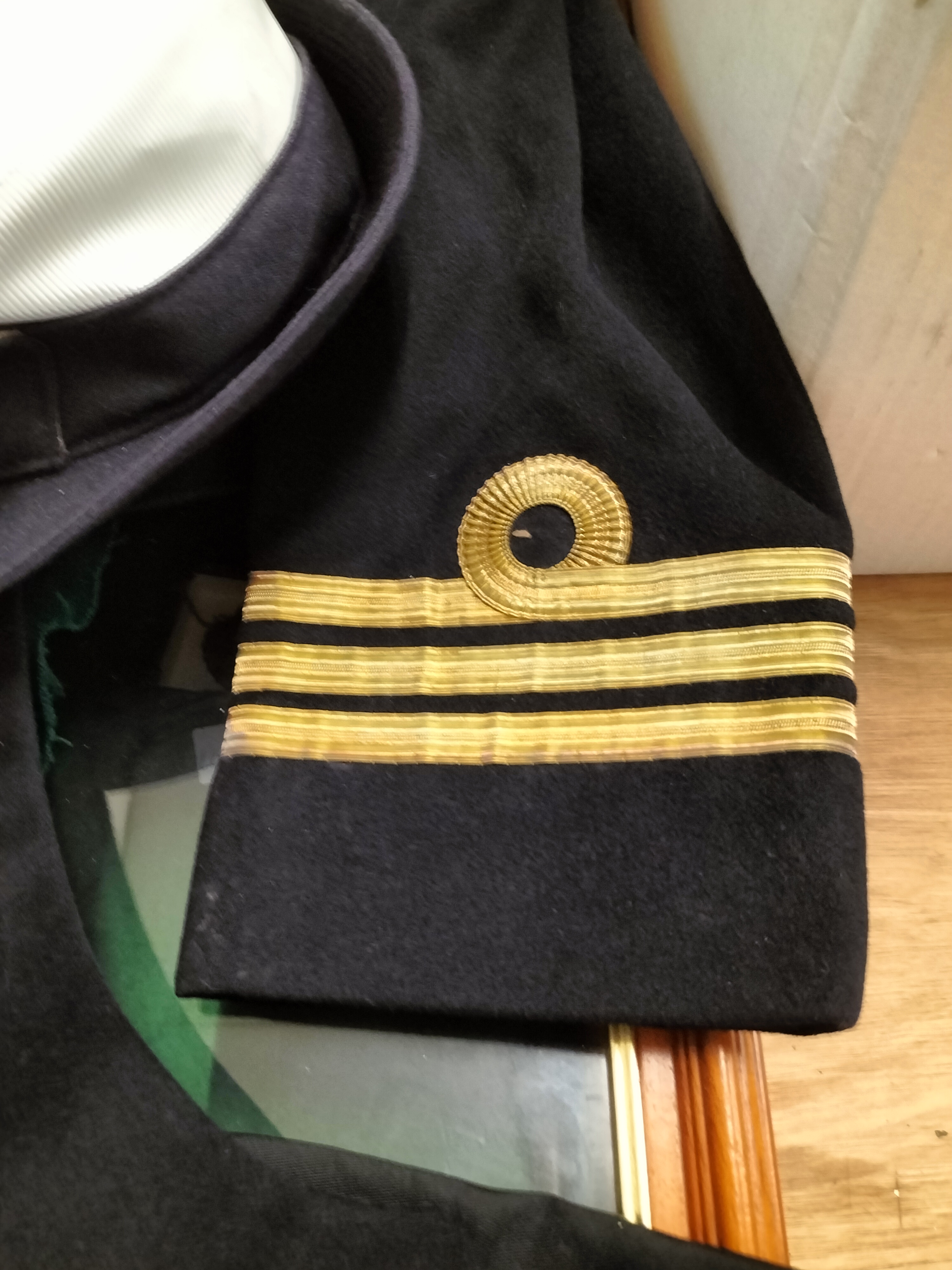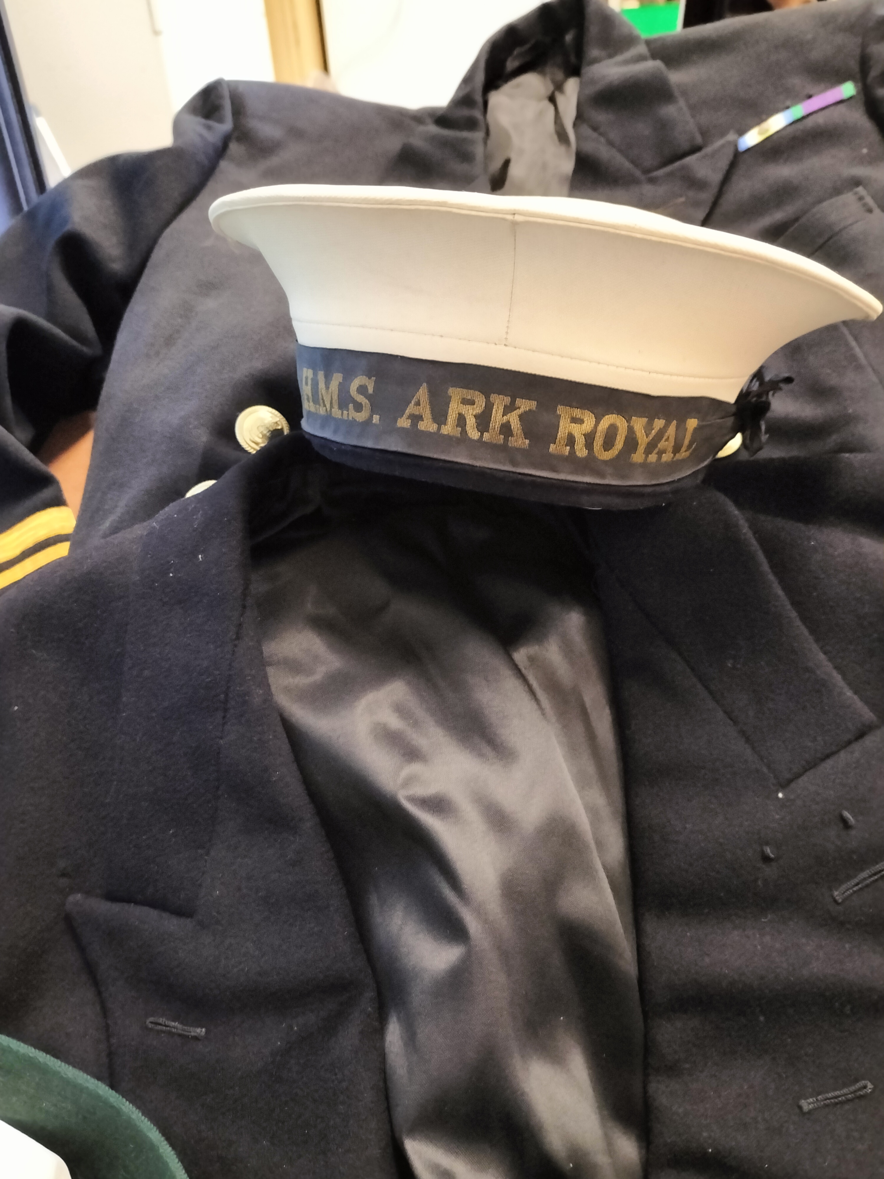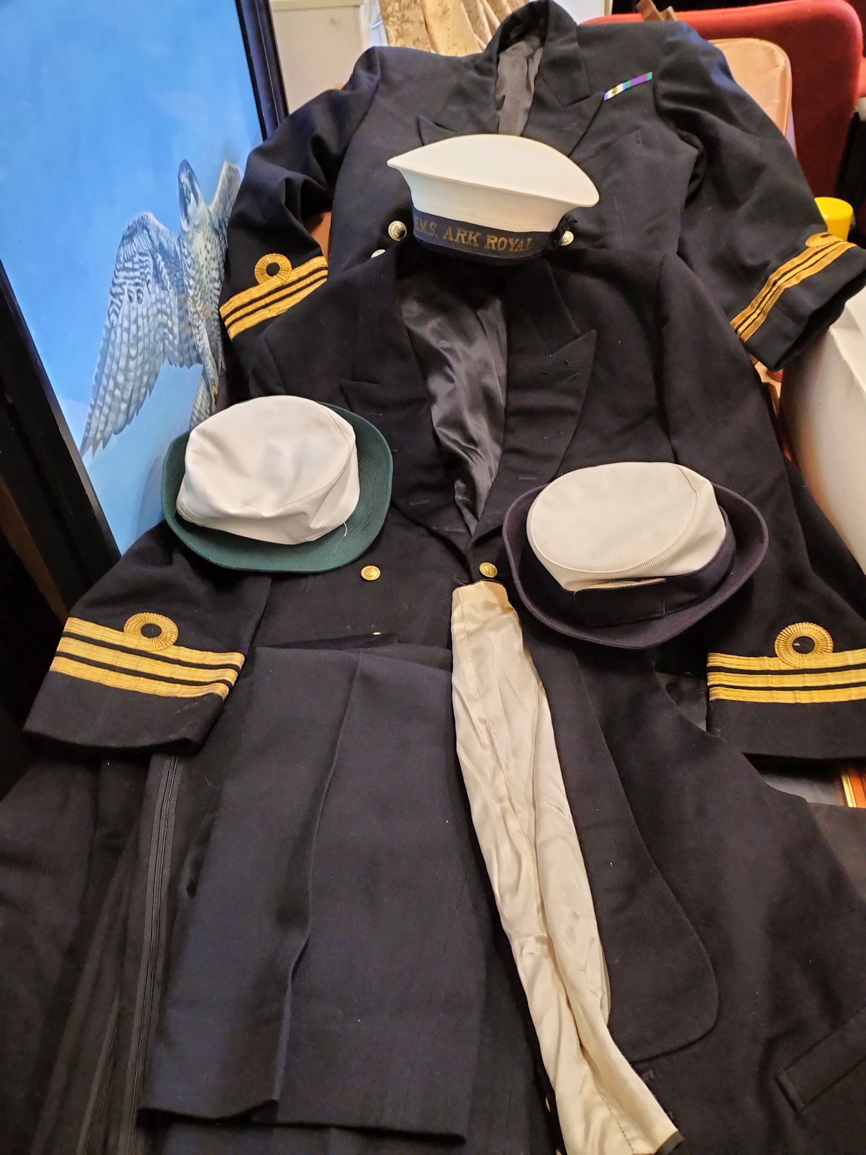 A collection of navy blue British Royal Navy officer uniform items including jackets with gold rank braid, trousers, and three hats, one featuring an H.M.S. Ark Royal tally.