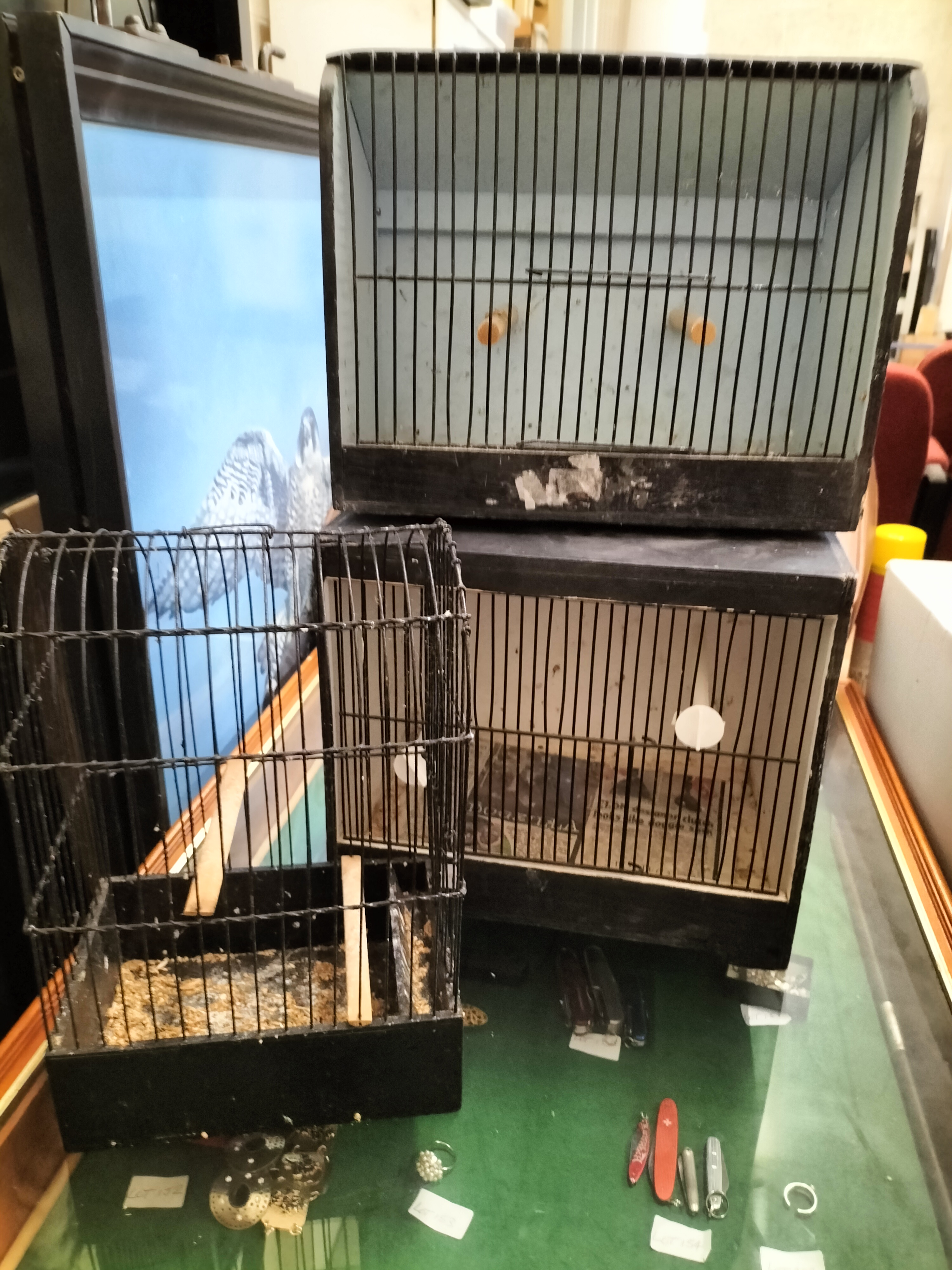 A collection comprising three black painted bird cages, multiple pocket knives including a Swiss Army brand tool, metal ornaments, and a ring.