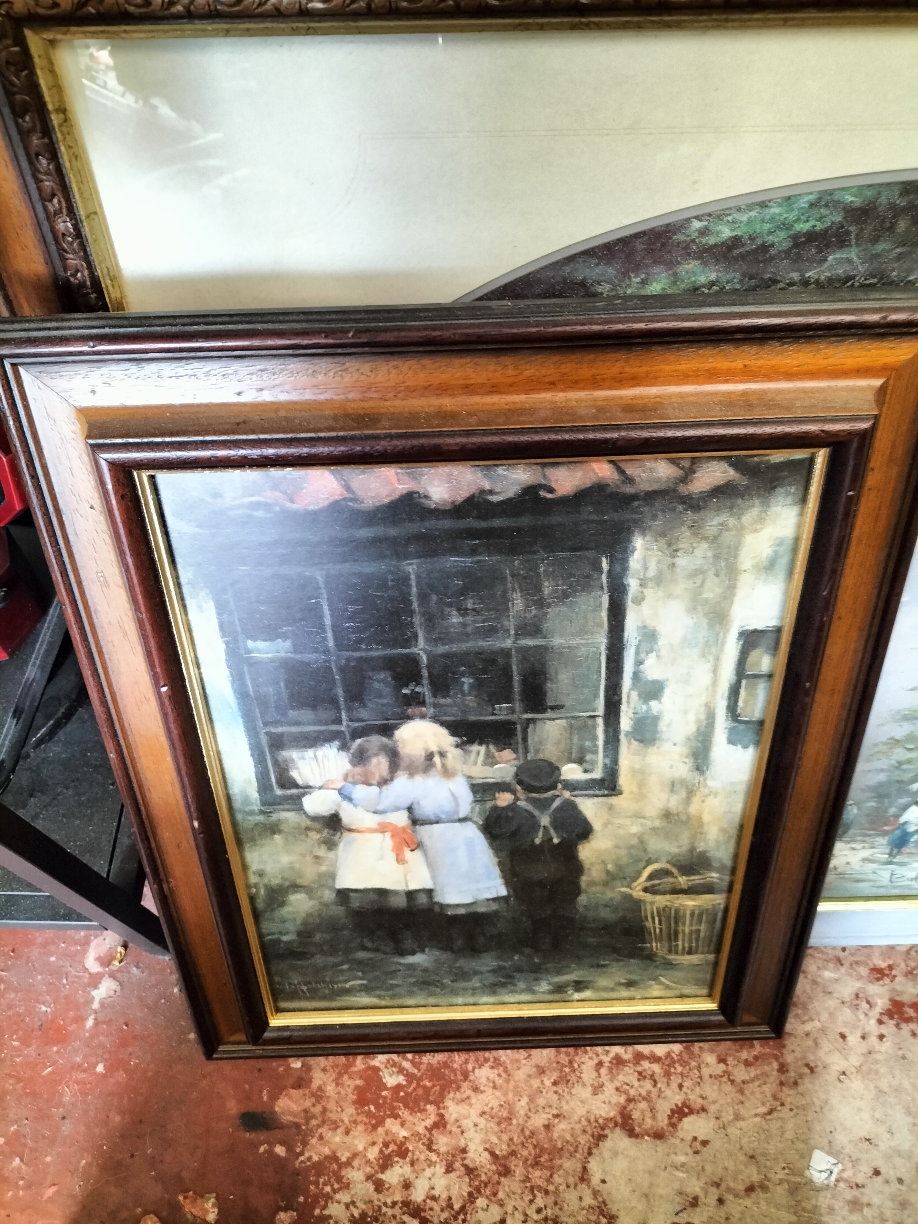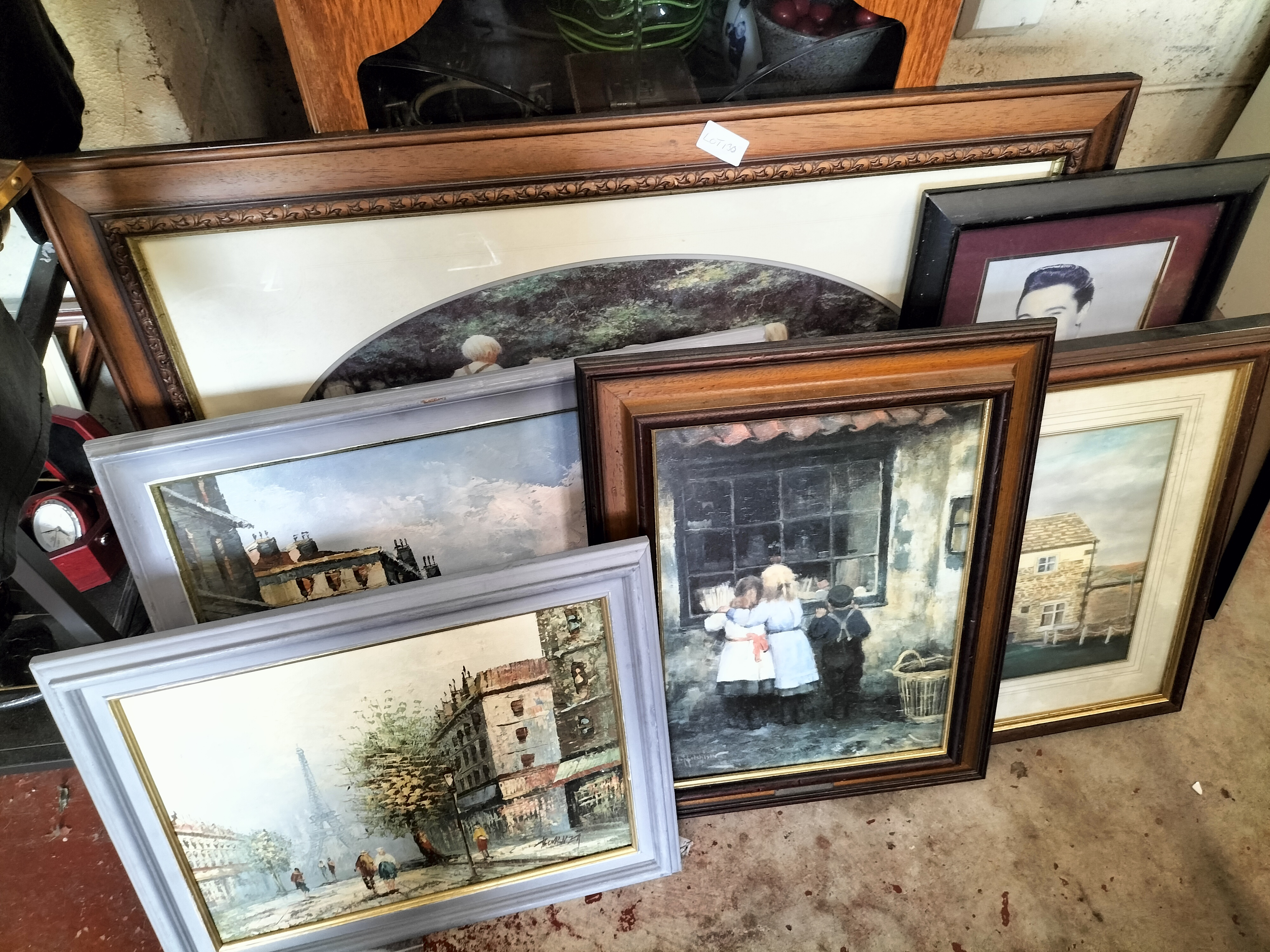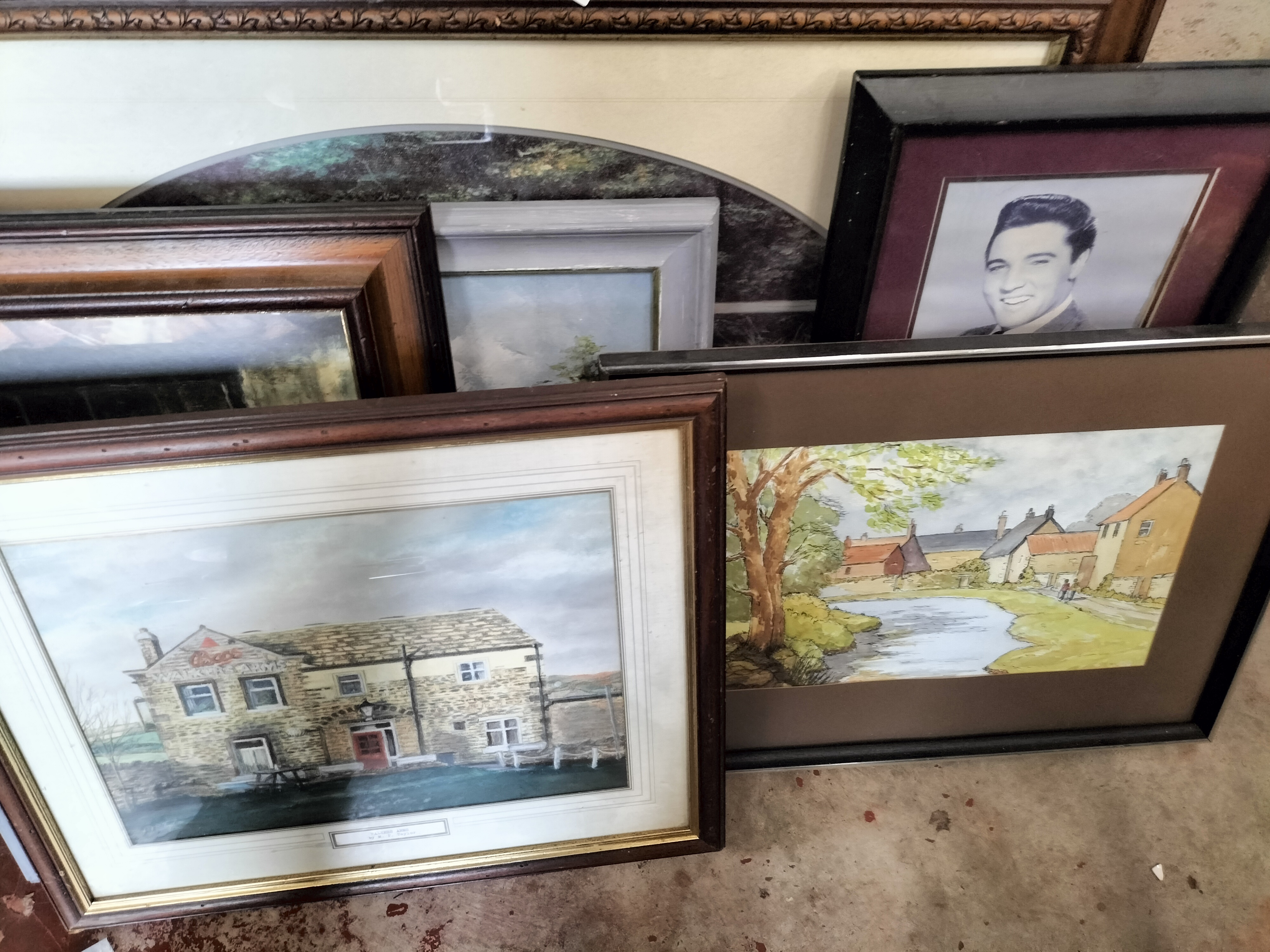 A collection of several framed pictures including a large print of children on a fence, an Elvis Presley photo and record display, and various landscape and genre paintings including one of the Walkers Arms.