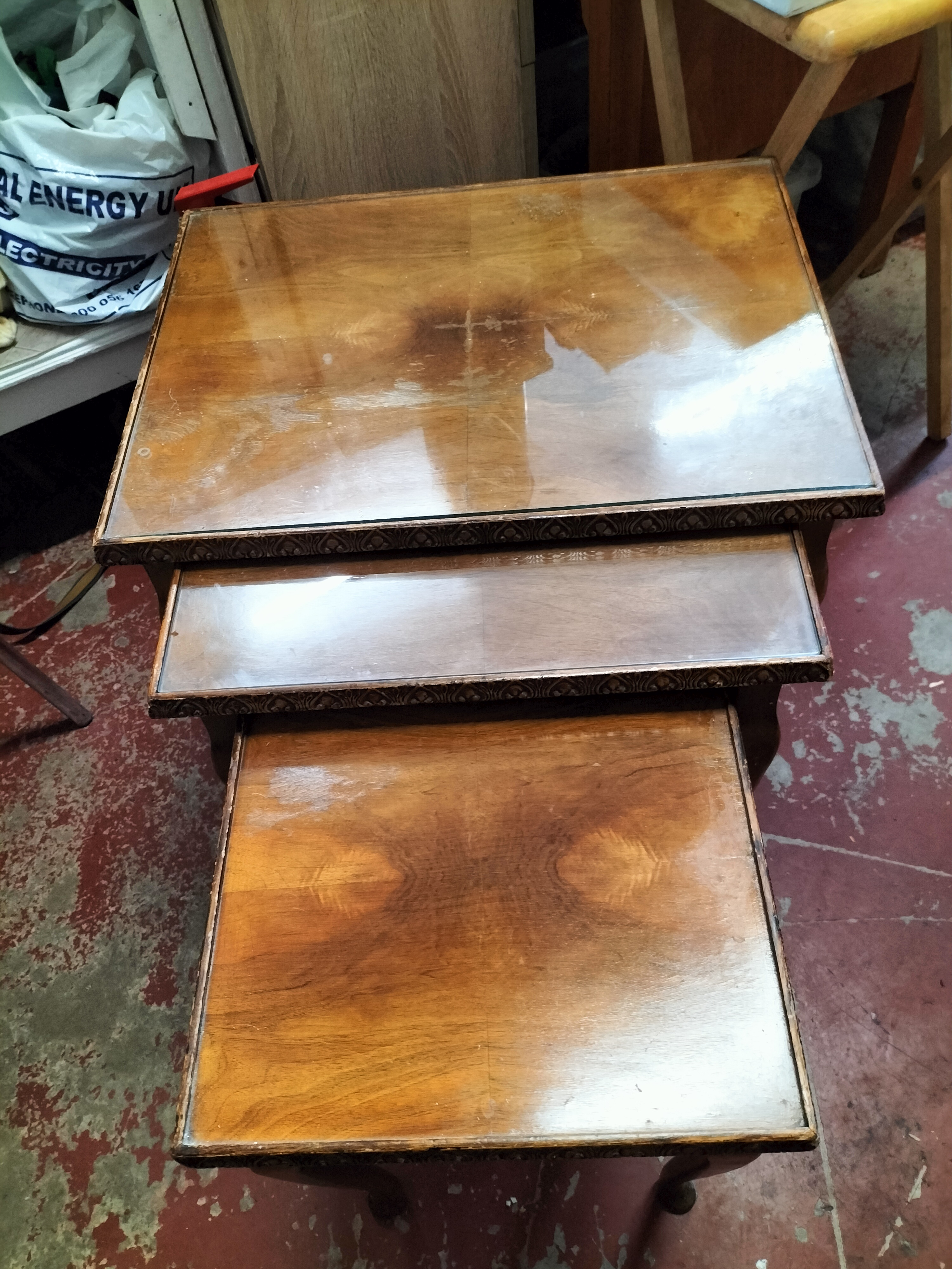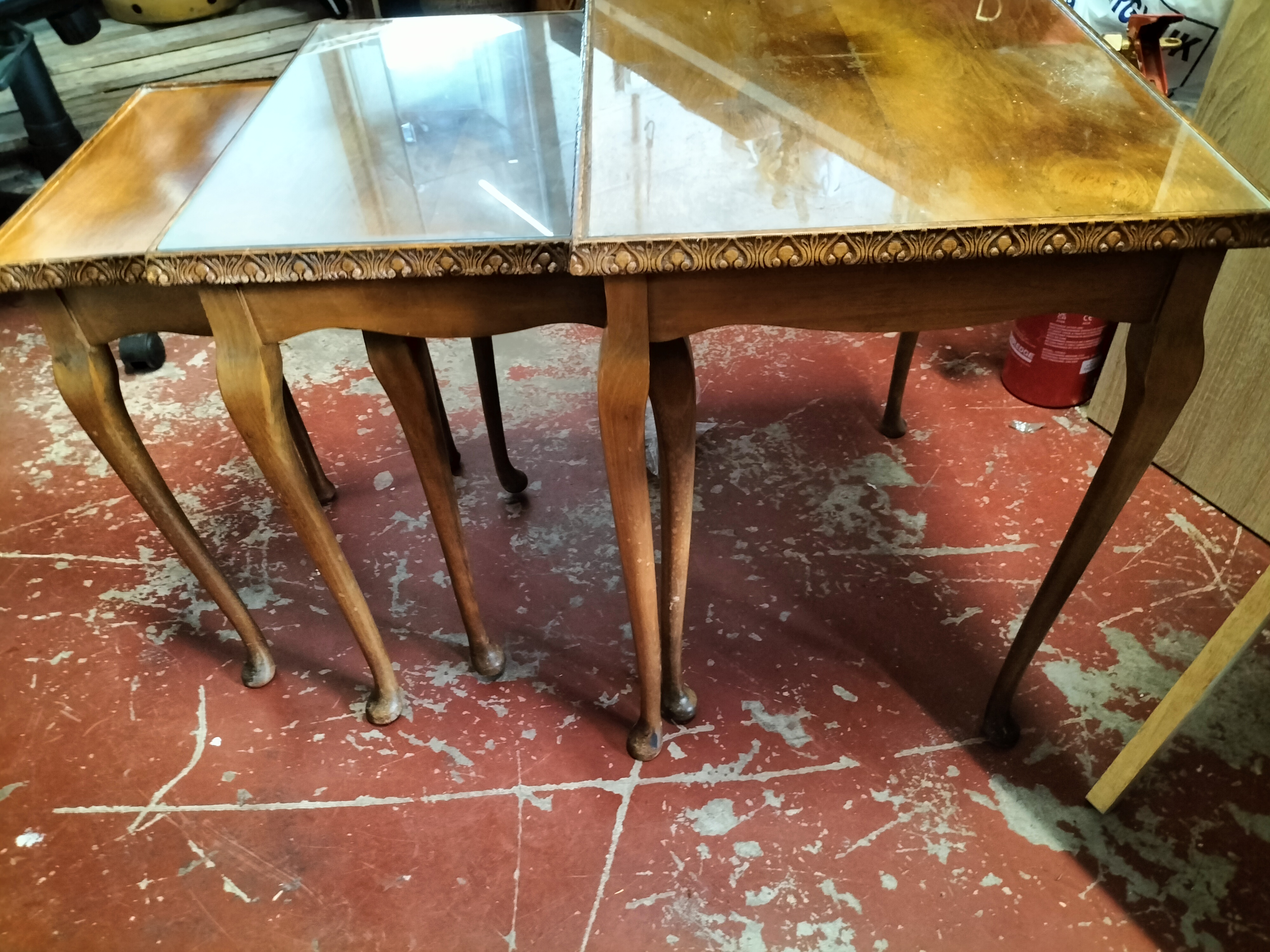 A trio of brown wooden nesting tables featuring book-matched veneer tops protected by glass, carved borders, and cabriole legs.