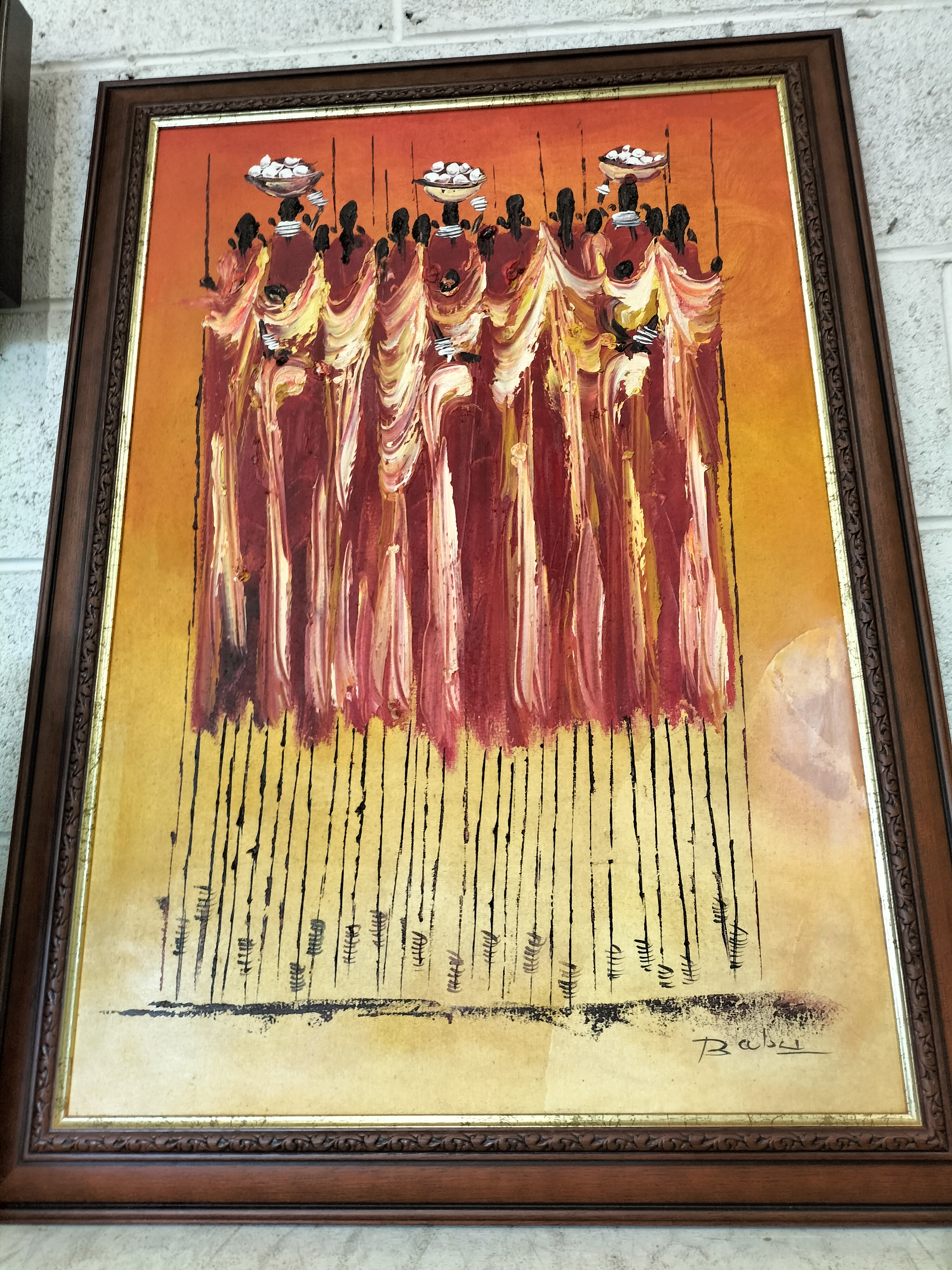 A framed painting featuring stylised figures in shades of orange, yellow, and red, signed Babu in the lower right corner.