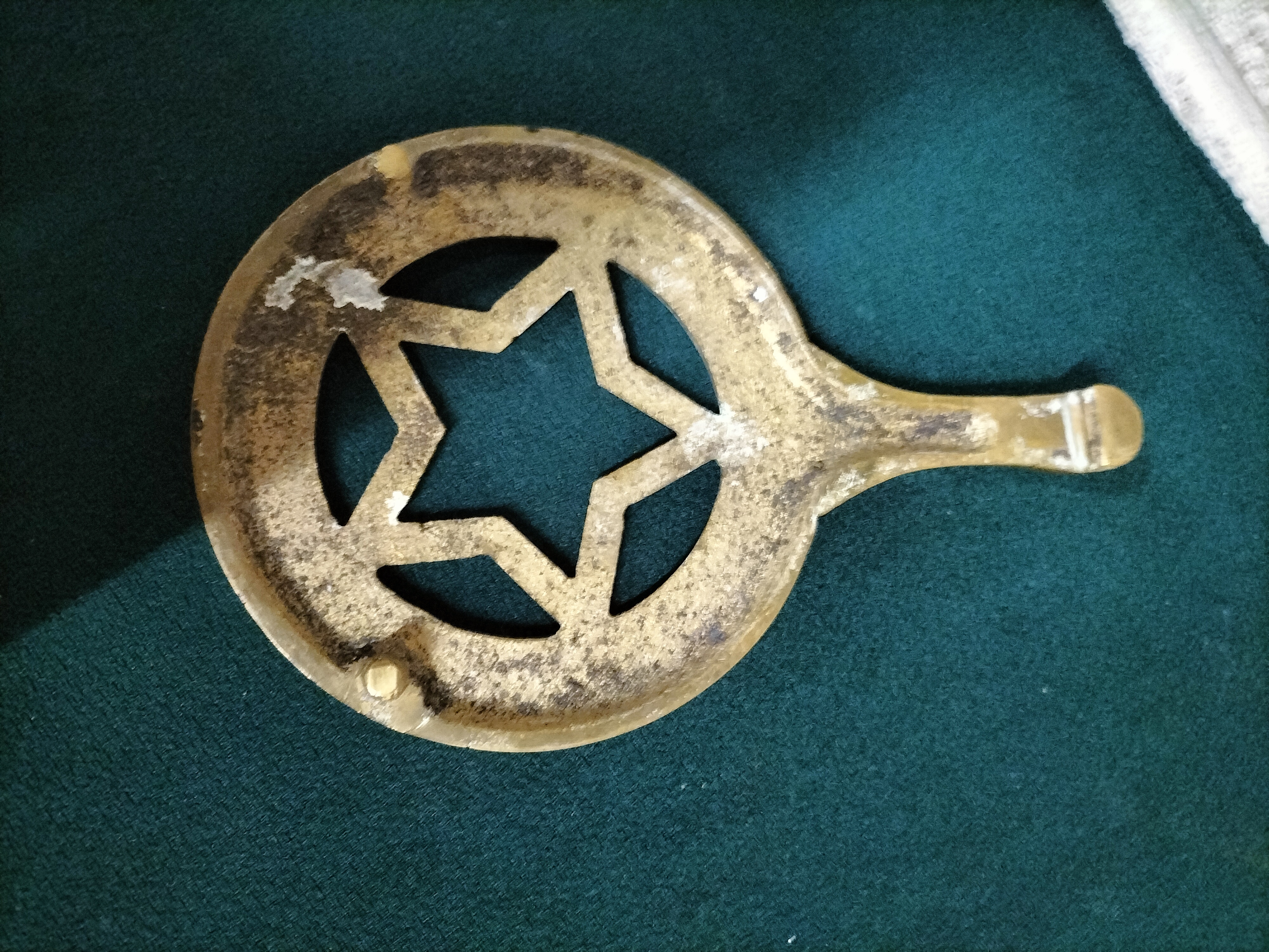 A single gold-coloured brass trivet featuring a central star cutout and a handle, inscribed with 1980 and PARKRAT on the rim.