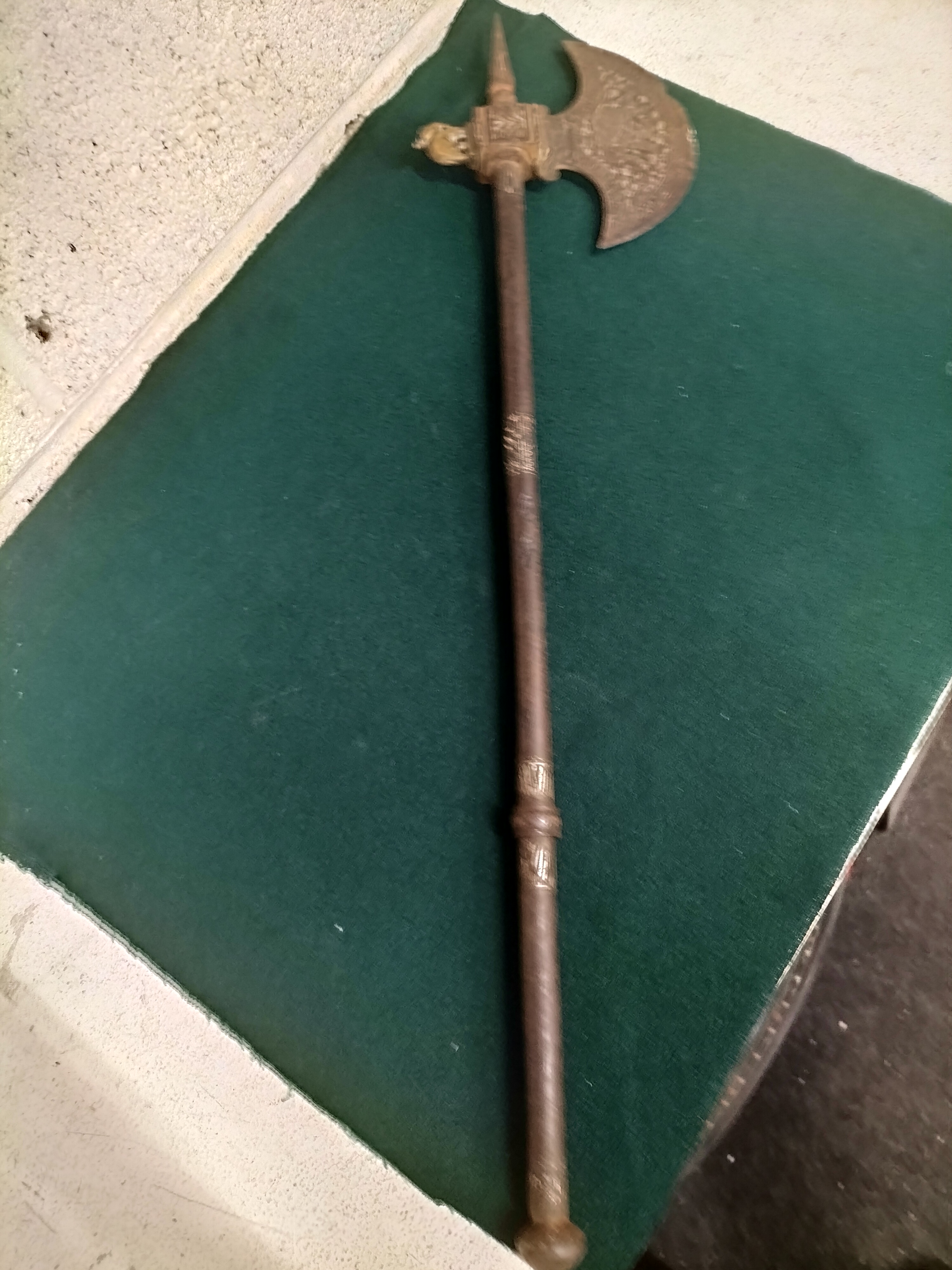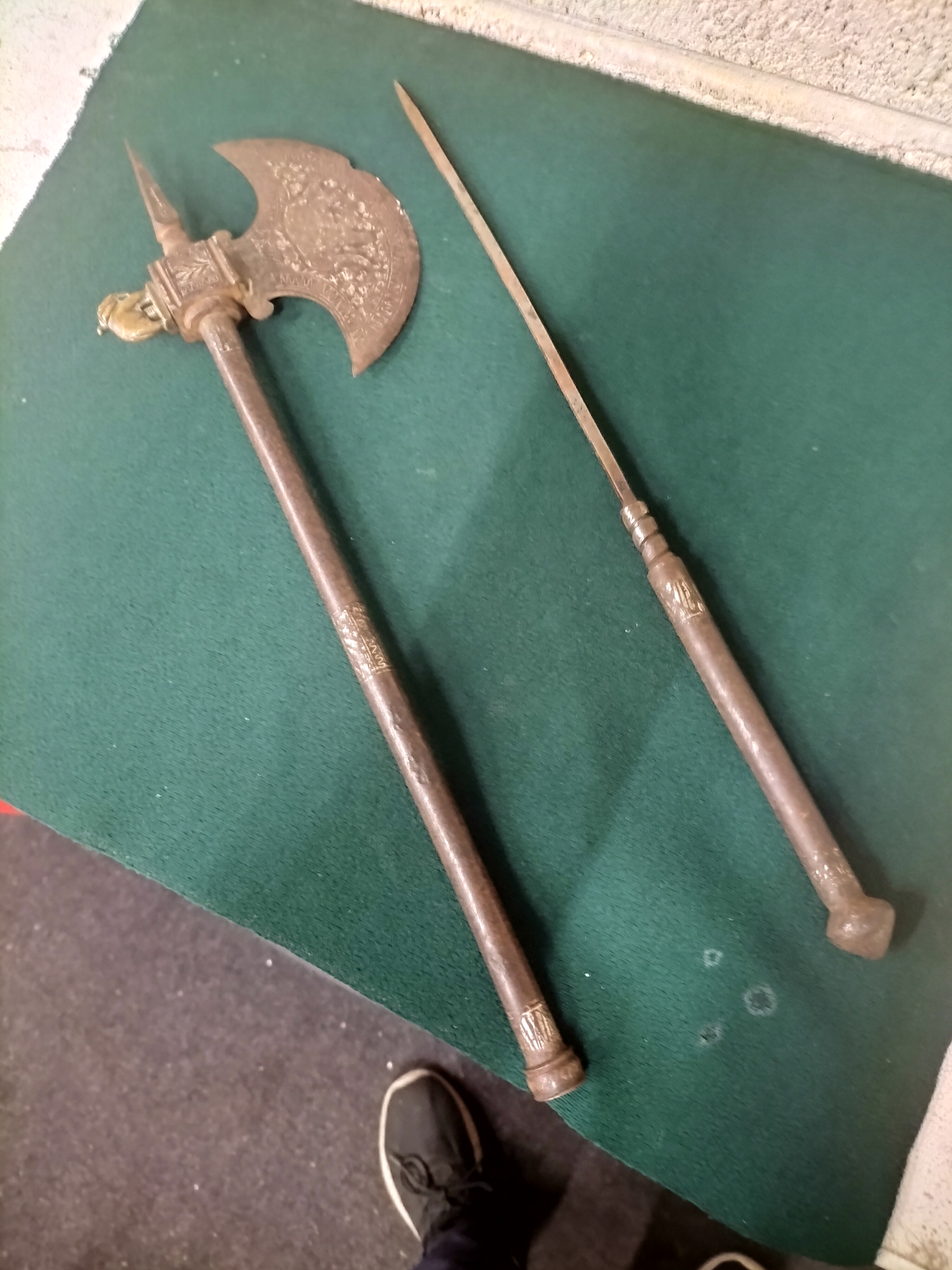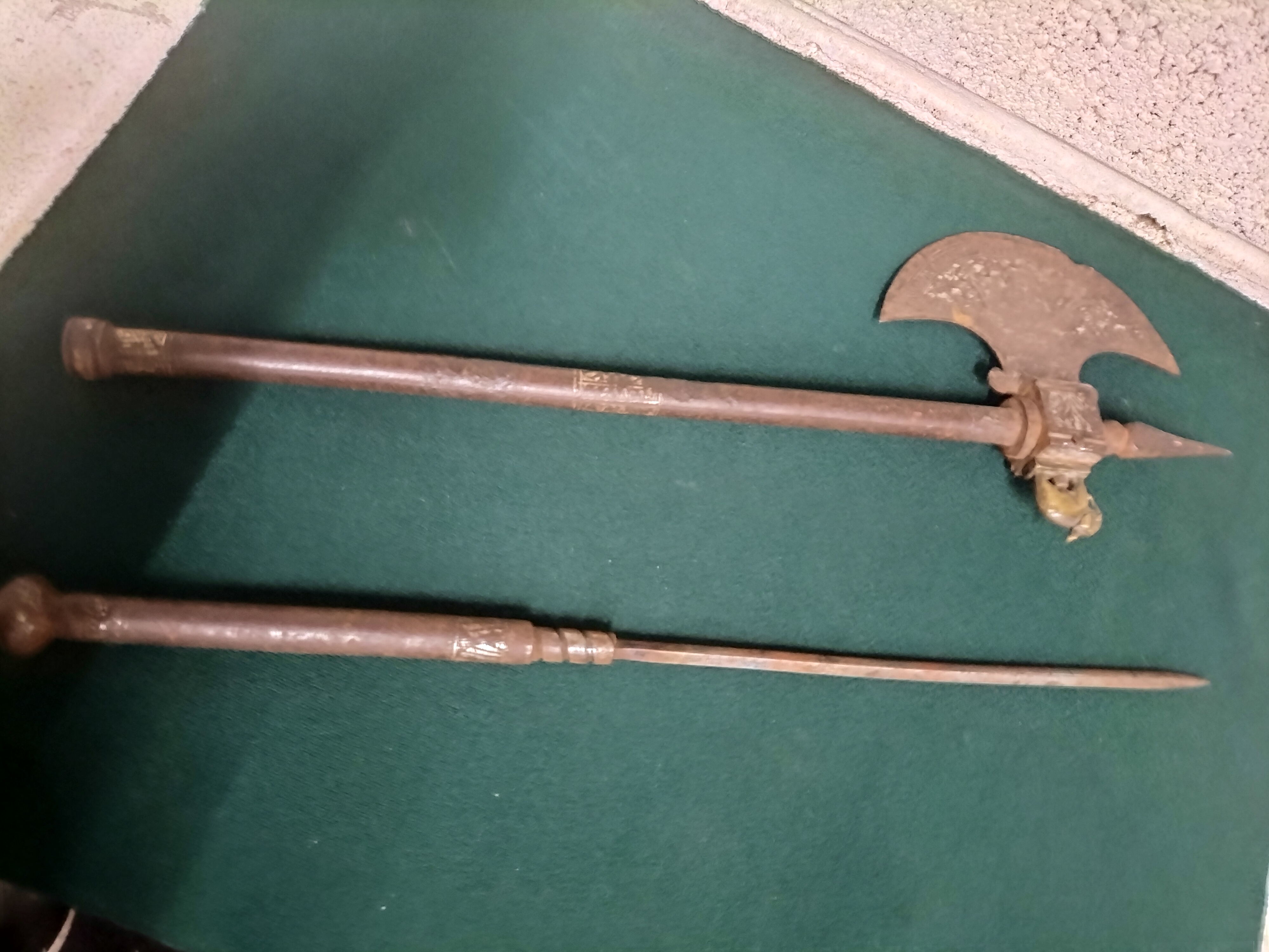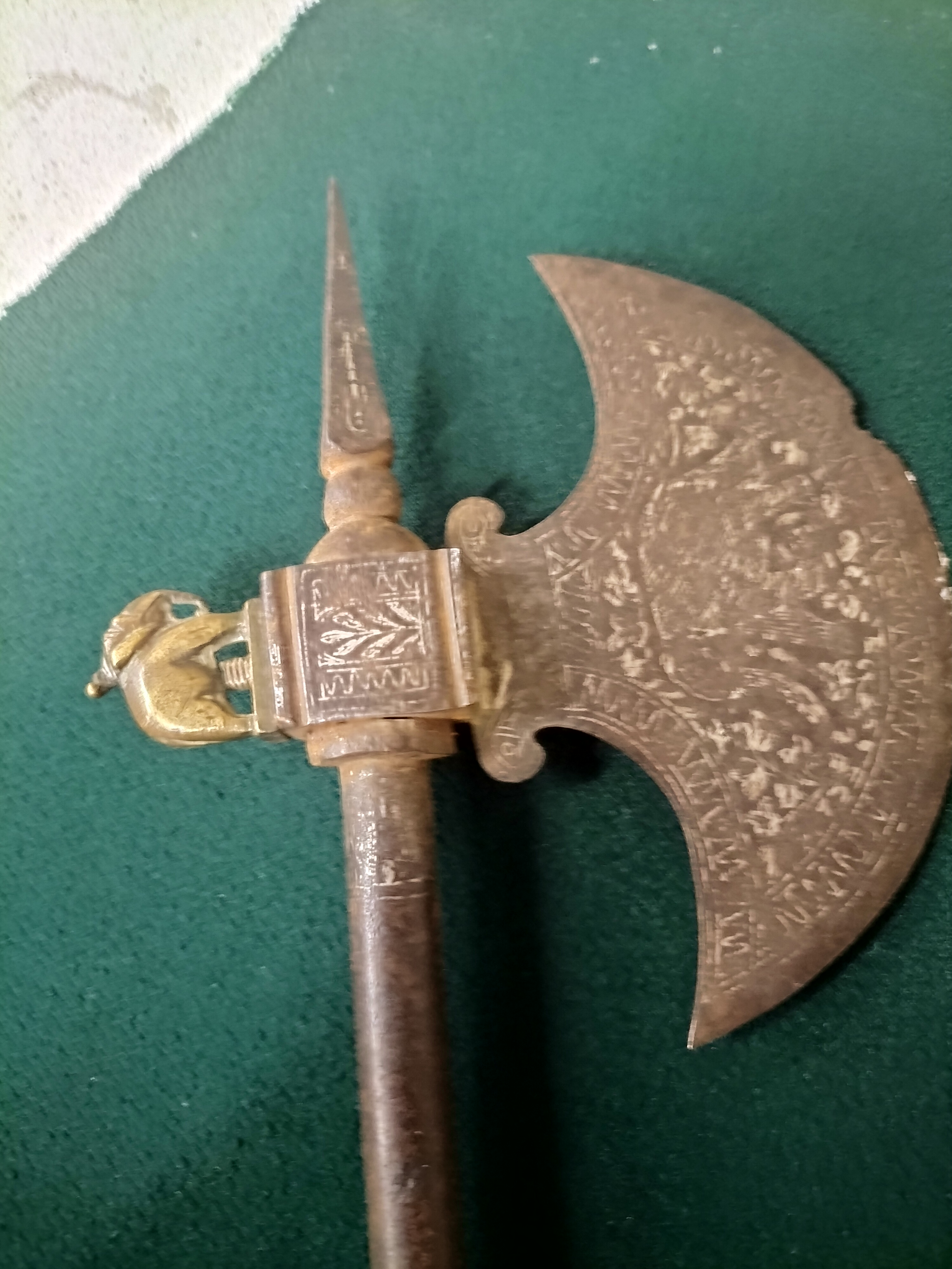 A decorative 19c metal battle axe with an engraved crescent blade and animal figure along with a matching pointed rod featuring silver-toned ornamental inlays.