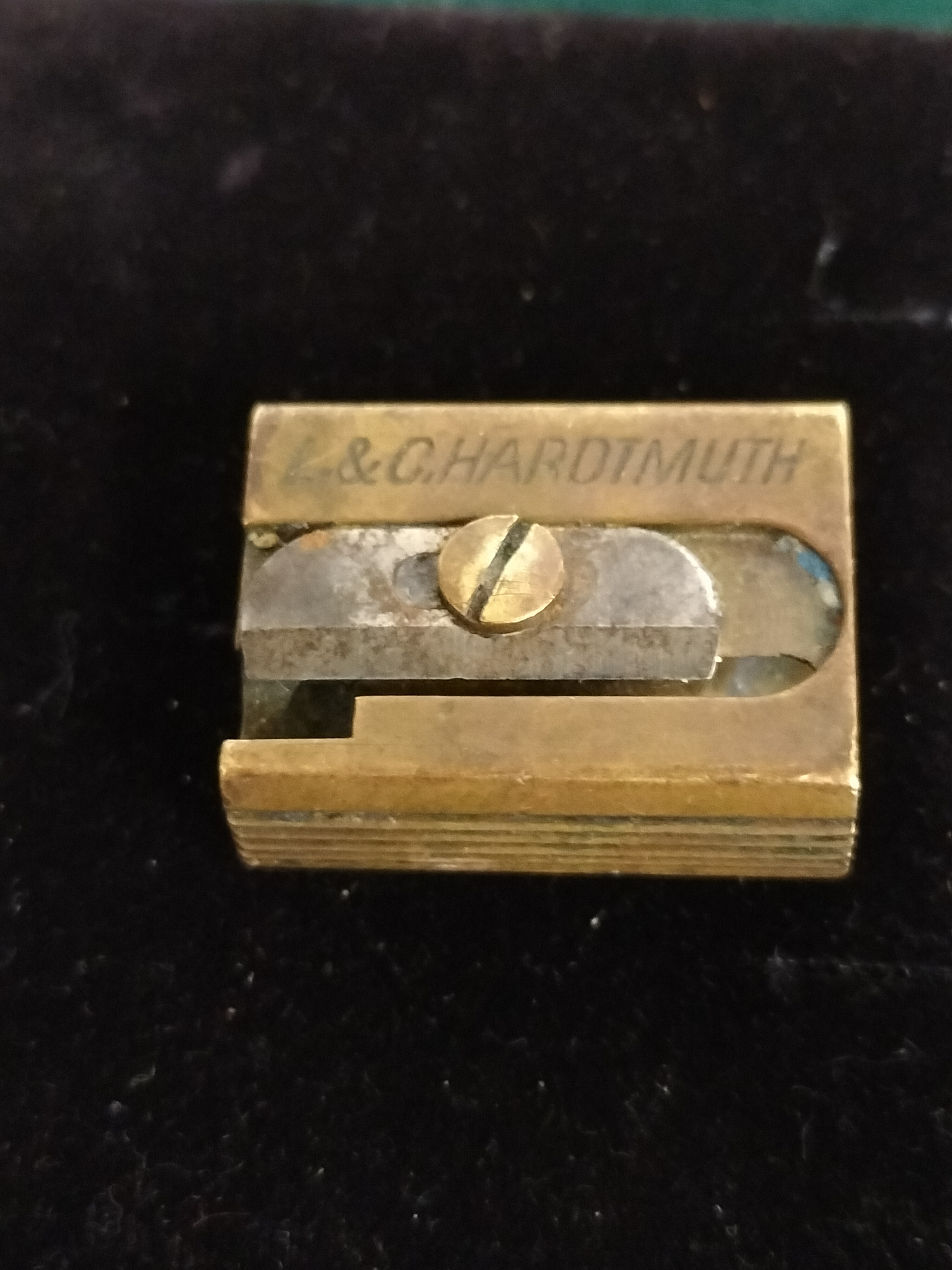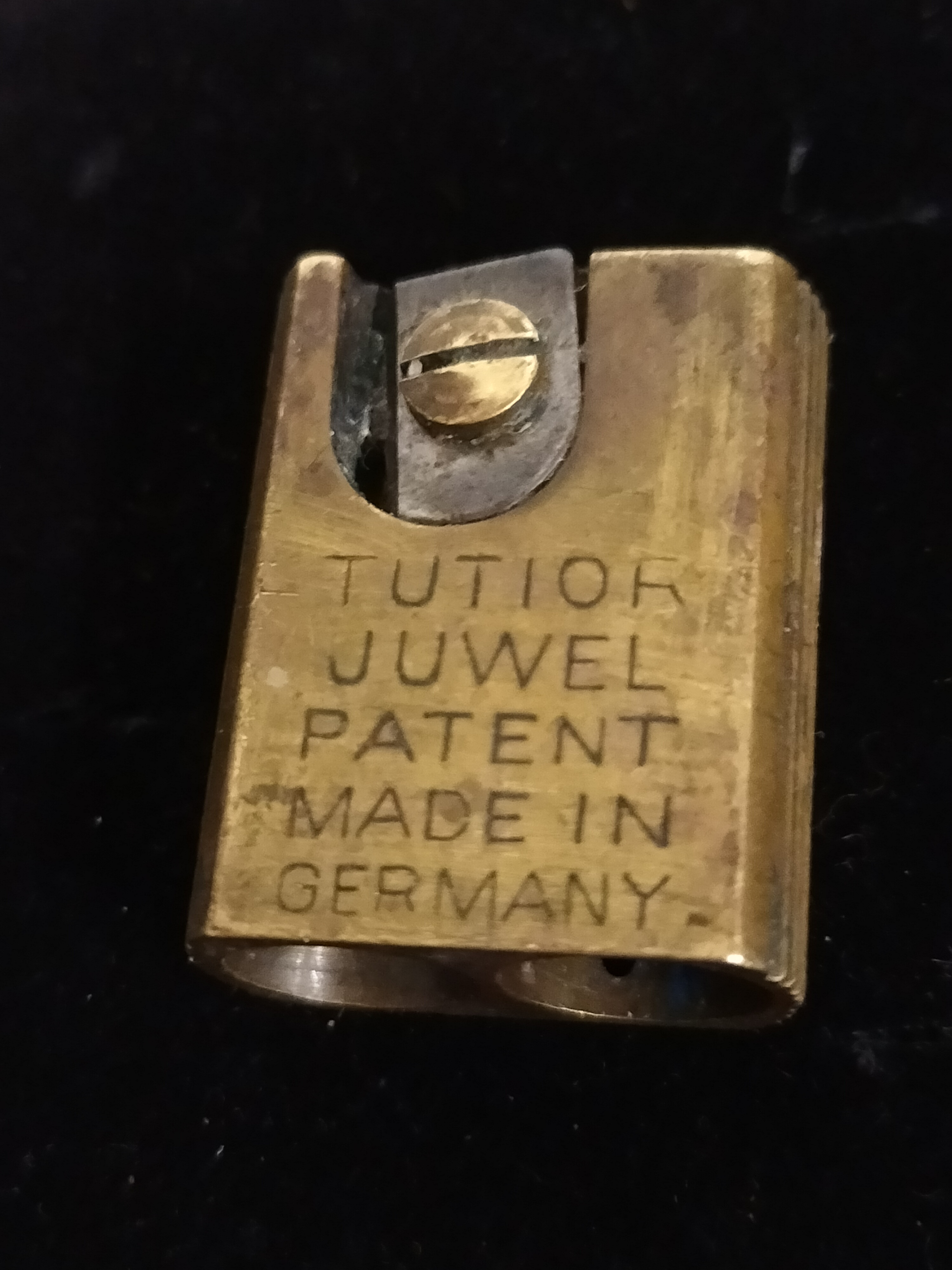 A Double vintage German brass-toned metal pencil sharpeners featuring stamped markings for Tutior Juwel and L. & C. Hardtmuth.
