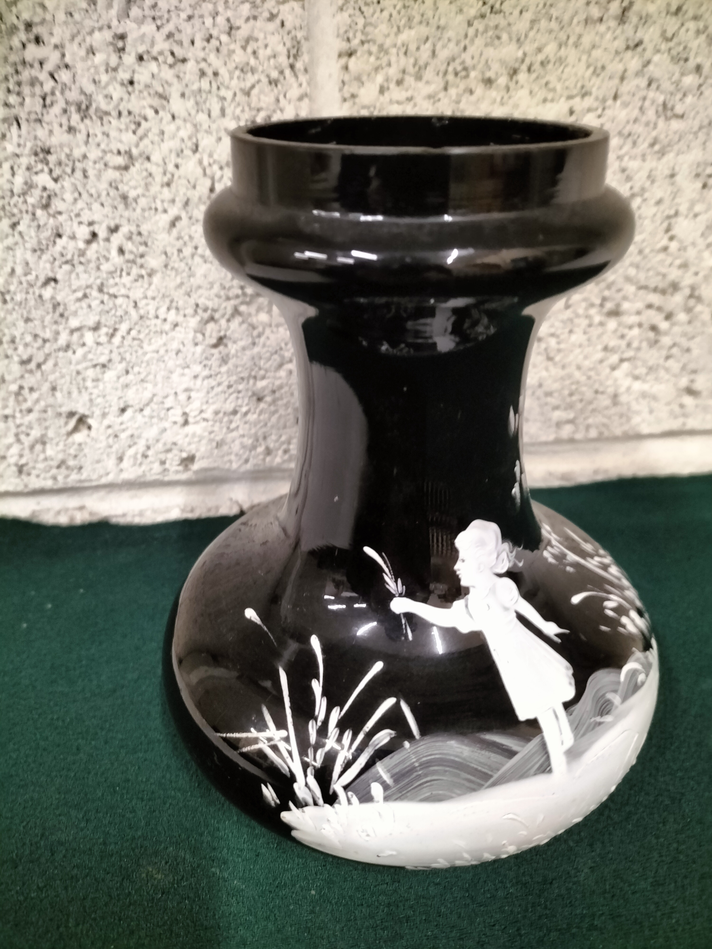 A black glass vase featuring white enamel Mary Gregory style decoration depicting a young girl in a landscape.
