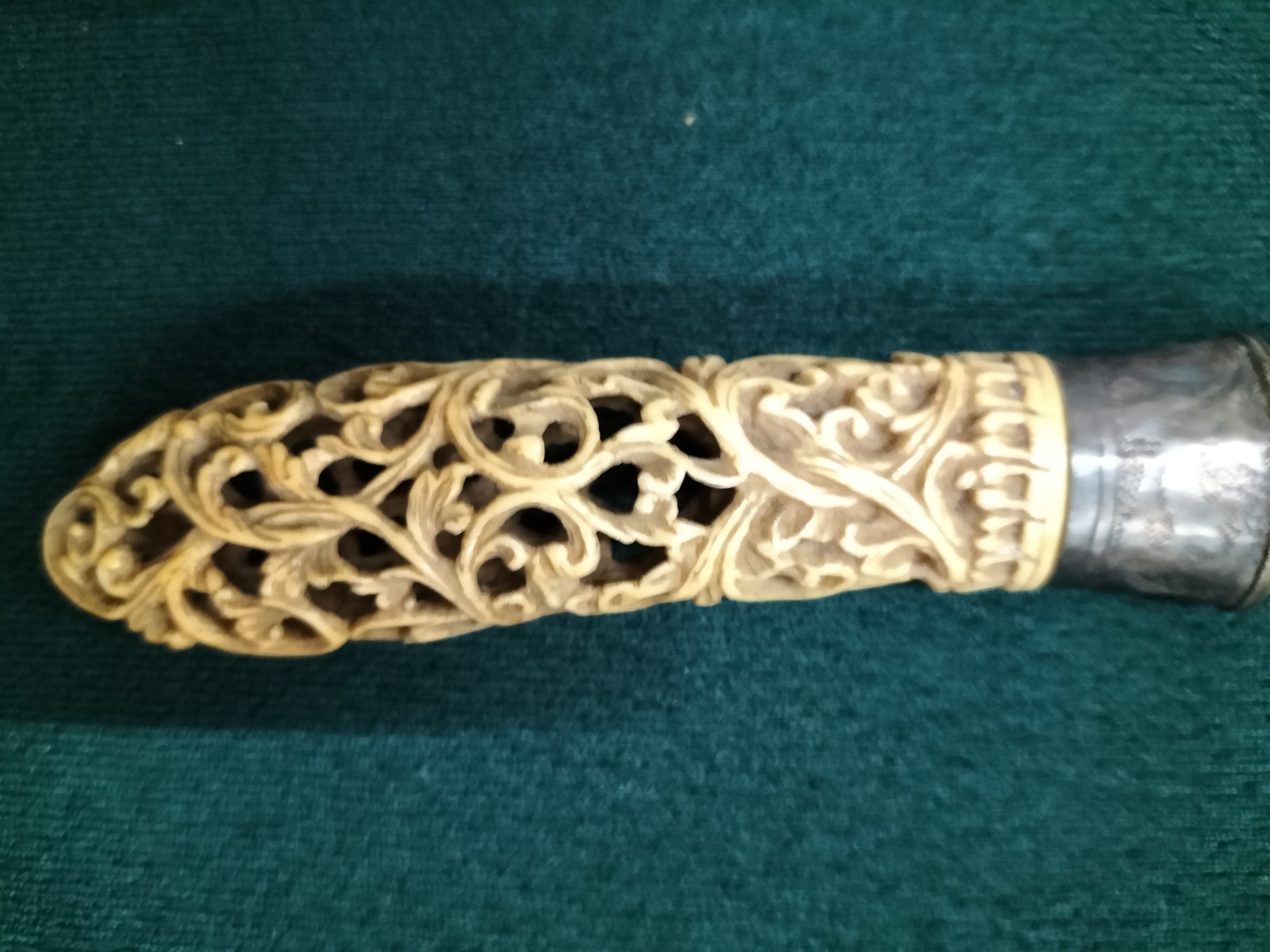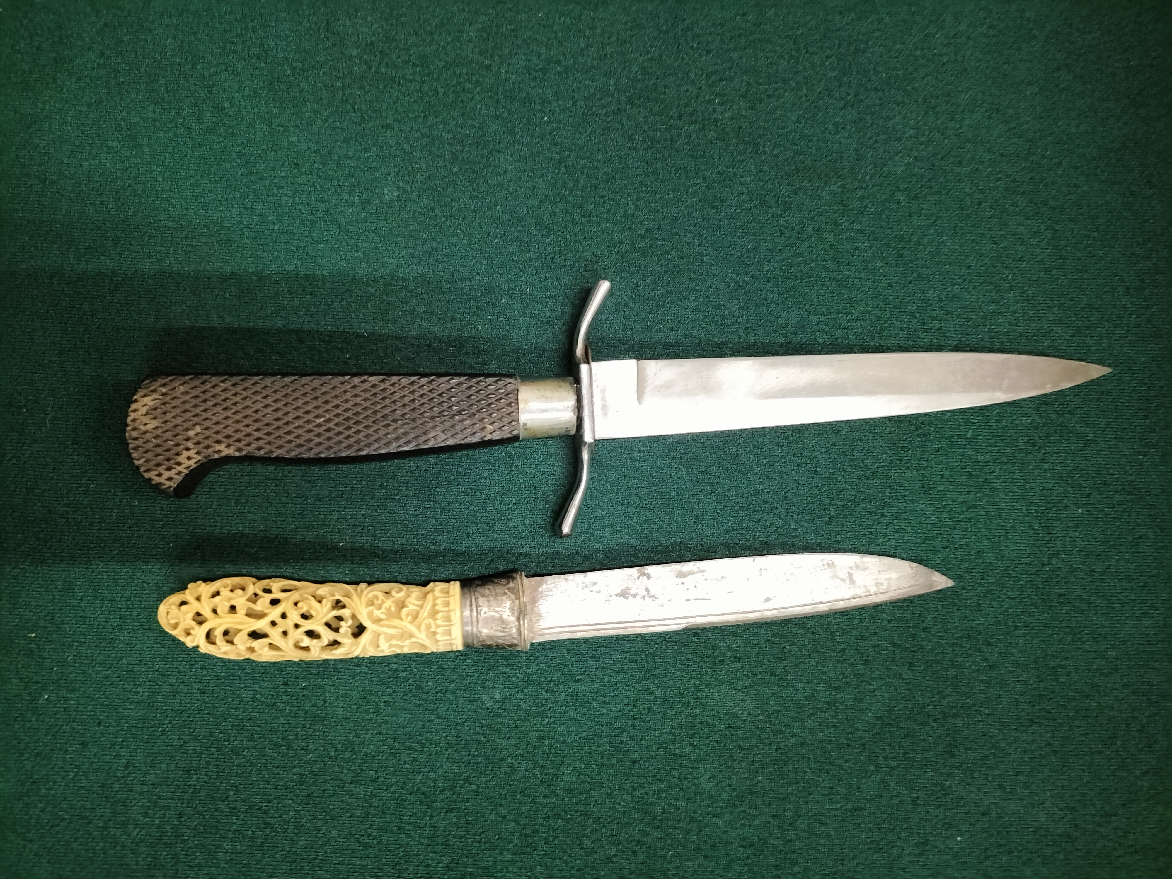 Two knives comprising one with a black checkered handle marked Coricama and another featuring an ornately carved cream-coloured handle.