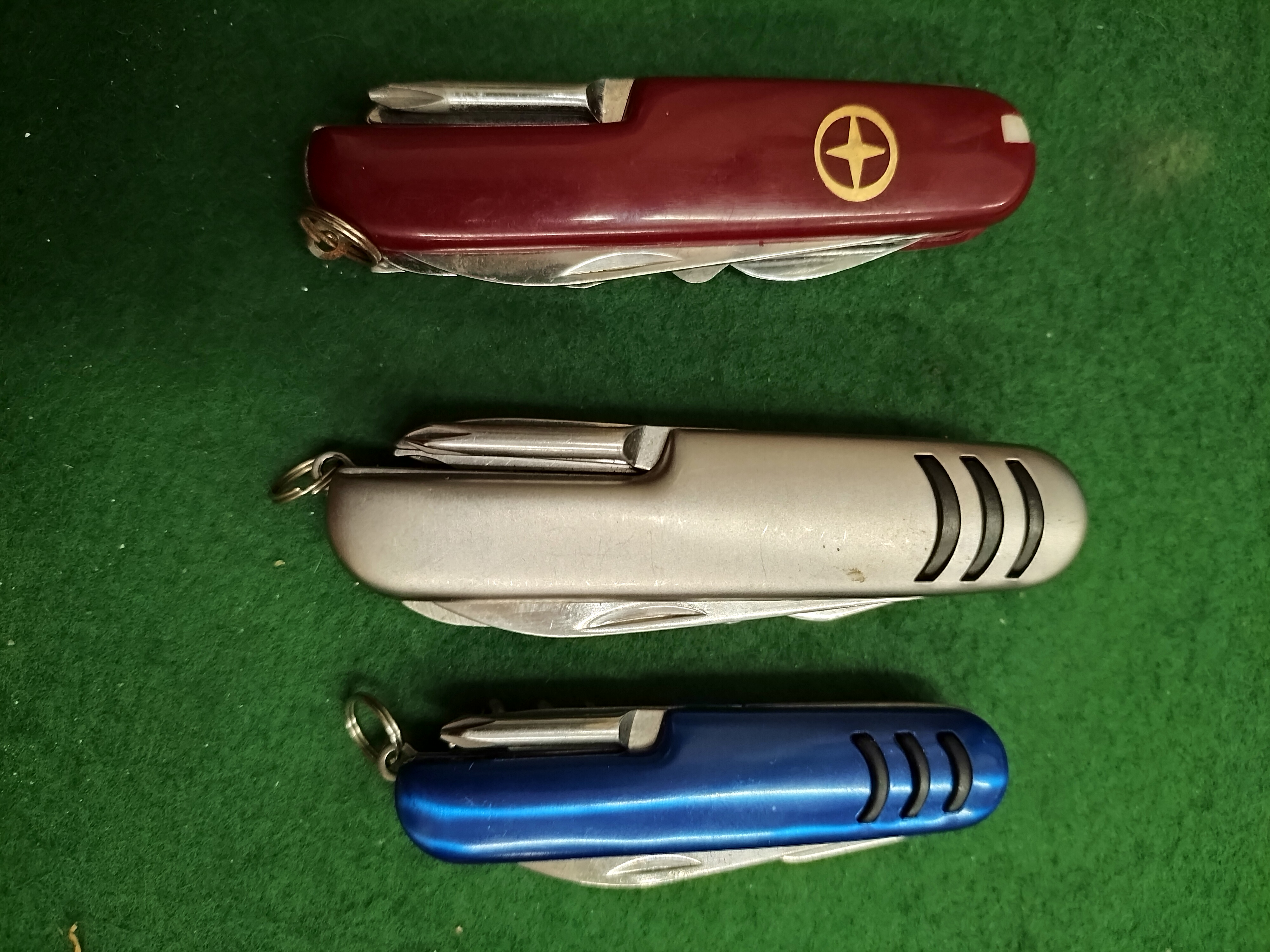 Three multi-tool pocket knives in maroon, silver-tone, and blue, with the maroon knife featuring a circular gold logo with a four-pointed star and all containing stainless steel components.