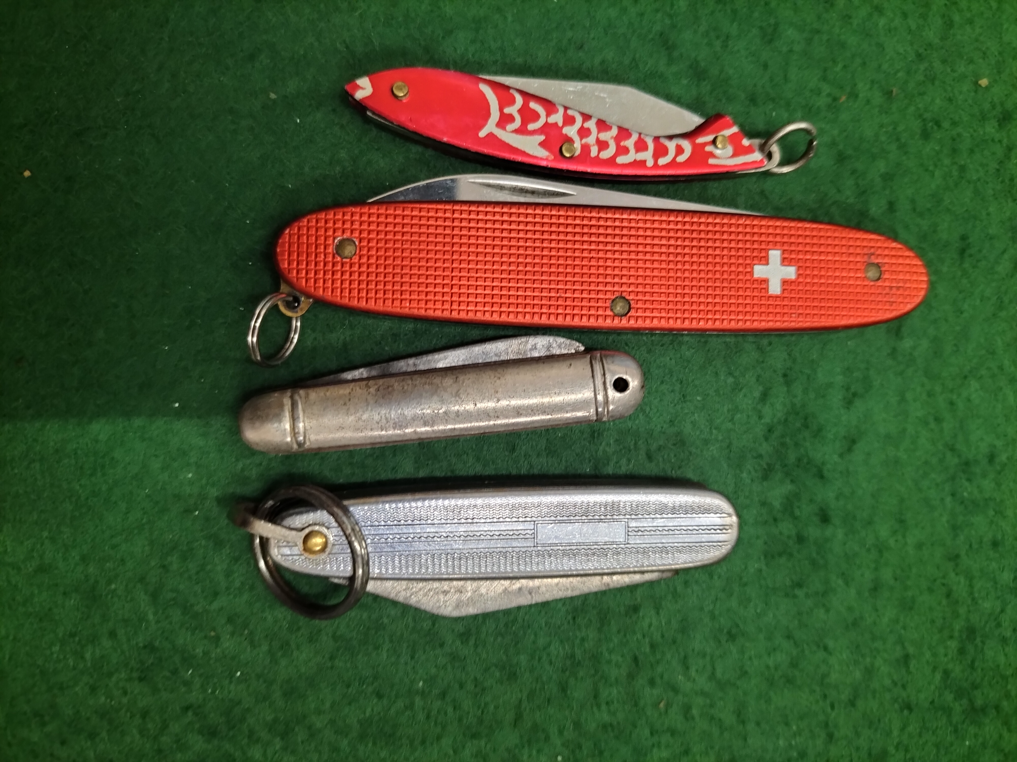 A collection of pocket knives including a red textured Victorinox Alox with an old cross emblem and various silver-coloured folding knives.
