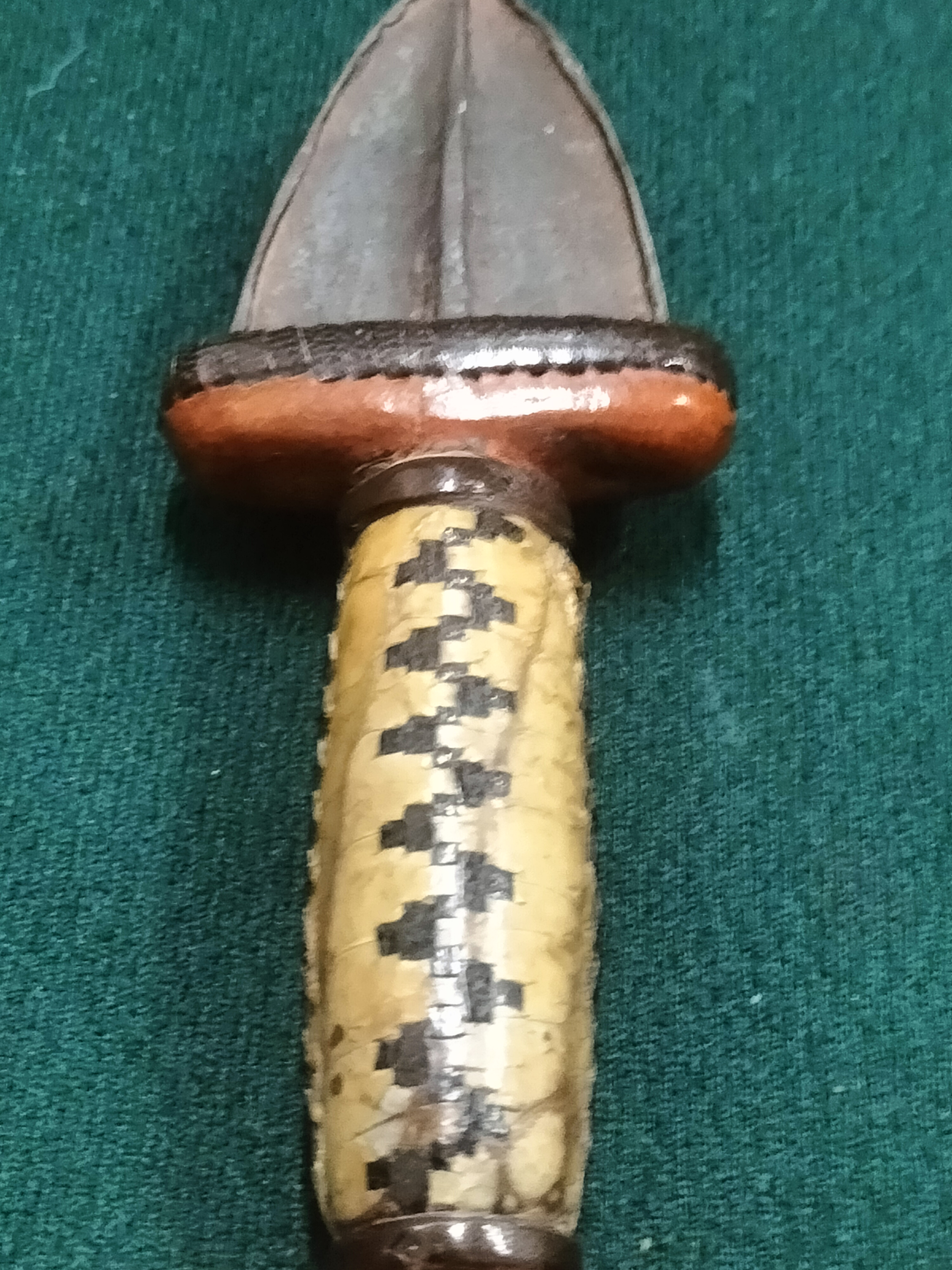 A leaf-shaped steel blade dagger featuring a handle and matching scabbard bound in brown leather and cream reptile skin with a braided arm loop.