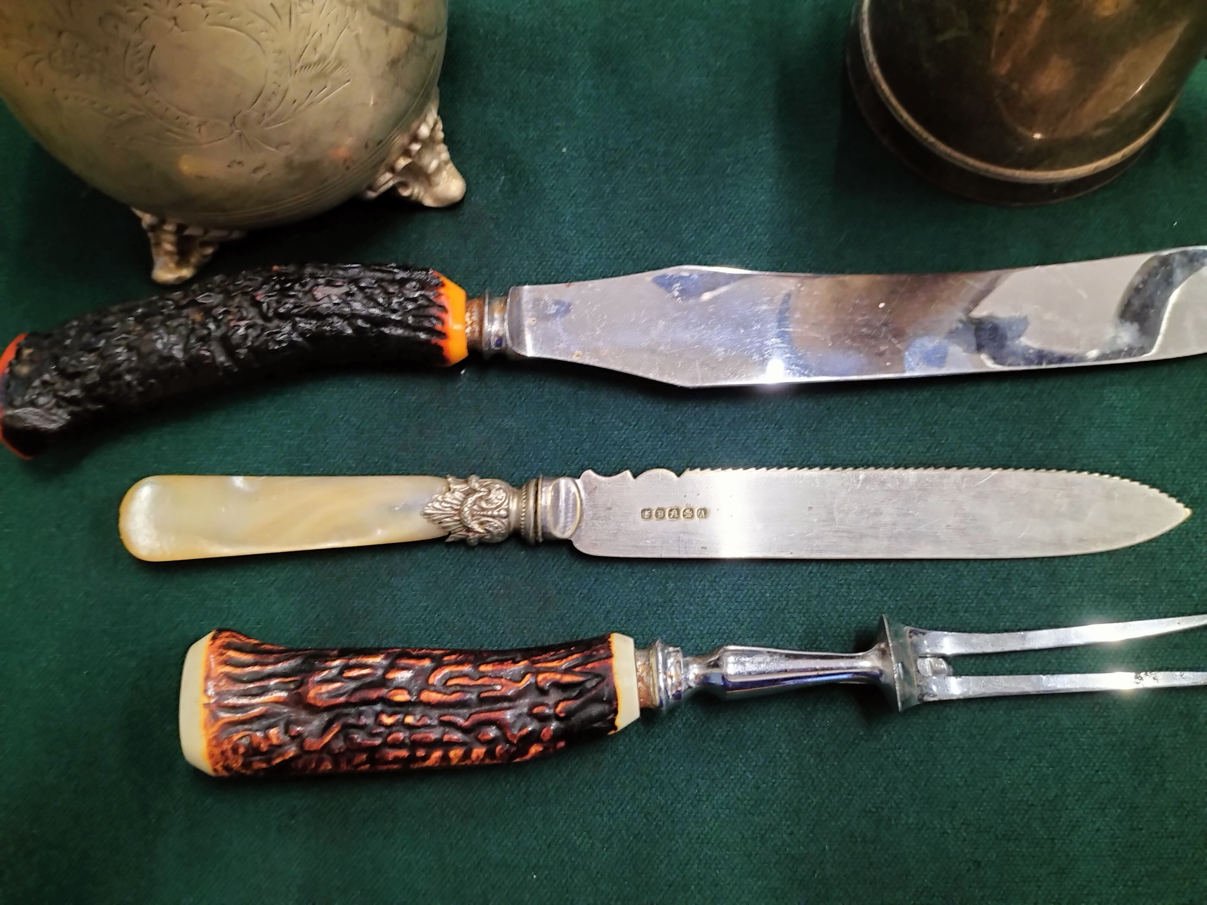 Two silver-toned lidded pots and three utensils consisting of two knives and a carving fork with hallmarks visible on the mother-of-pearl handled knife.