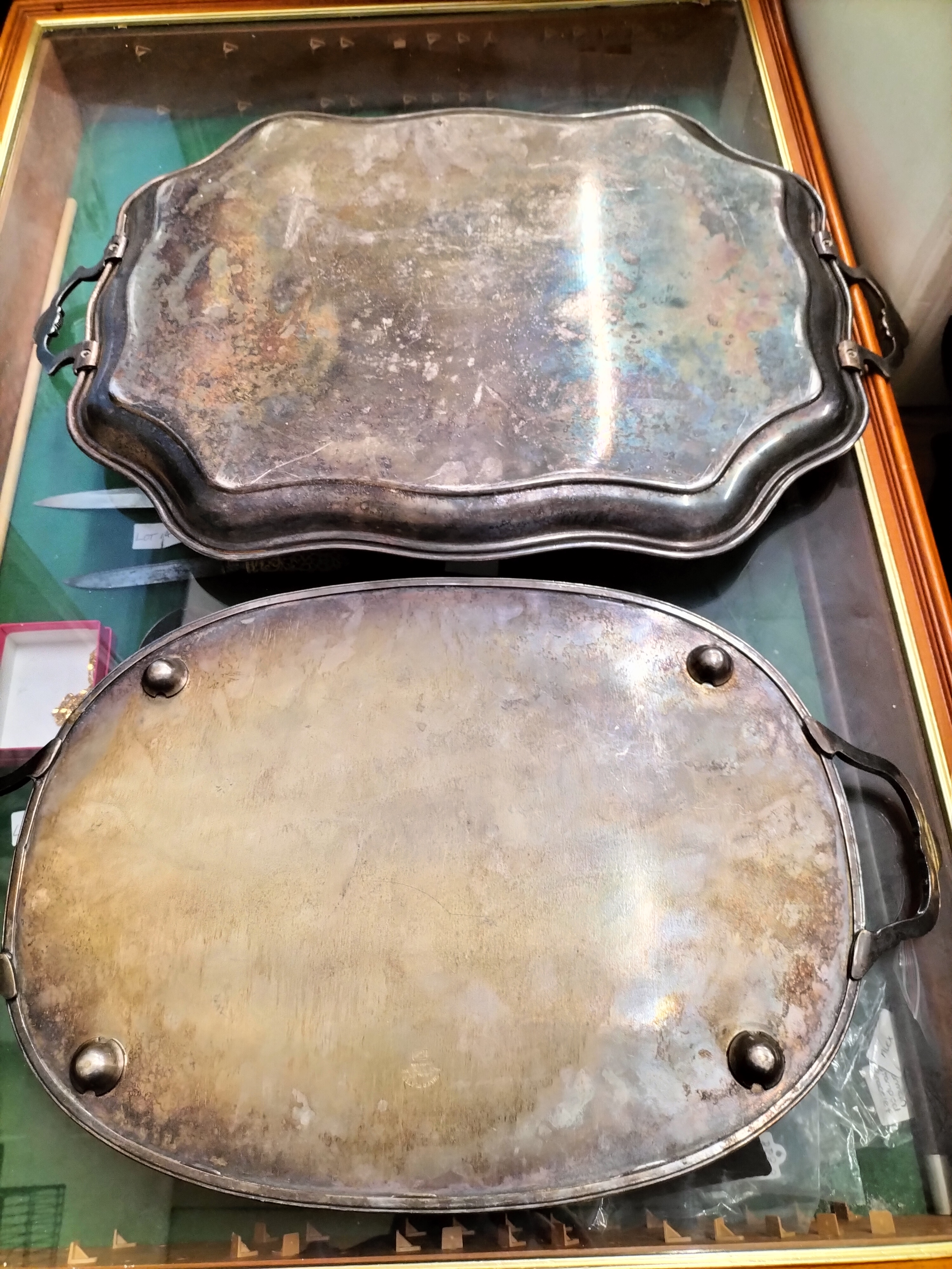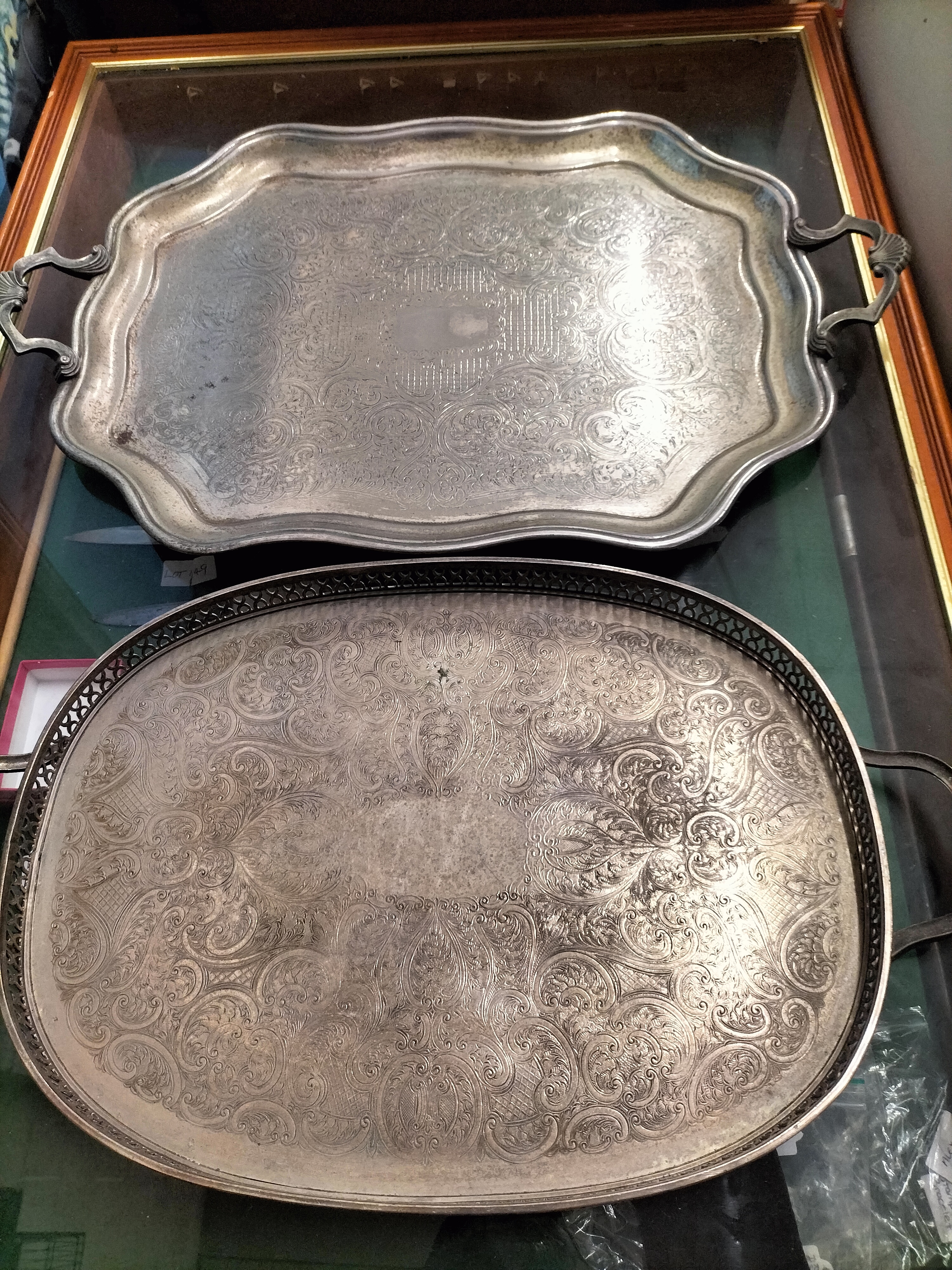 A Viners of Sheffield Alpha Plate oval gallery tray with chased decoration and an Oneida Silversmiths Burlington rectangular scalloped tray.