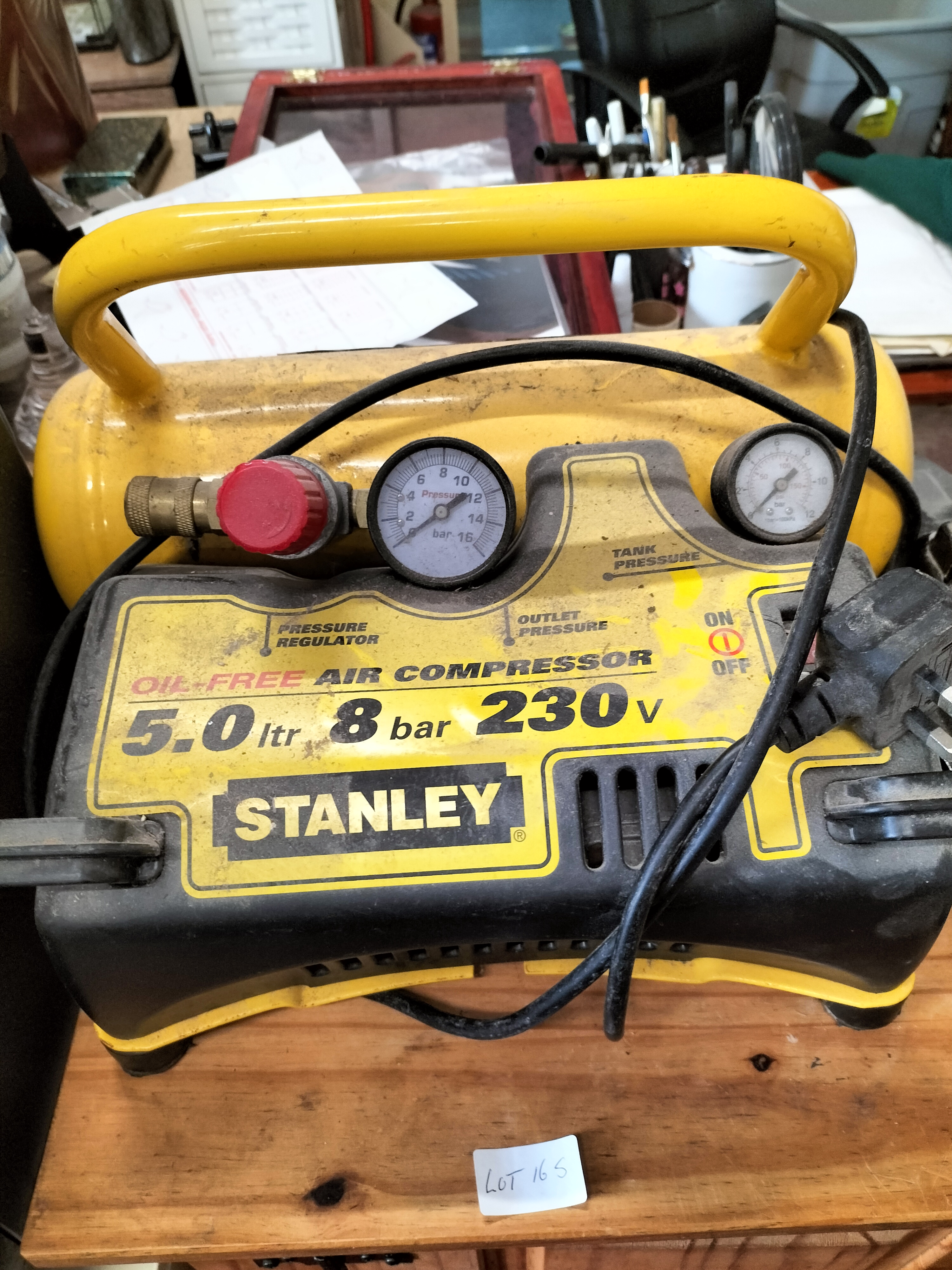 A yellow and black Stanley oil-free air compressor featuring a 5.0 litre tank, 8 bar pressure capacity, and 230v power supply.