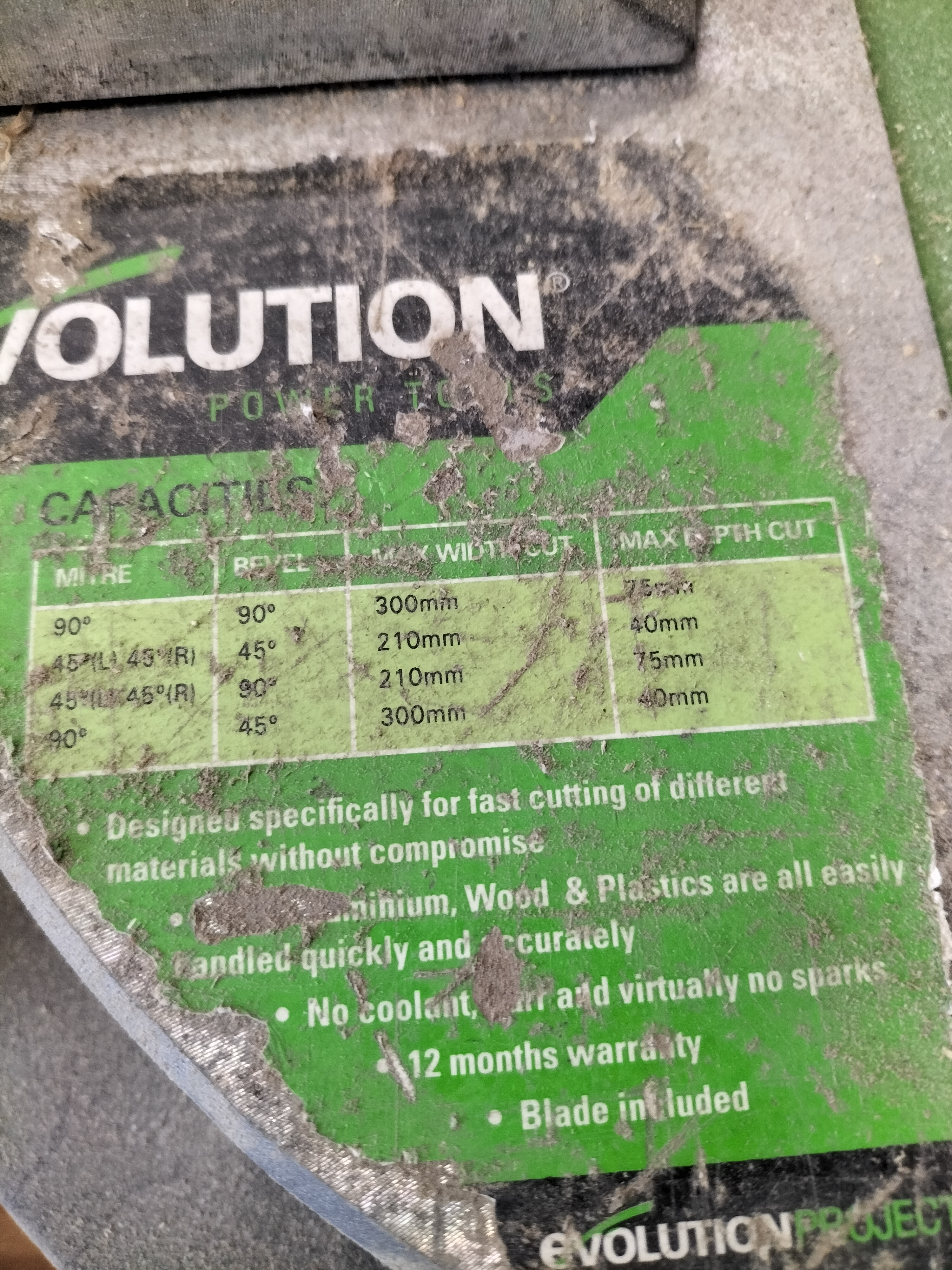 An Evolution Fury 3-XL multipurpose sliding mitre saw in grey, black, and green, featuring manufacturer labels detailing cutting capacities for wood, aluminium, and plastics.