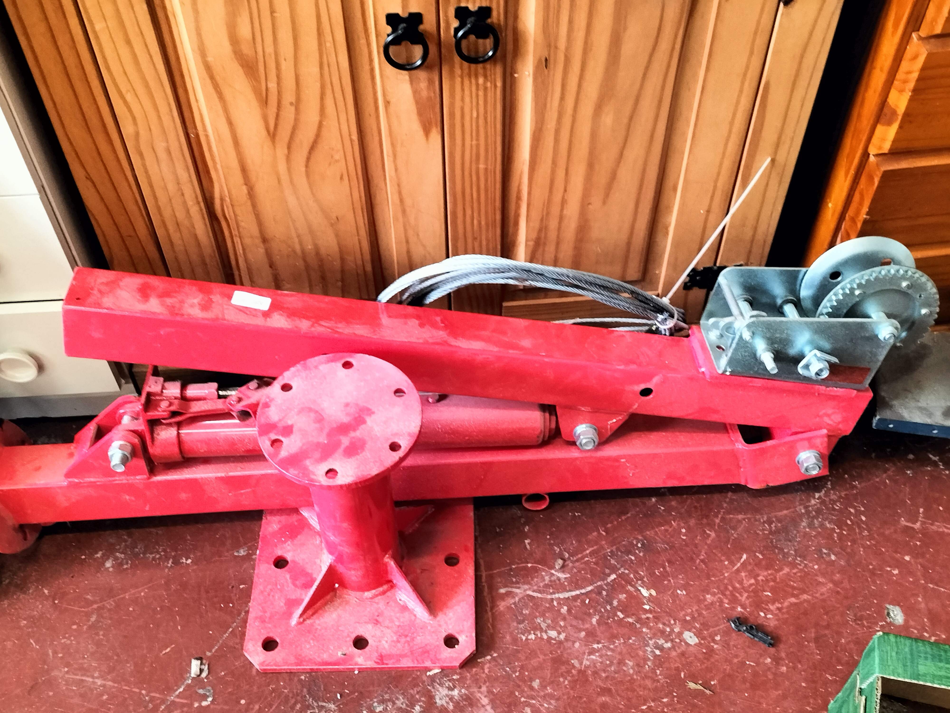 A red hydraulic engine hoist featuring a silver-coloured winch with a grey cable and a mounting base.