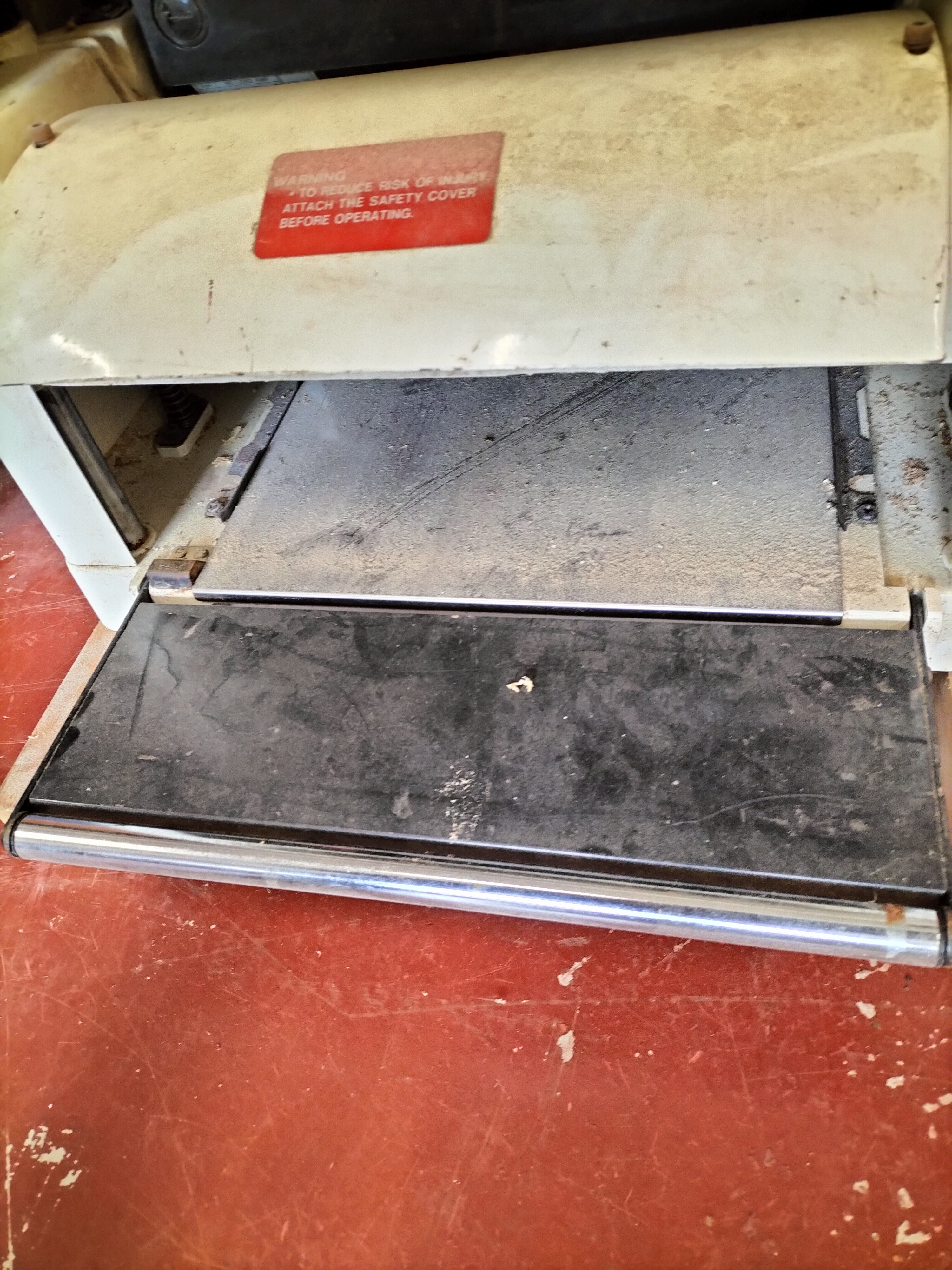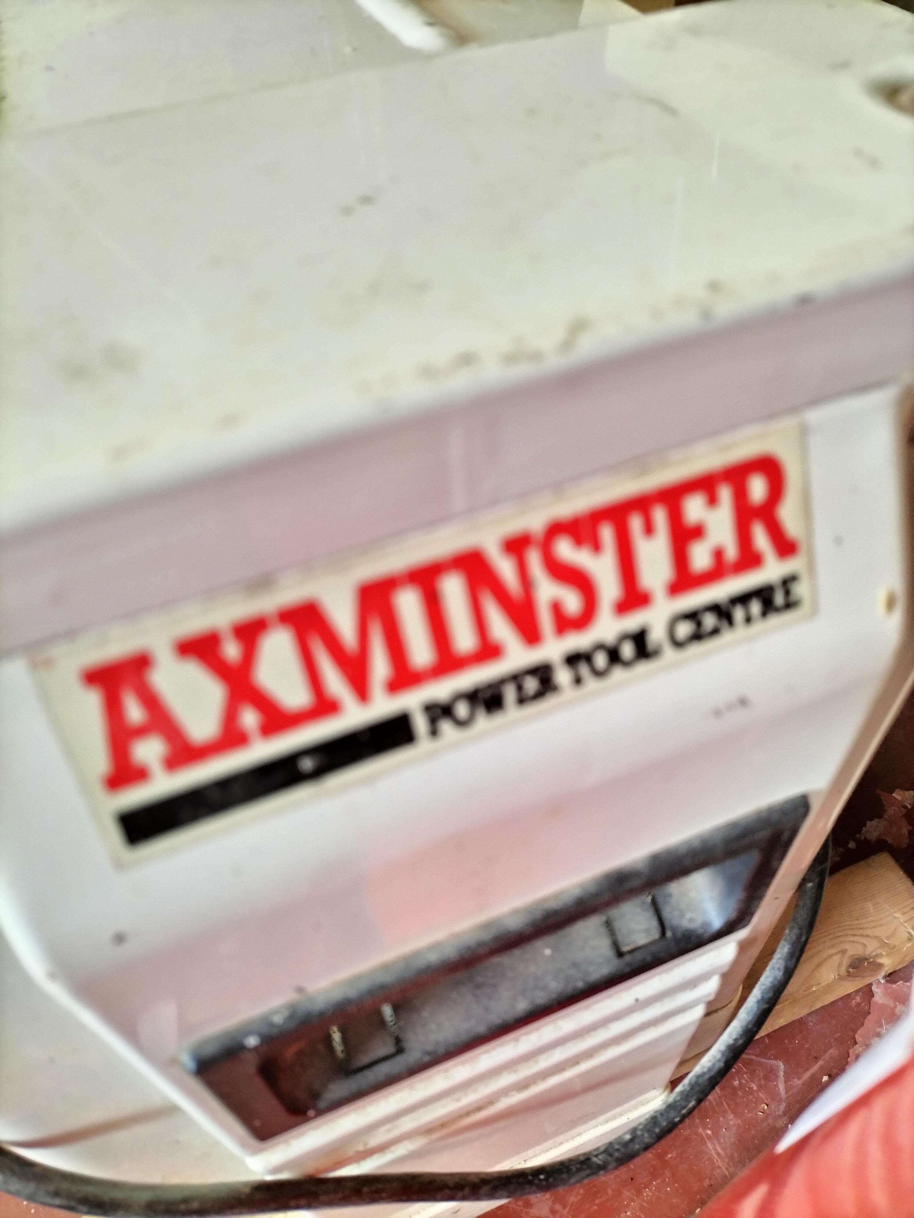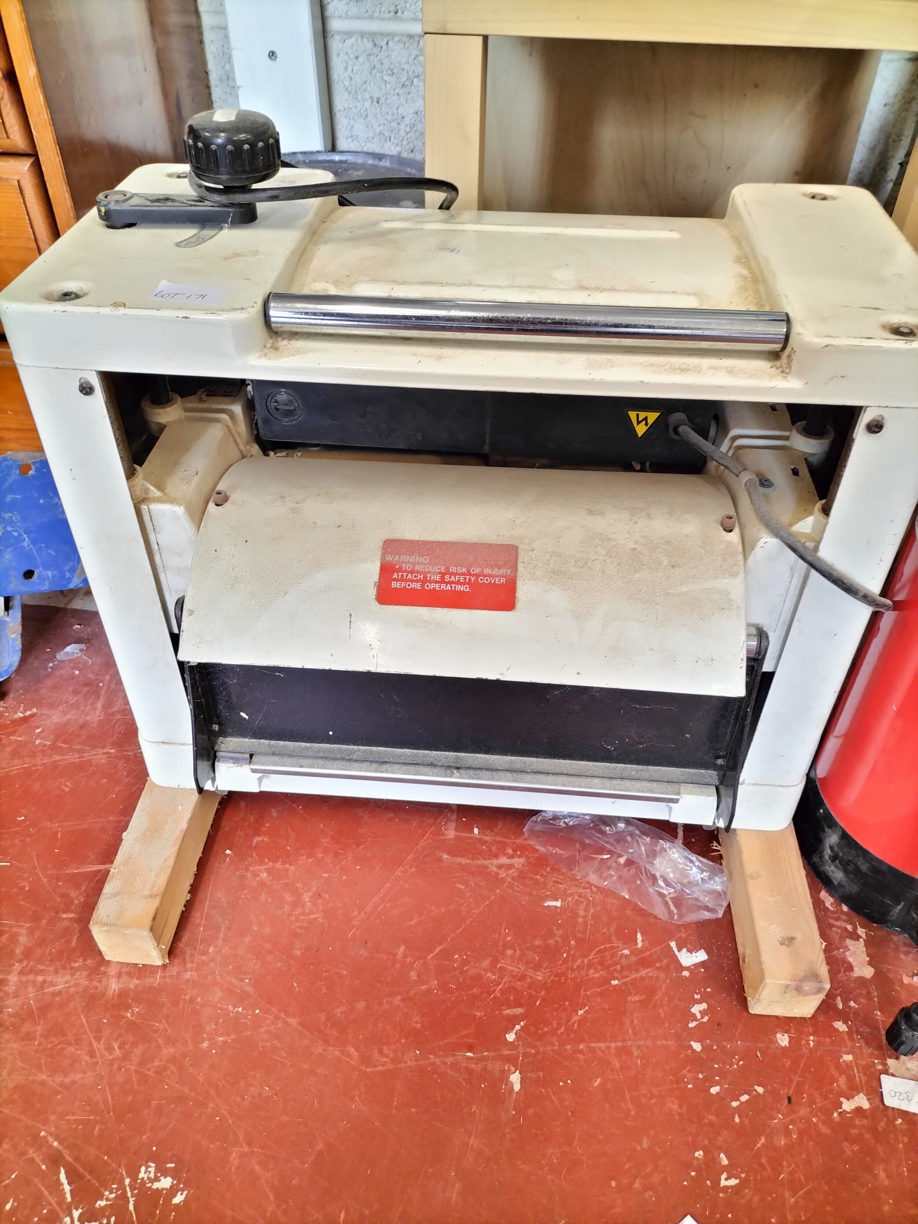 A white and black Axminster Power Tool Centre thickness planer featuring a red safety warning label on the protective cover and a black adjustment knob.