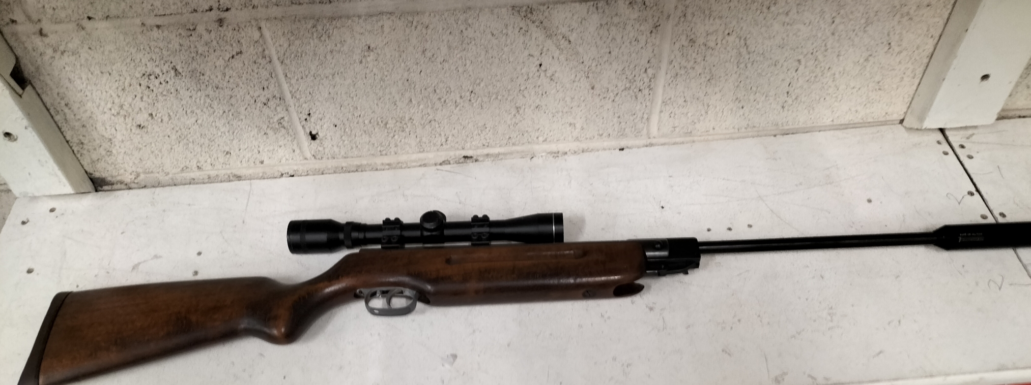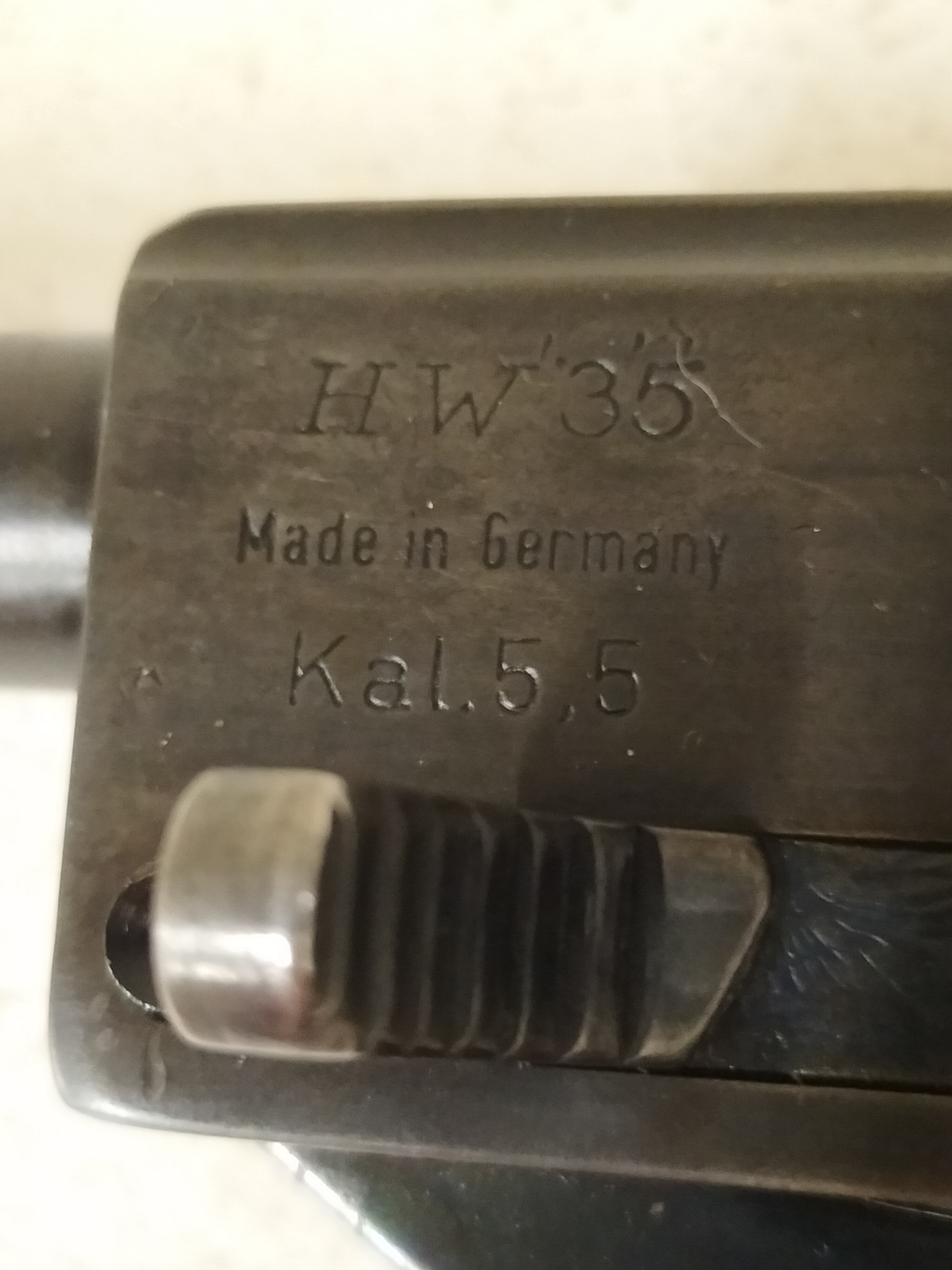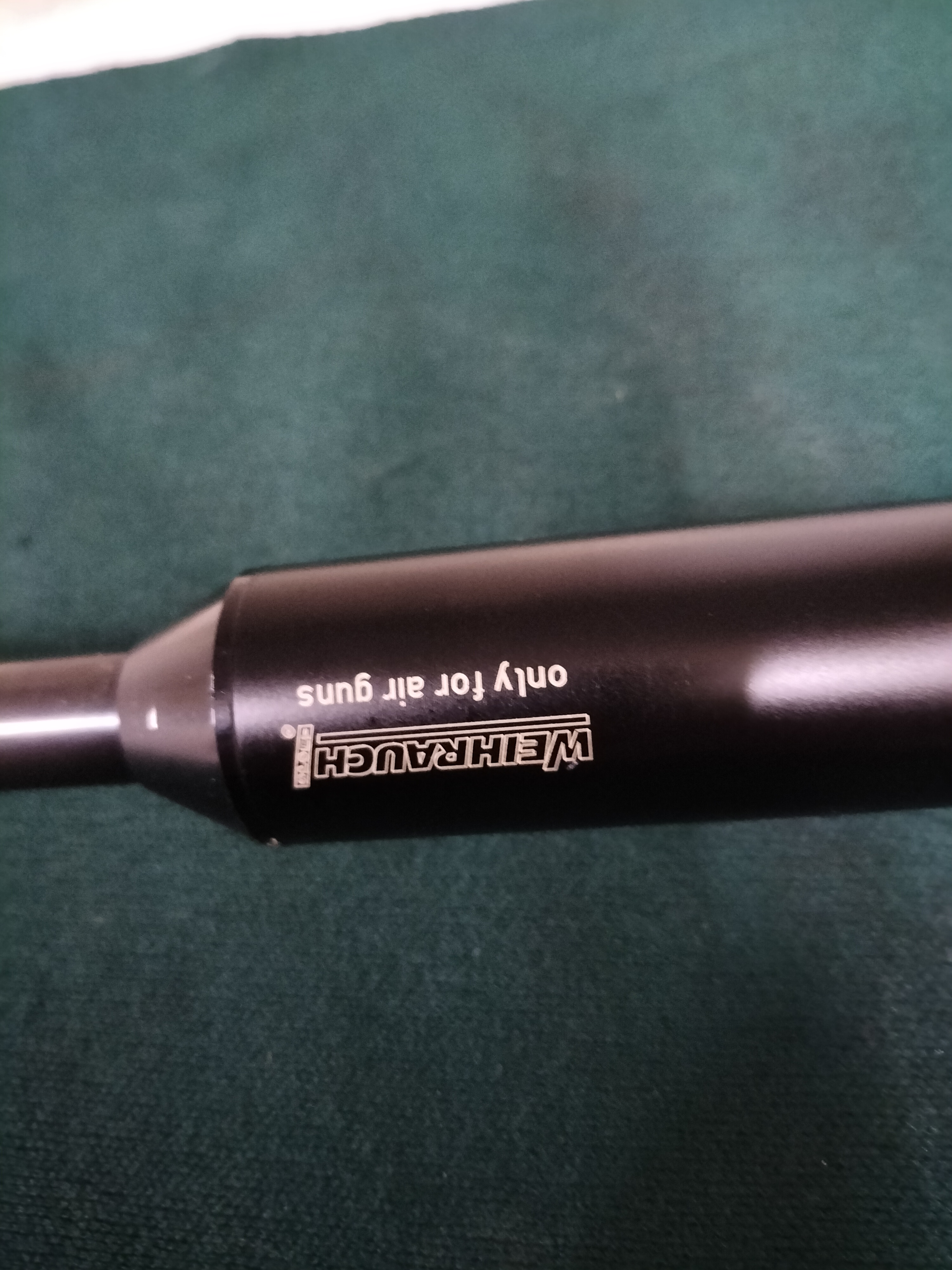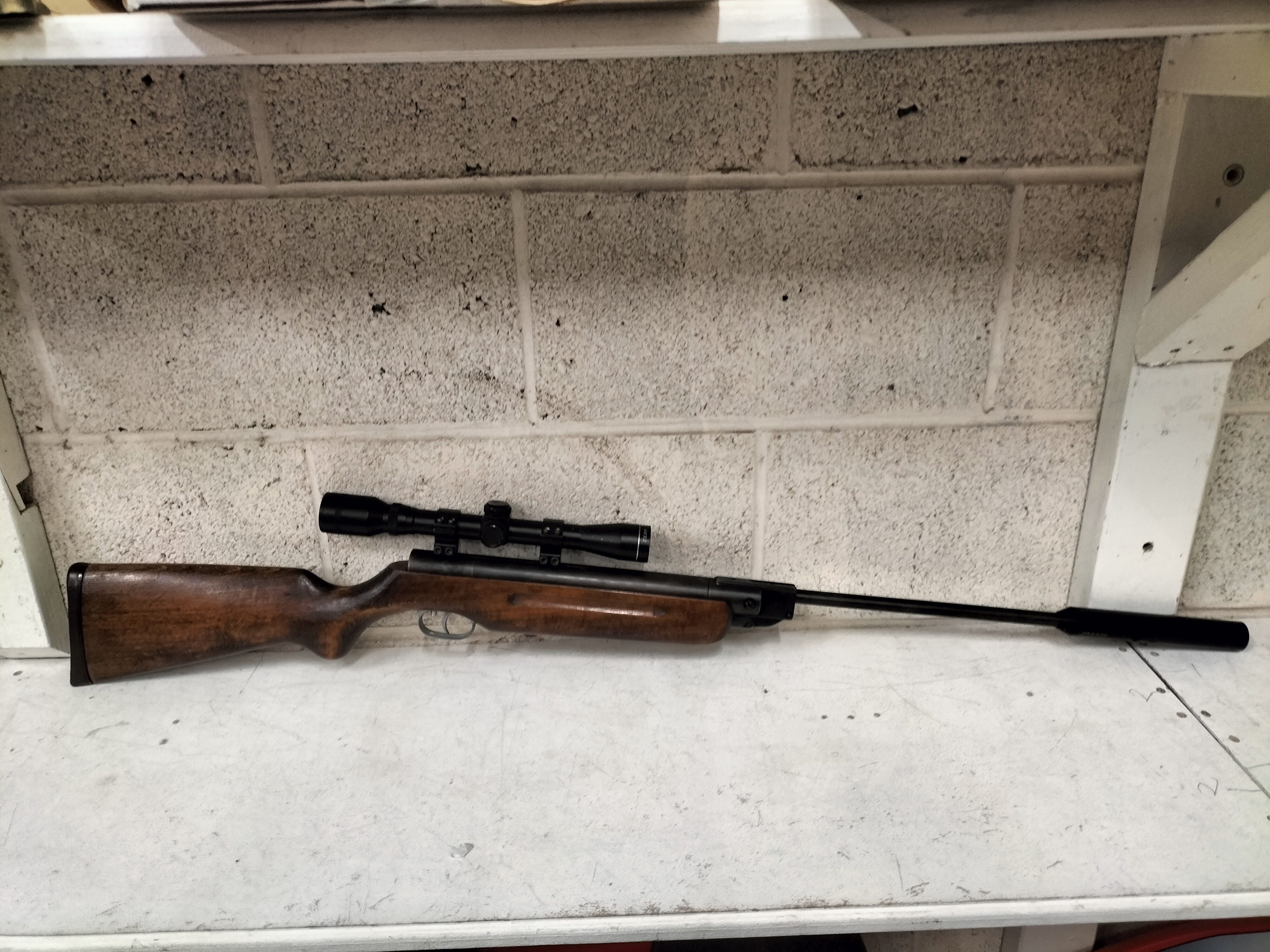 A Weihrauch HW 35 break-barrel air rifle in 5.5mm (0.22) calibre. The rifle features a dark-stained wooden stock with a Monte Carlo cheekpiece and a textured rubber butt pad. The blued steel receiver is stamped with the model designation HW 35, Made in Germany, and Kal. 5,5. This lot includes a 4×32 telescopic sight mounted to the receiver and a Weihrauch-branded sound moderator fitted to the barrel, which is marked only for air guns. The rifle utilises a barrel latch mechanism for cocking.