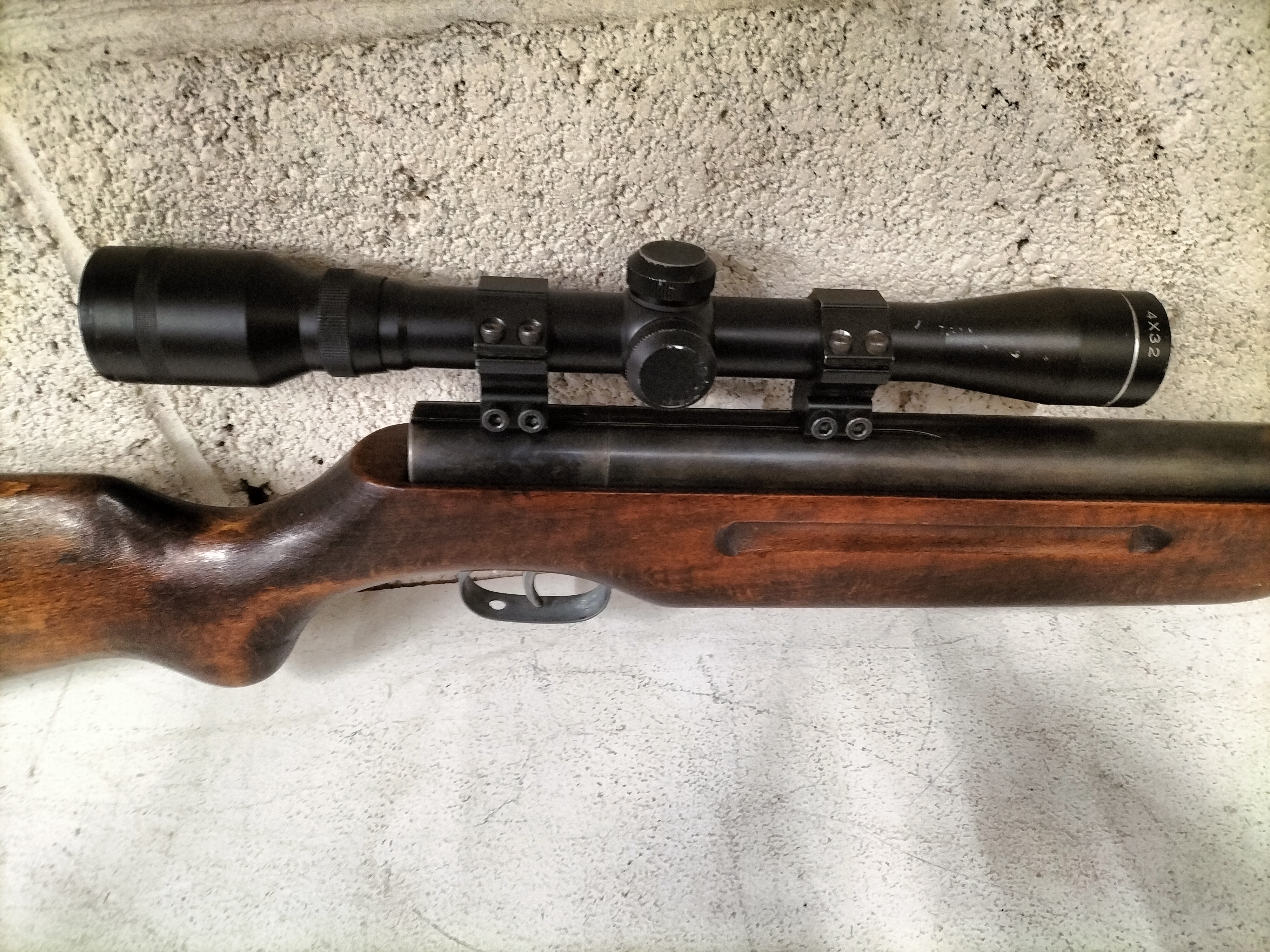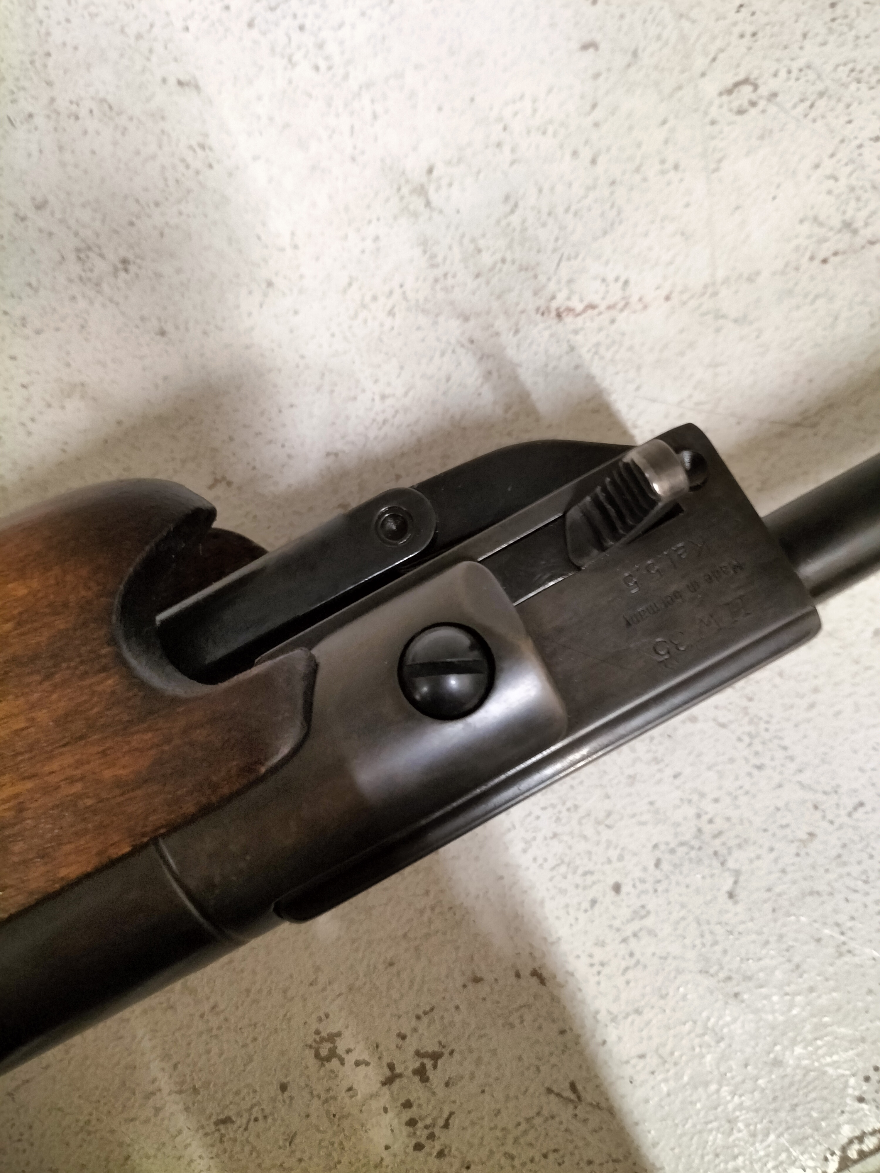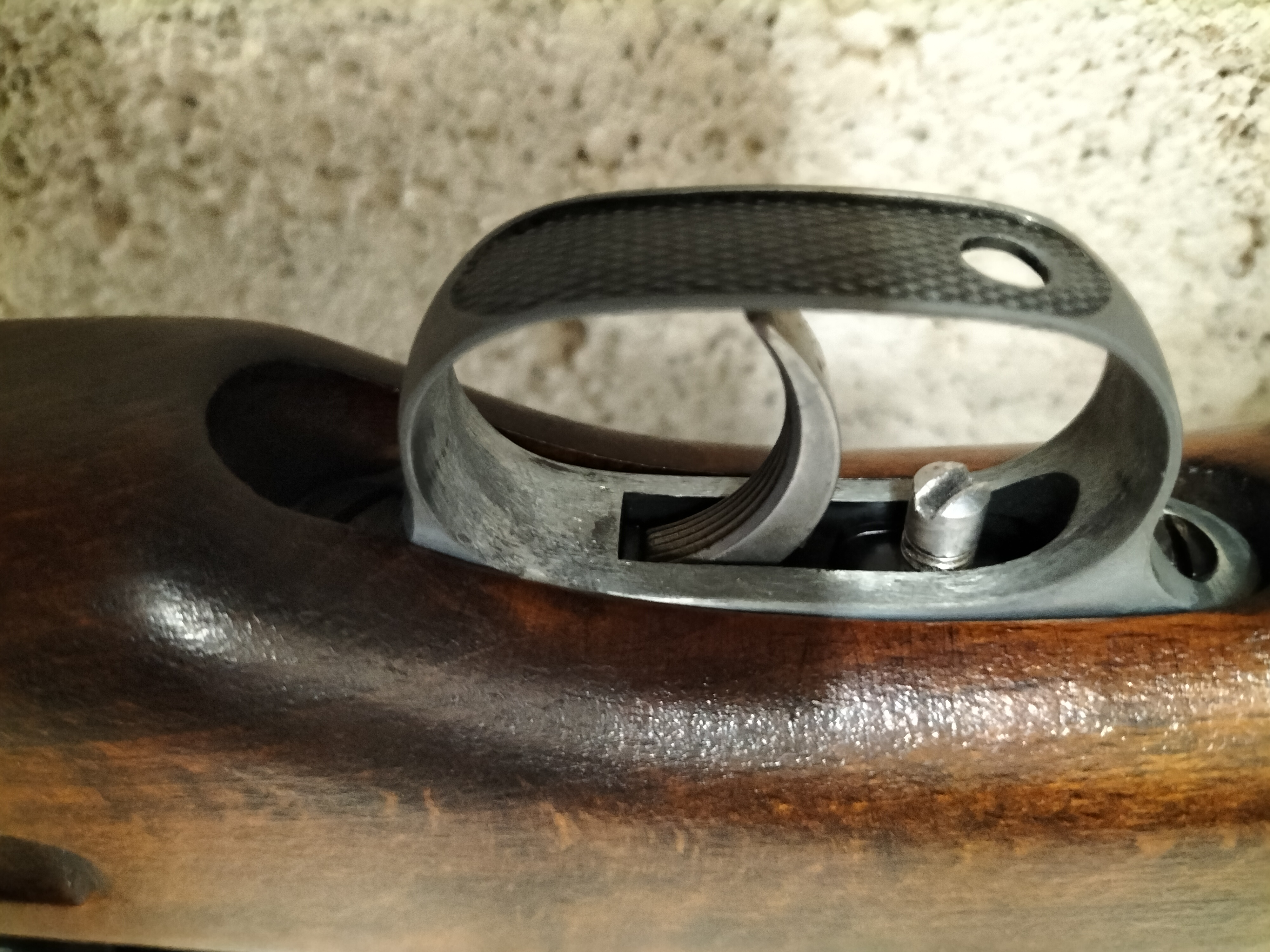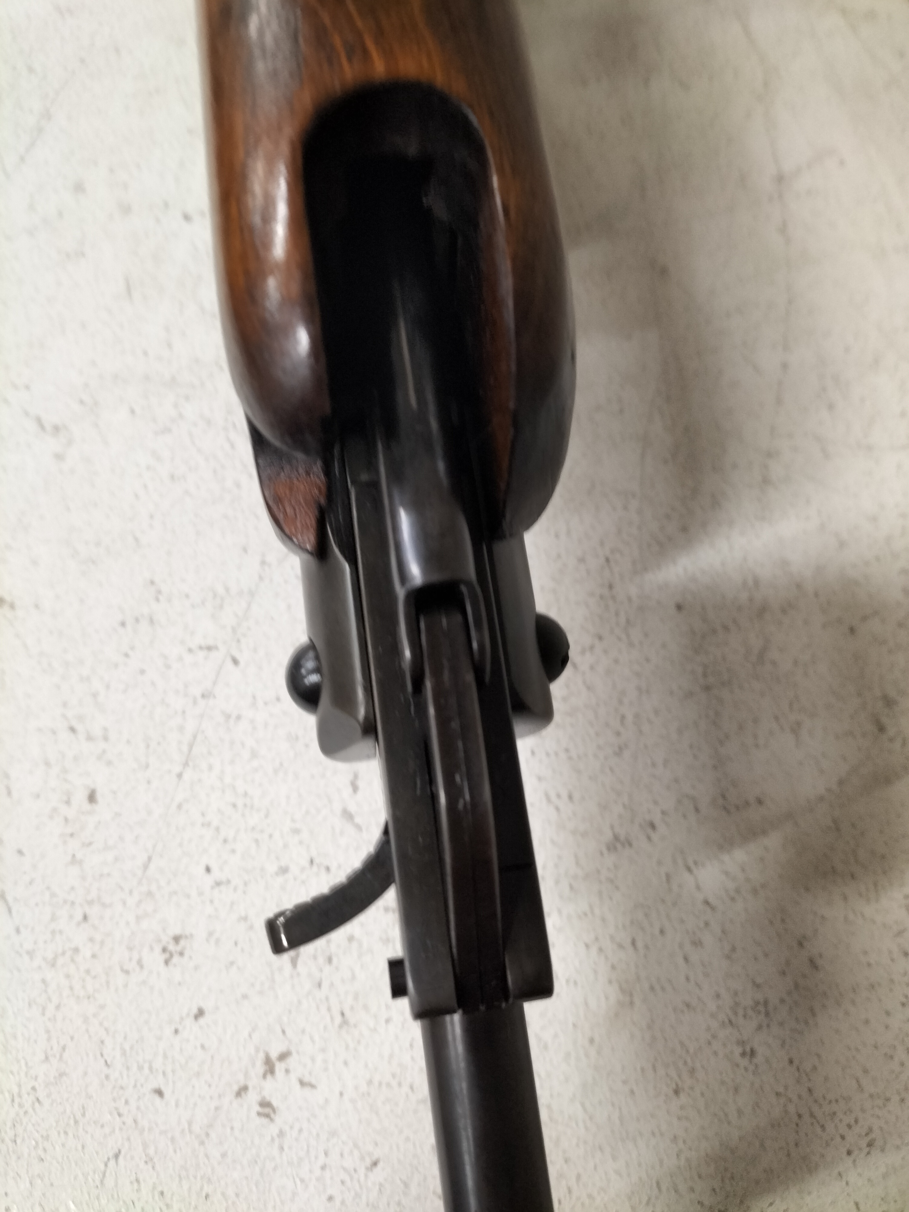 The rifle is in used condition. The wooden stock shows minor surface scratches and small dings consistent with use. There is light wear to the blued finish on the metal components, most notably around the trigger guard and the barrel latch mechanism.