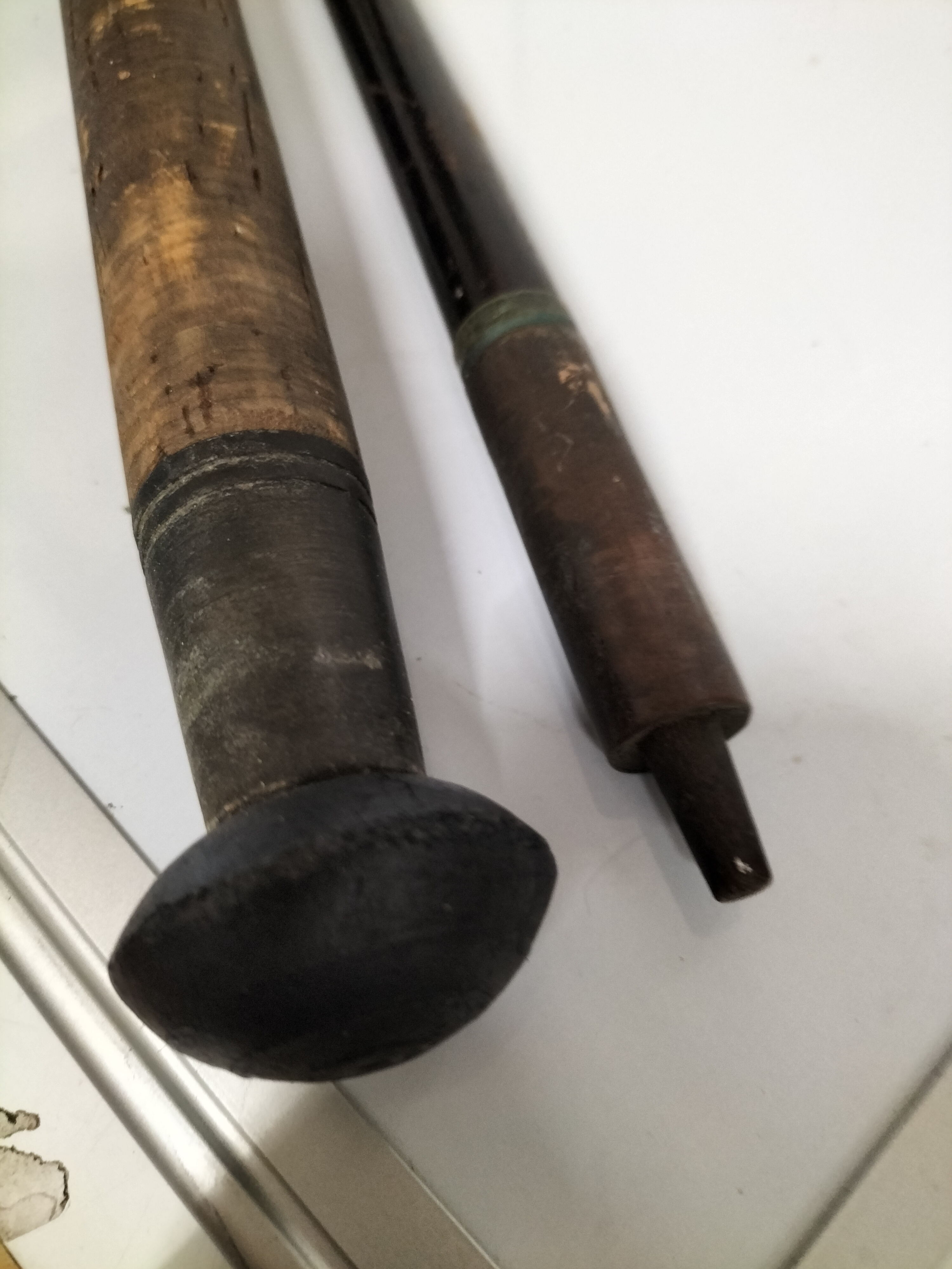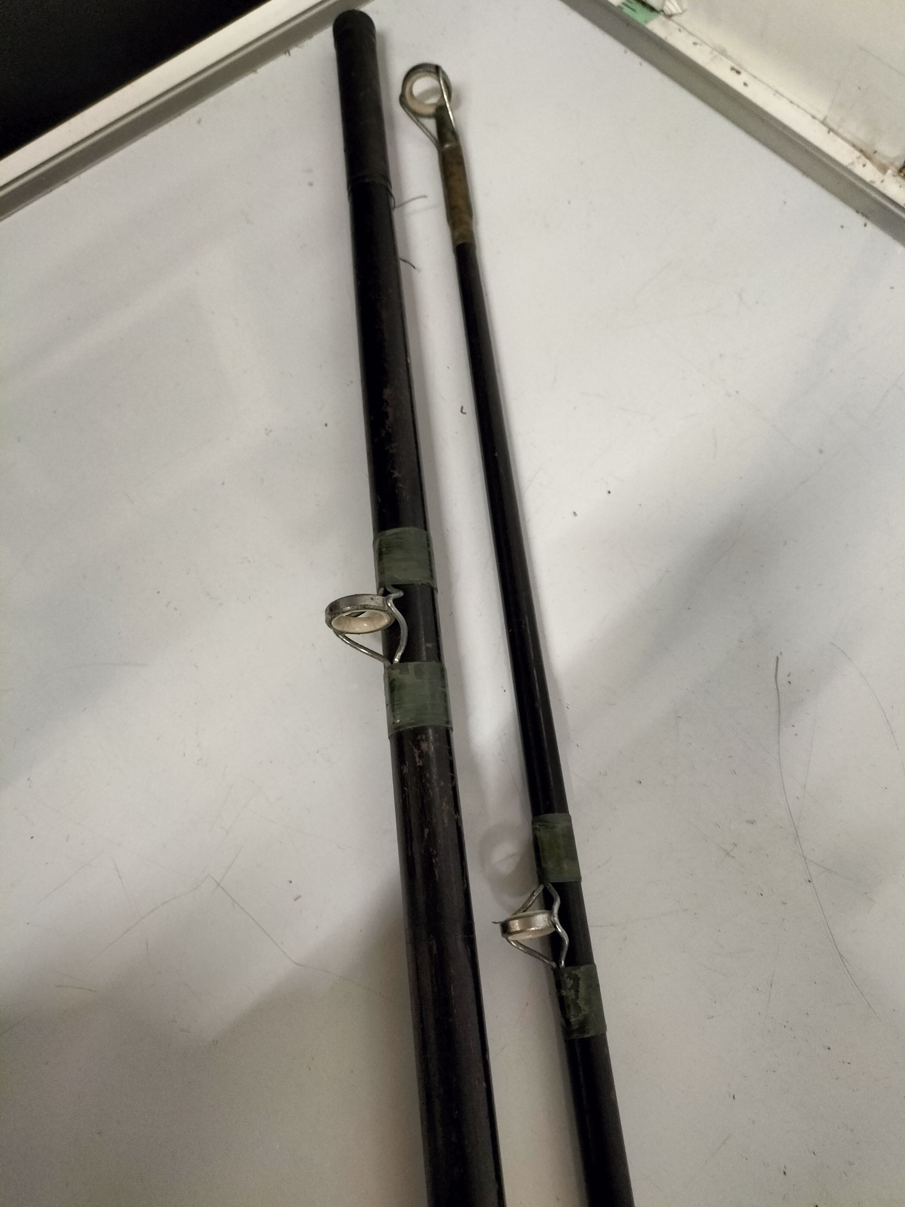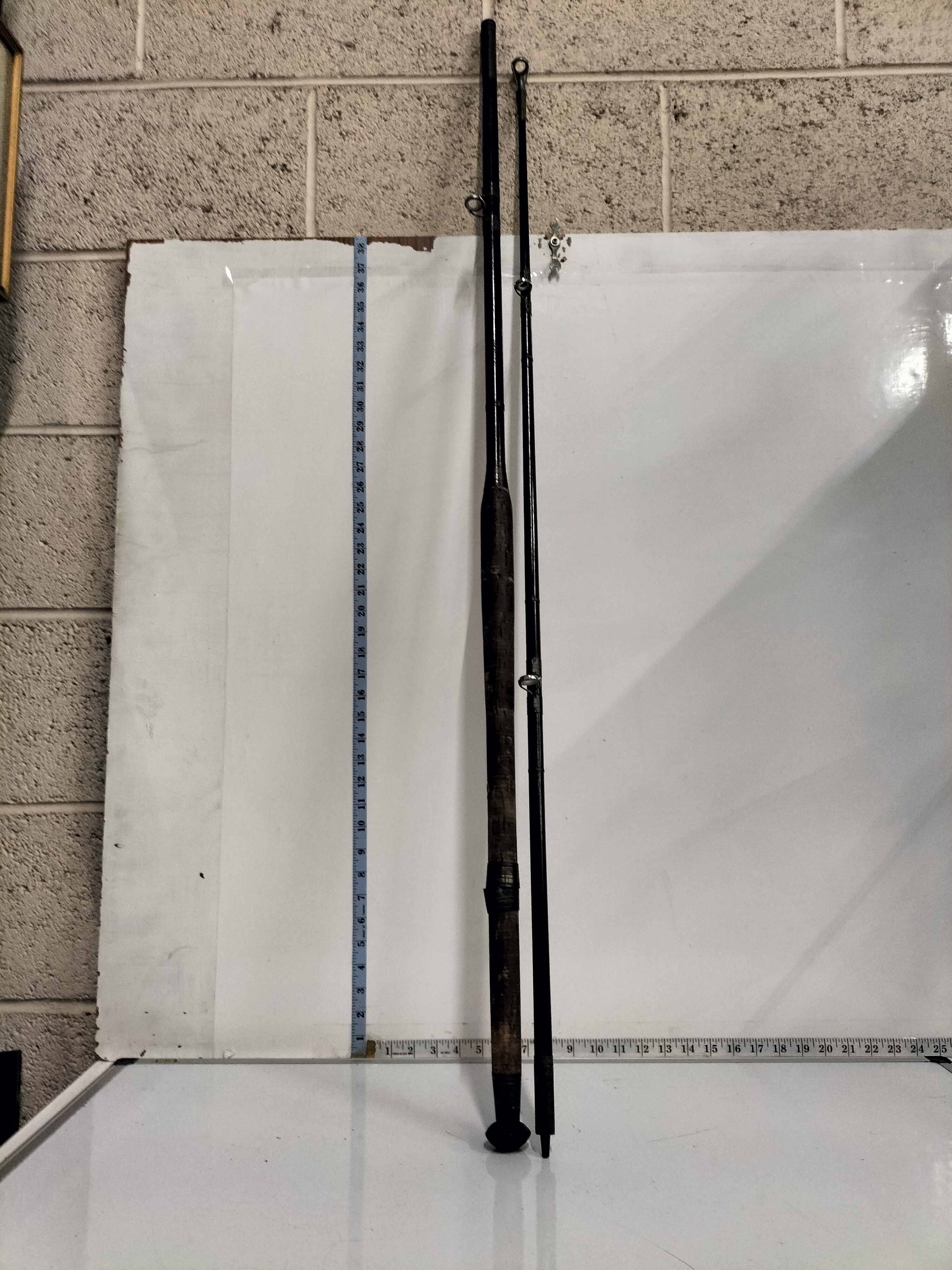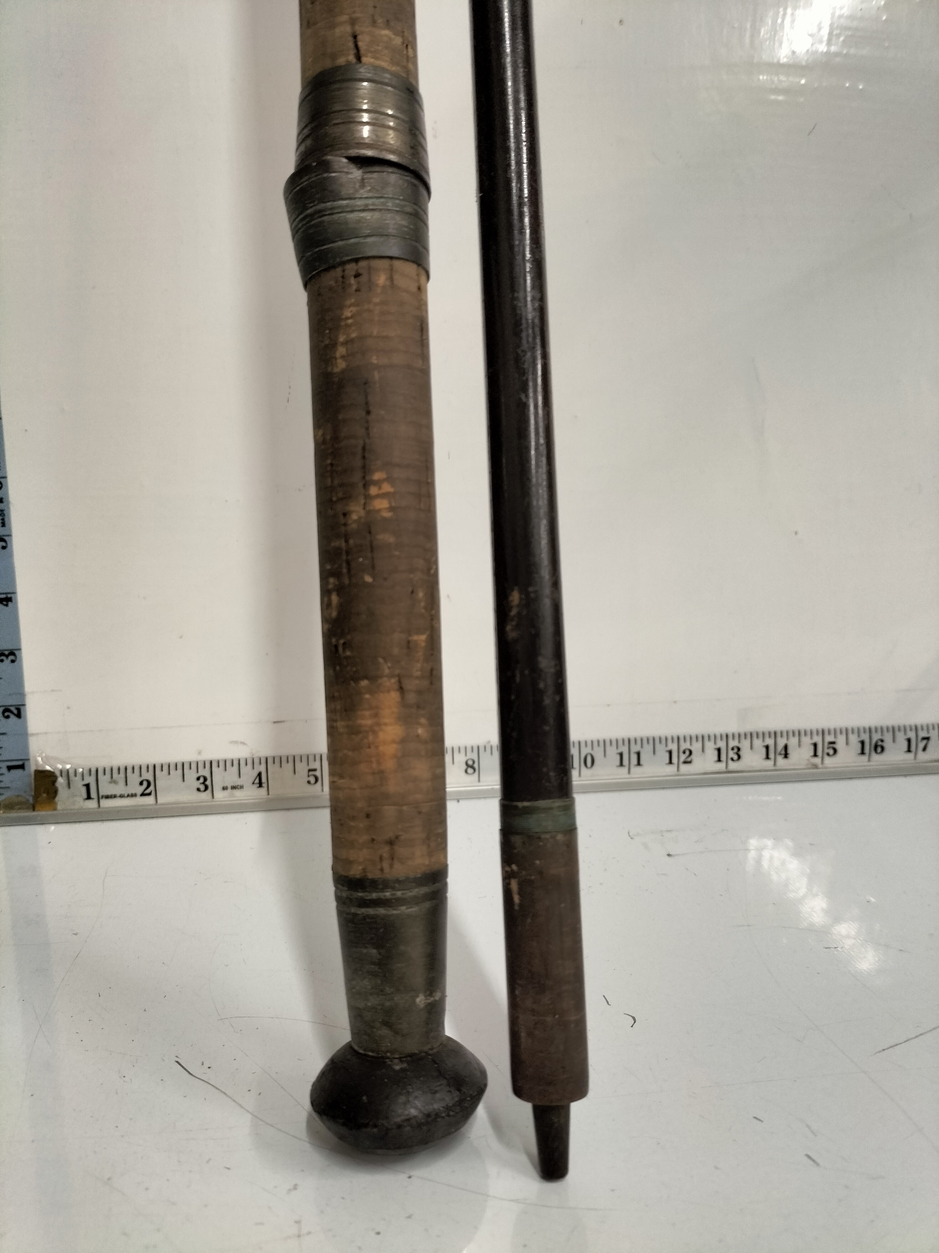A two-piece fishing rod featuring a black shaft and tan cork handle, with sections measuring approximately 38 inches in length.