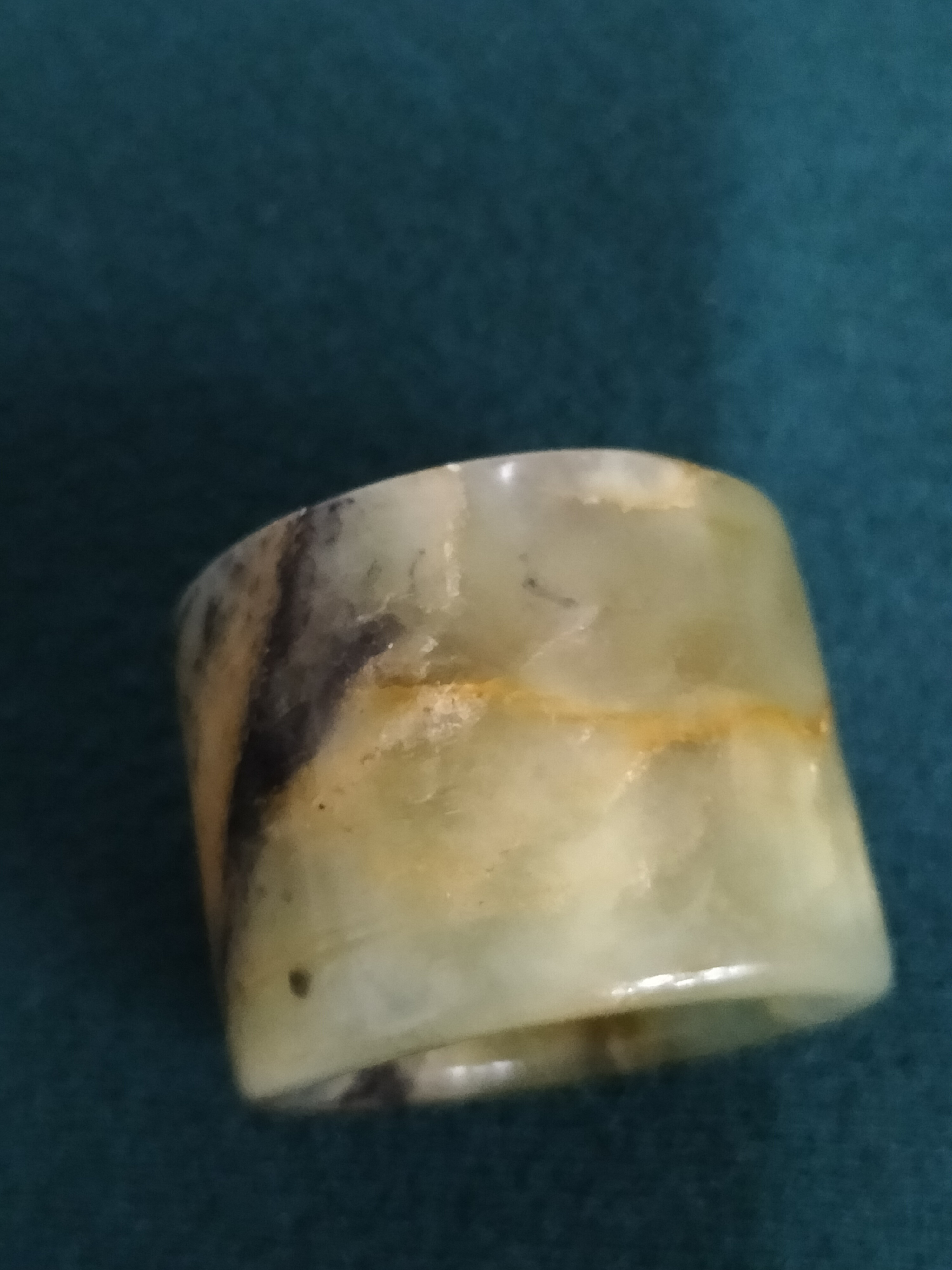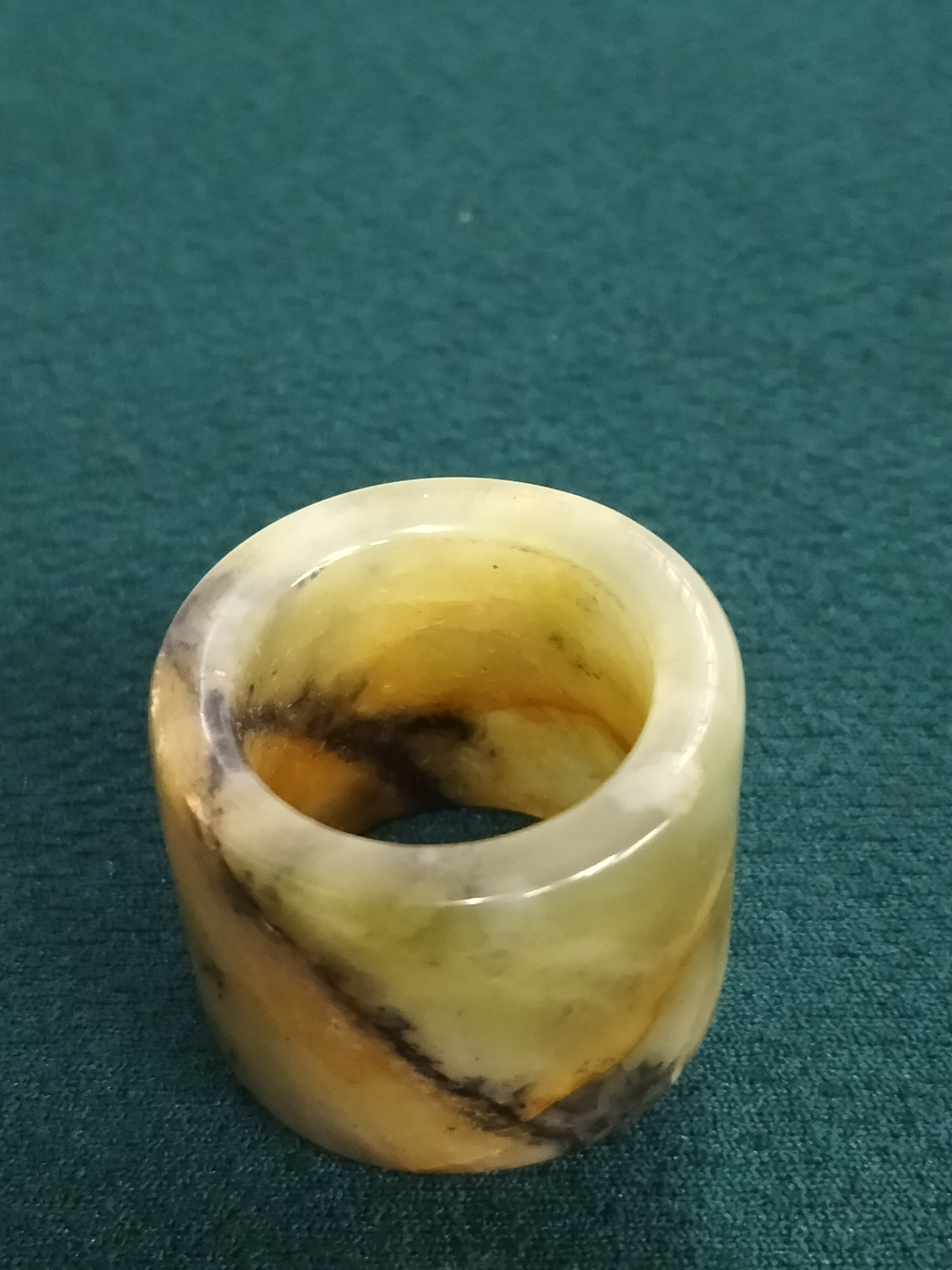 A single stone thumb ring featuring variegated shades of pale green, yellow, orange, and dark brown marbled patterns.