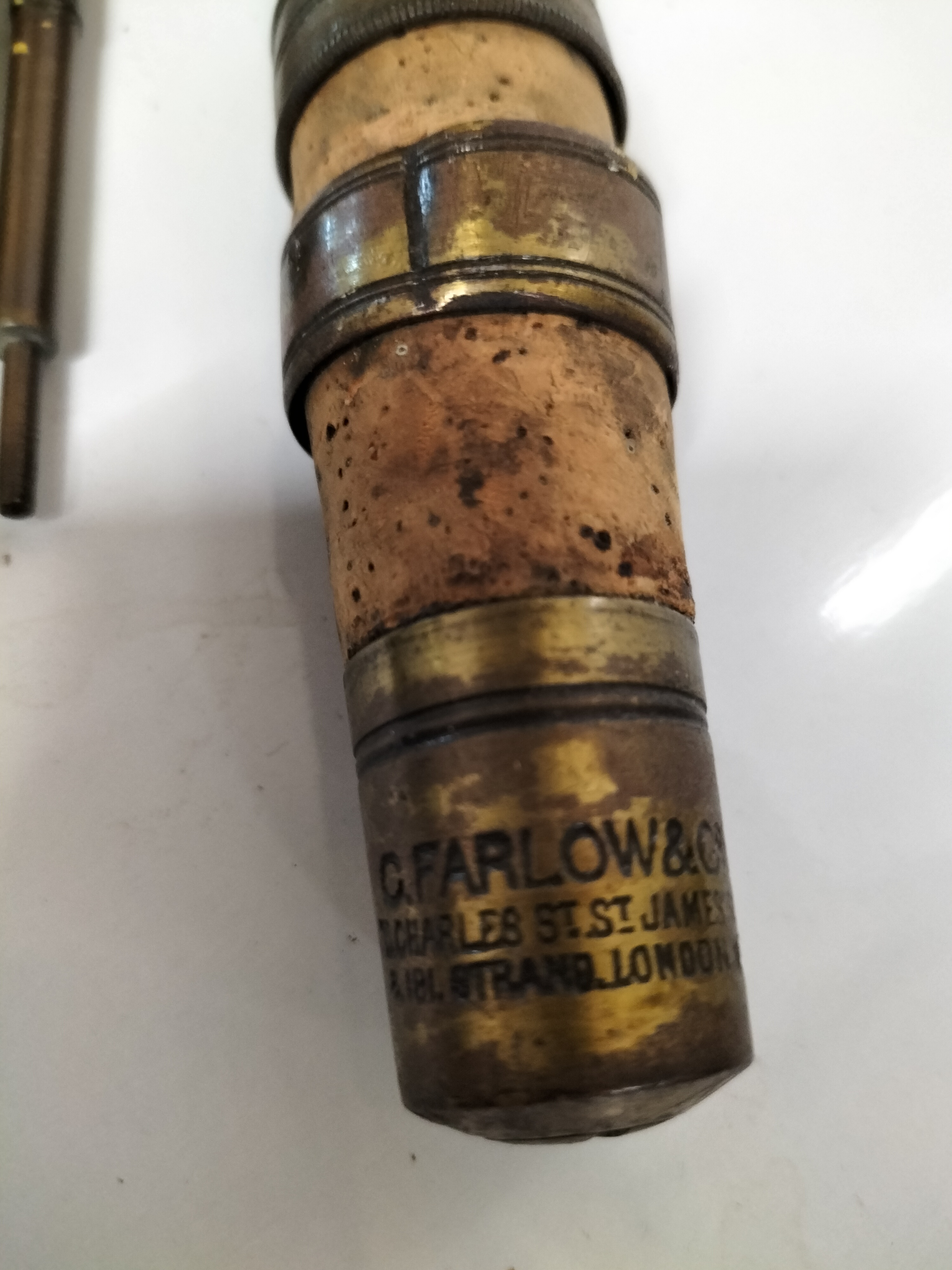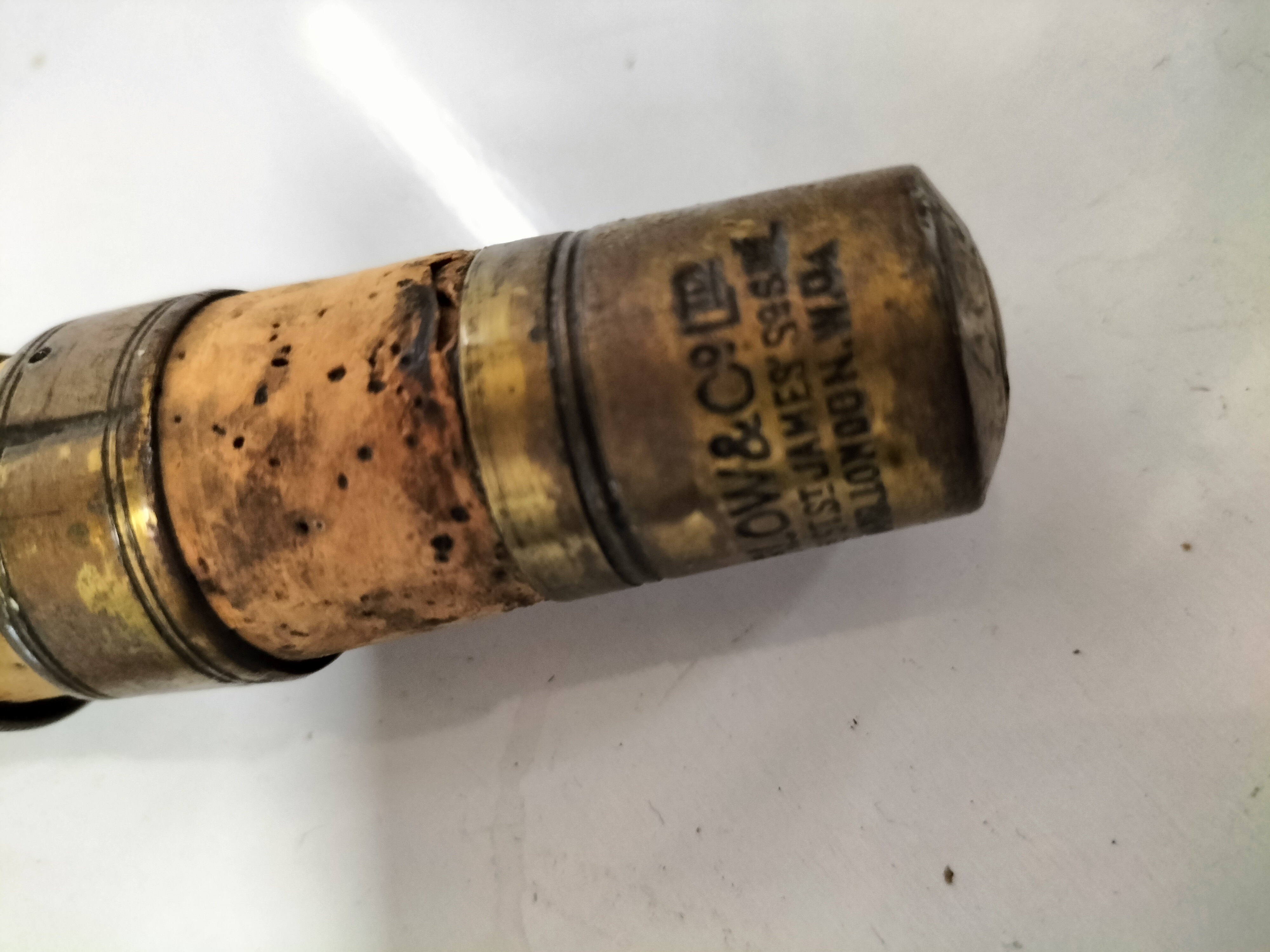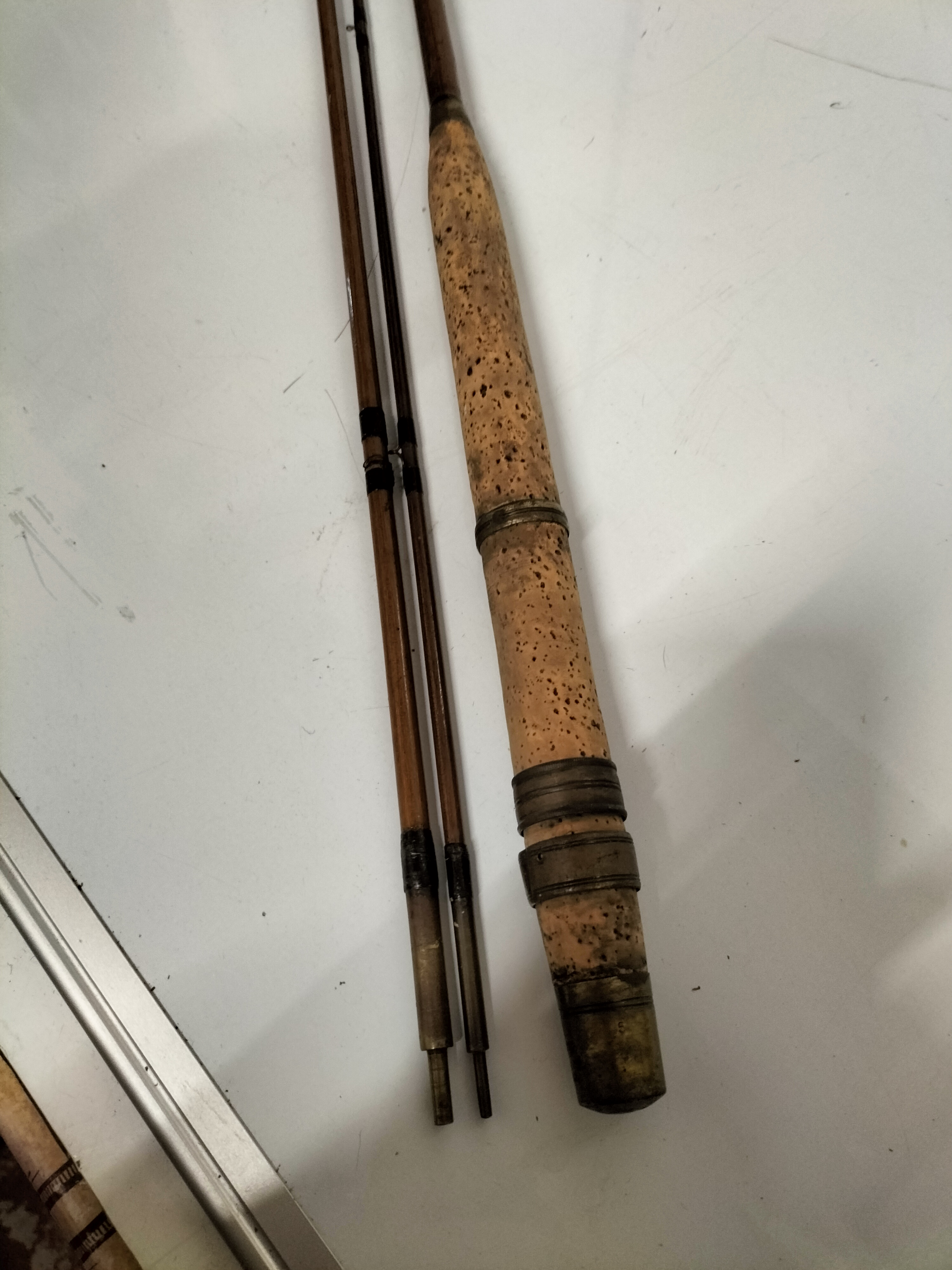 The item exhibits signs of significant age and use. The cork handle shows pitting and discoloration. There is a heavy patina to the metal components. Wear is present to the rod\'s finish and the guide wrappings.