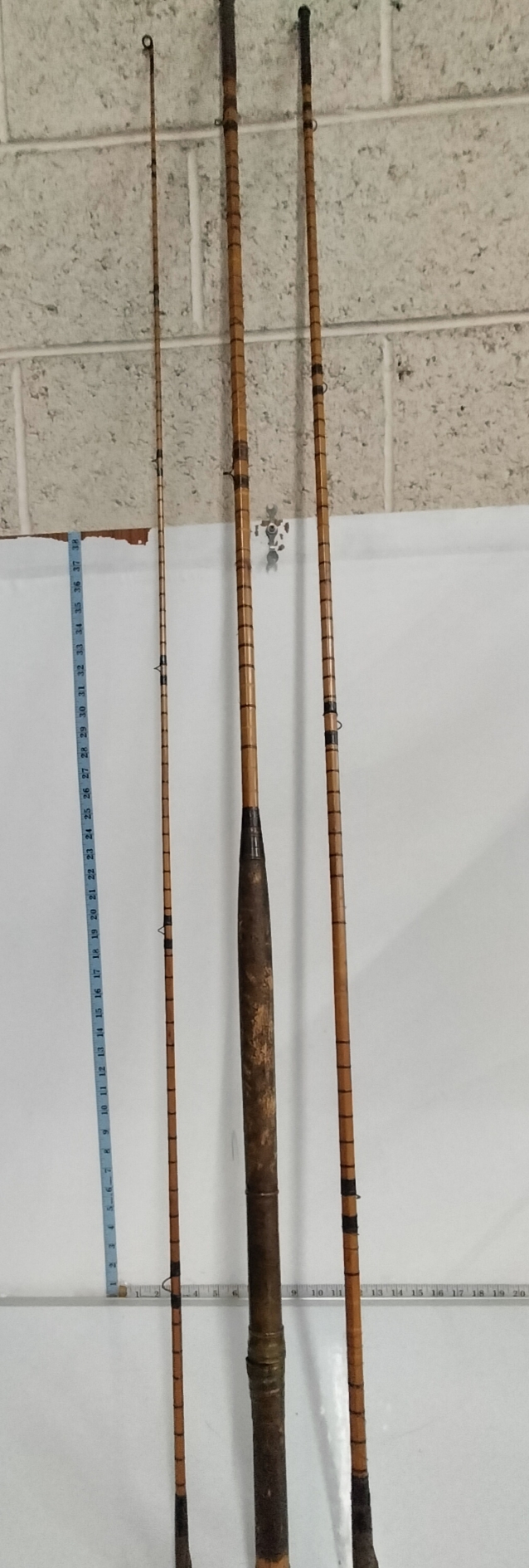 A collection of tan and dark brown bamboo fishing rod sections featuring various guide rings and measuring approximately 38 inches in length.