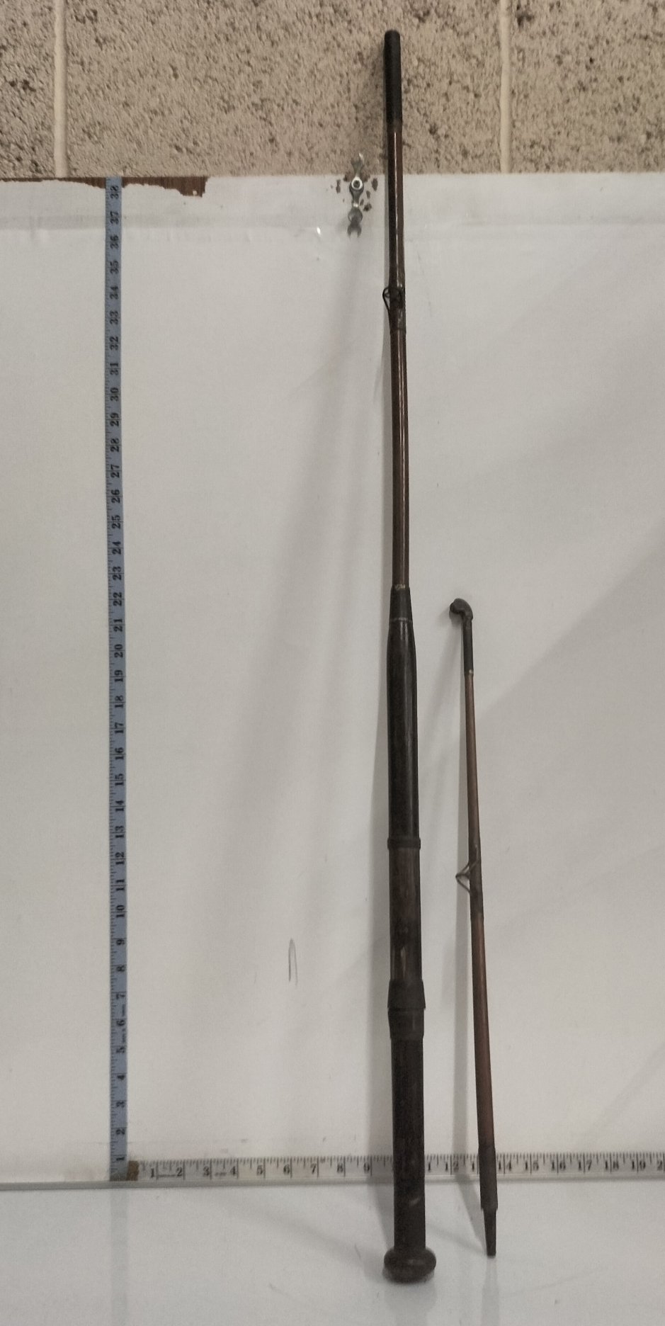 A collection of vintage brown and dark-handled fishing rod sections, with the longest section measuring approximately 37 inches.
