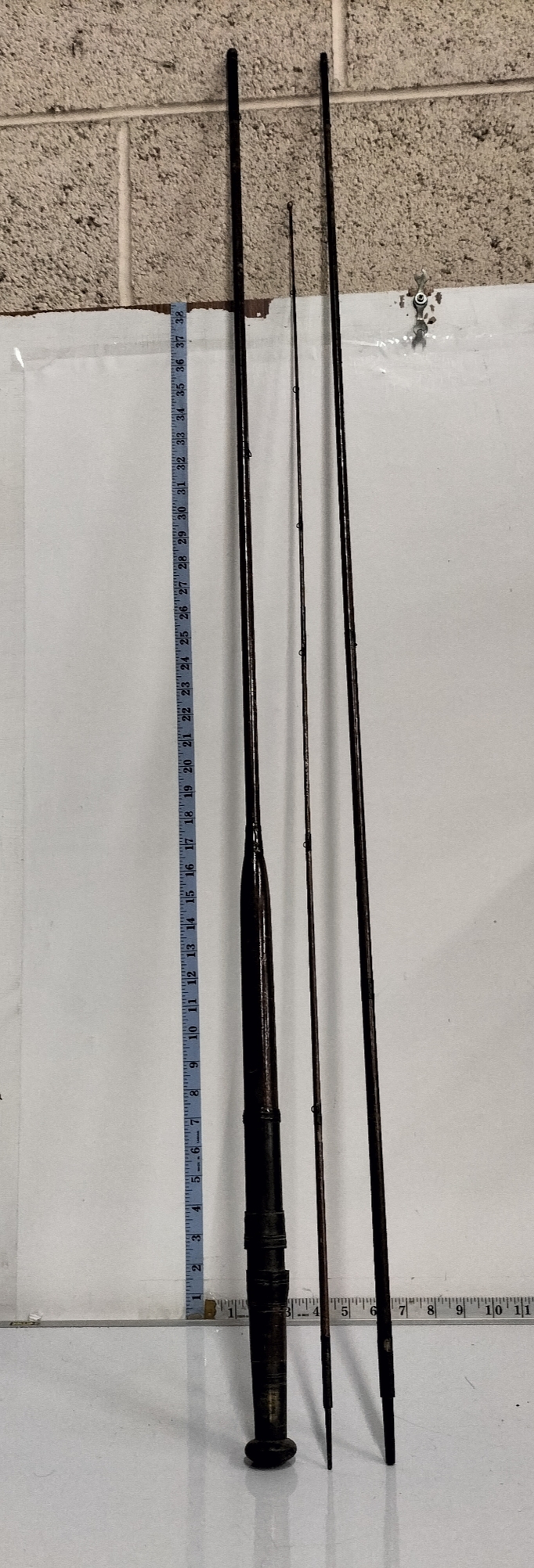 Three dark brown fishing rod sections with no visible maker’s marks, measuring approximately 38 inches in length.