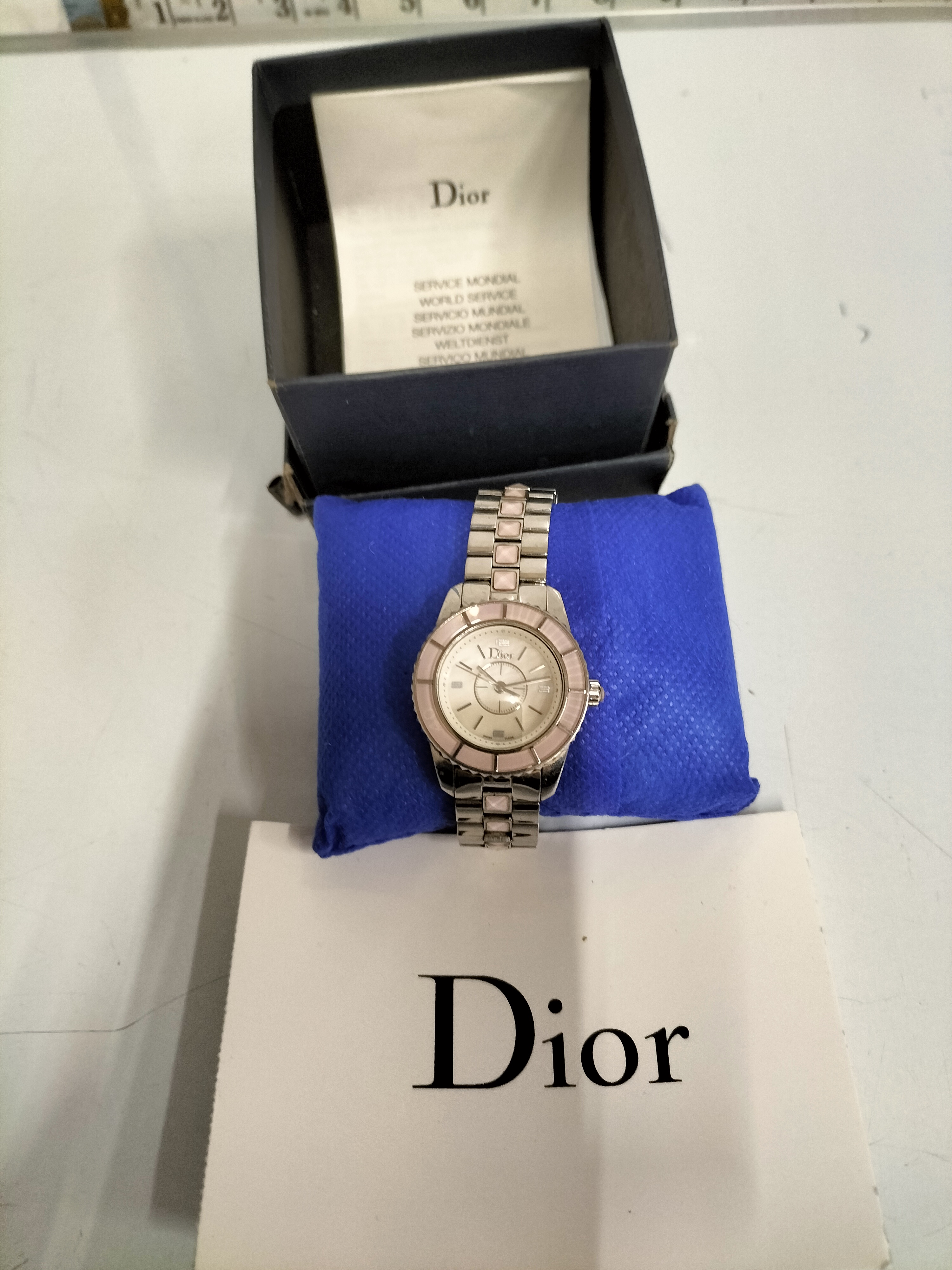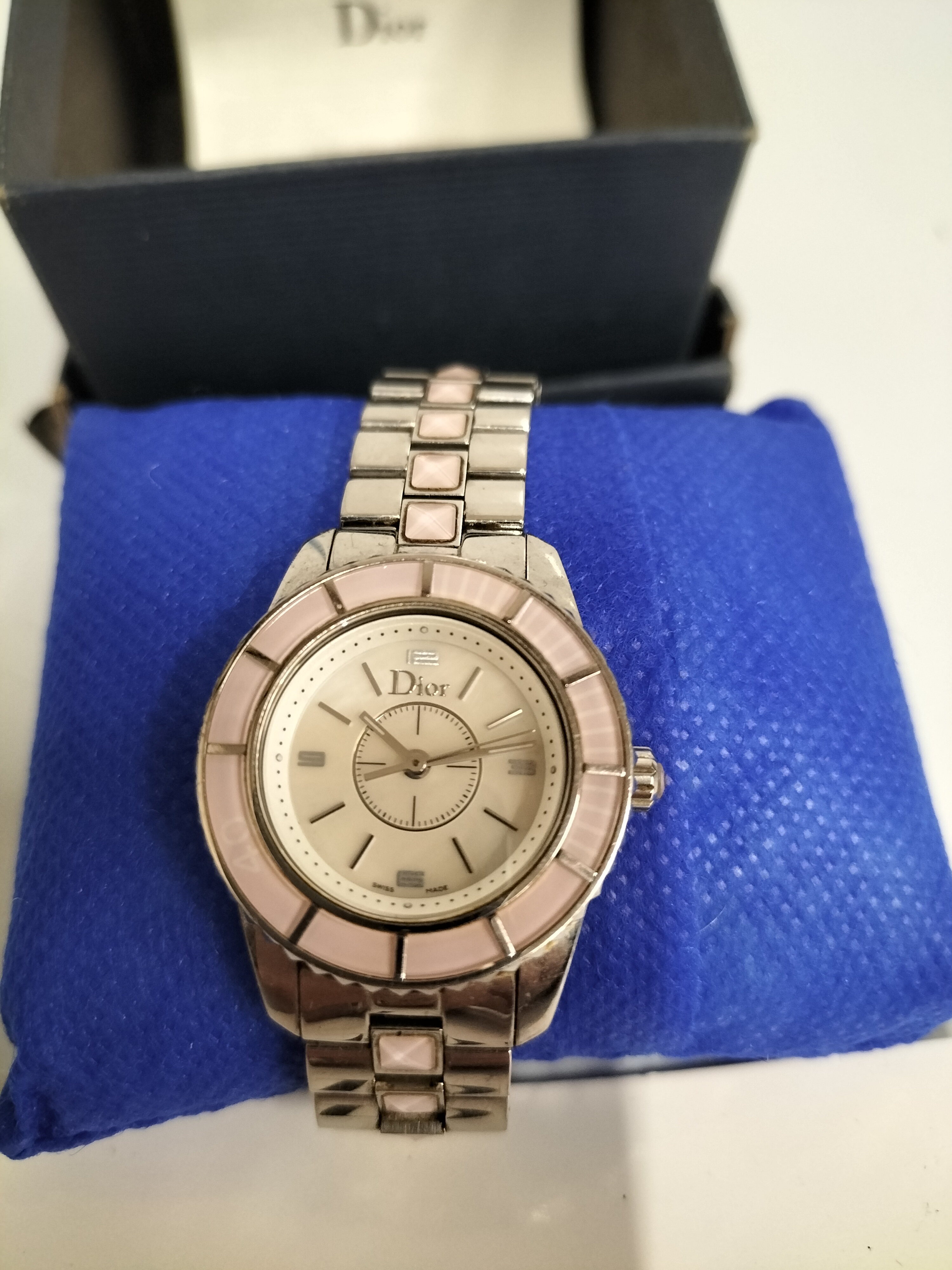 A silver-toned and pink Christian Dior Christal wristwatch featuring a white dial marked Swiss Made, presented with its original branded box and service booklet.