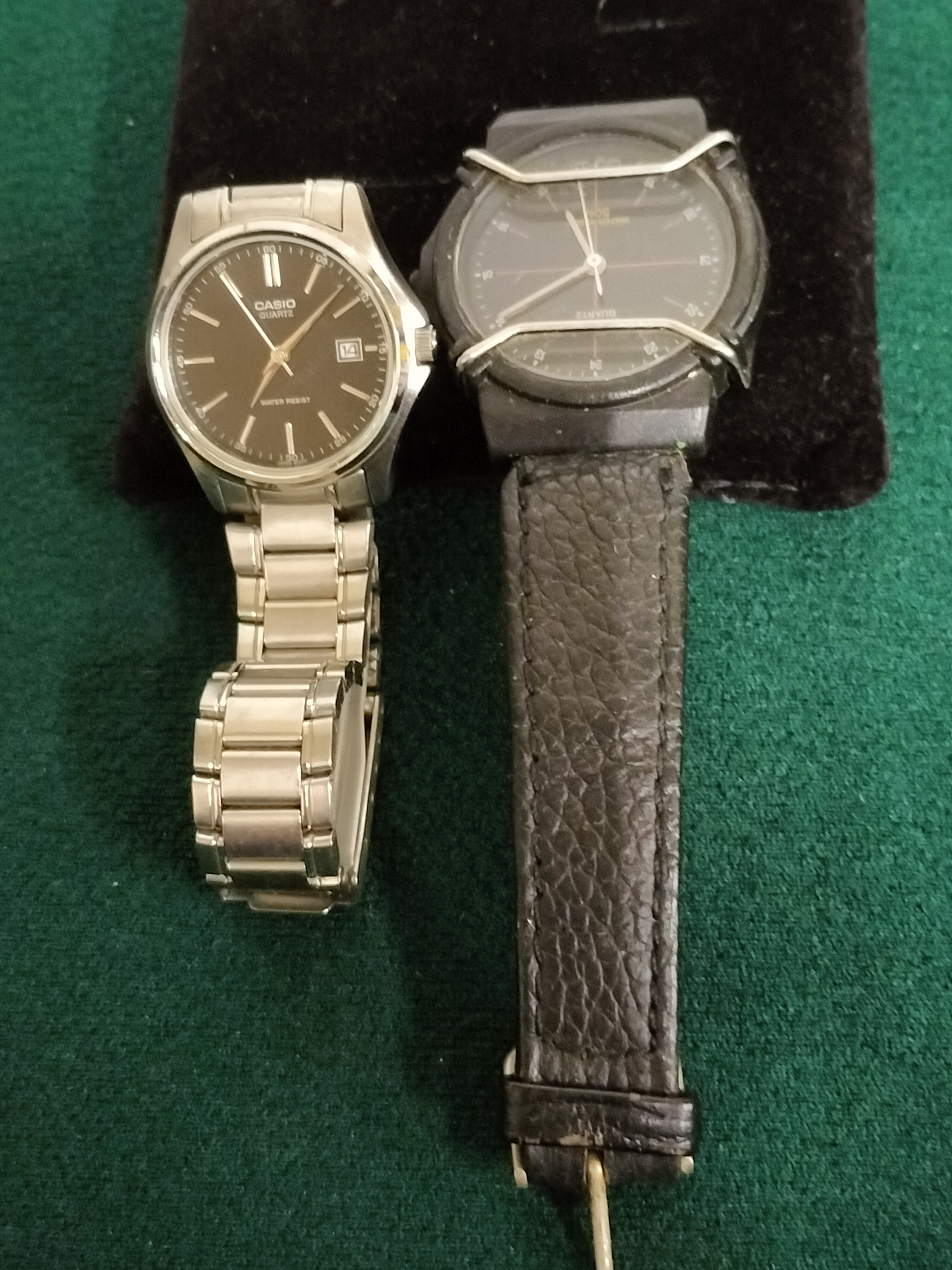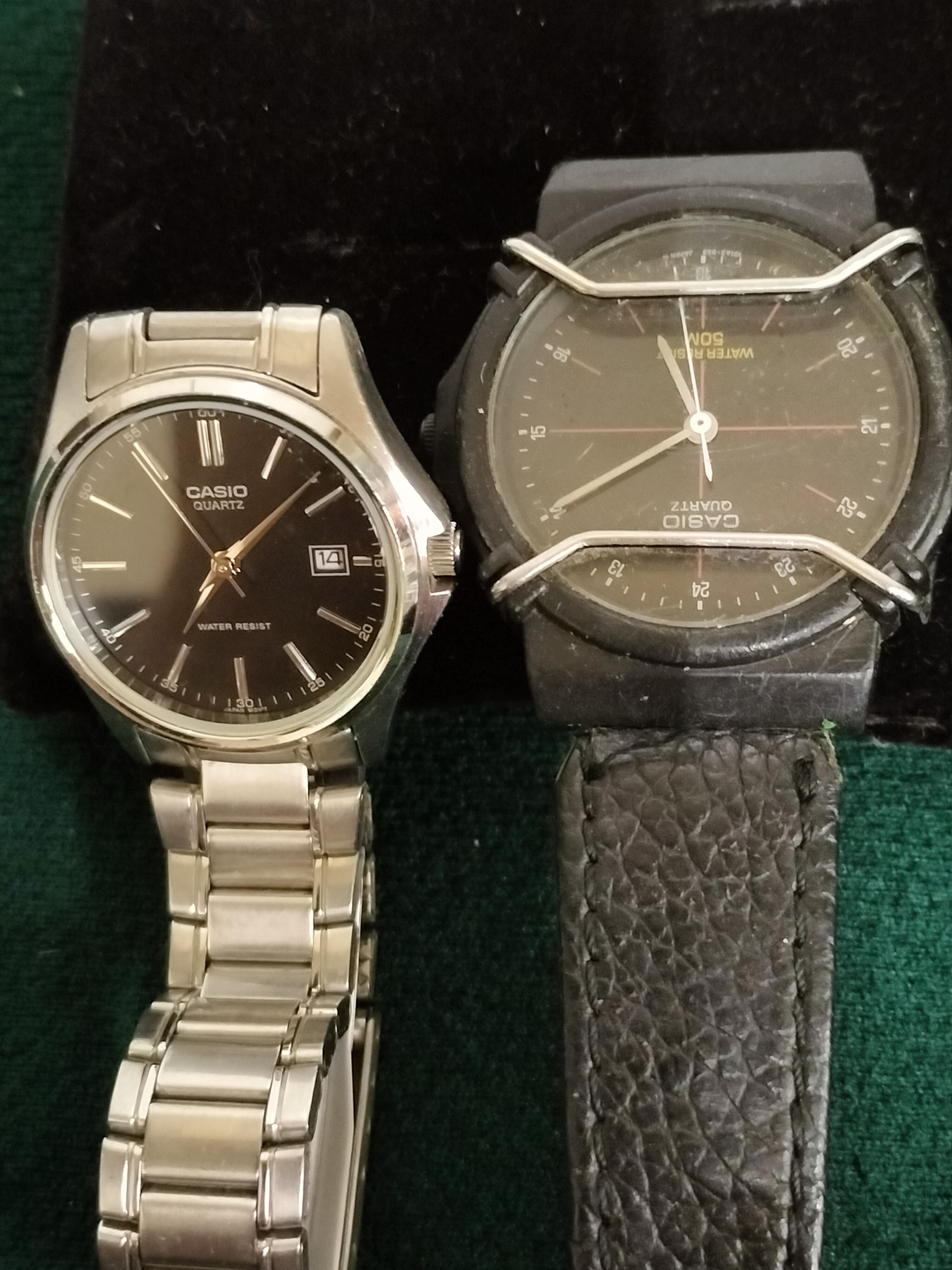 A pair of Casio Quartz wristwatches comprising a silver tone stainless steel model with a black dial and date window, and a black model with protective bars and a textured strap.