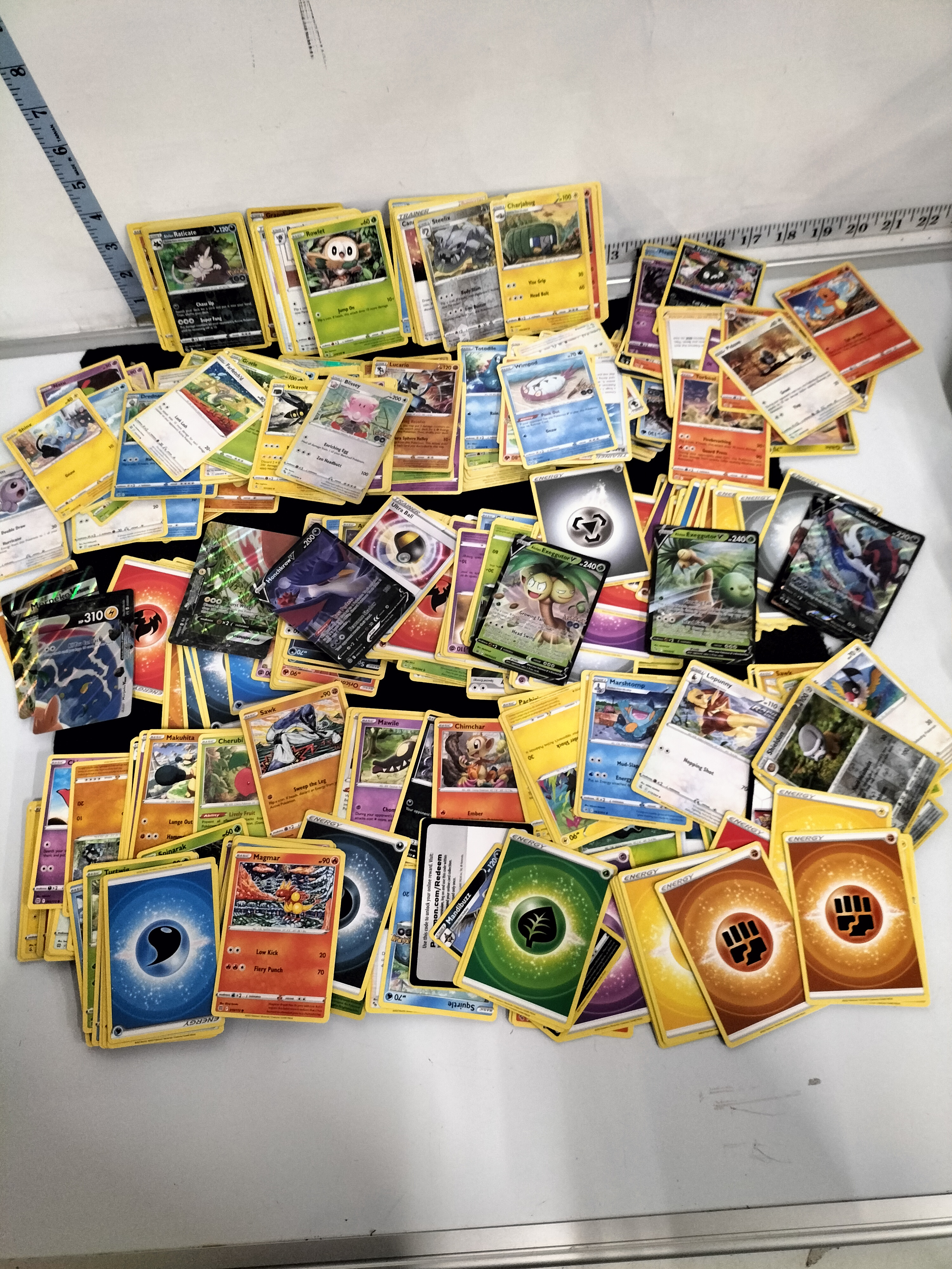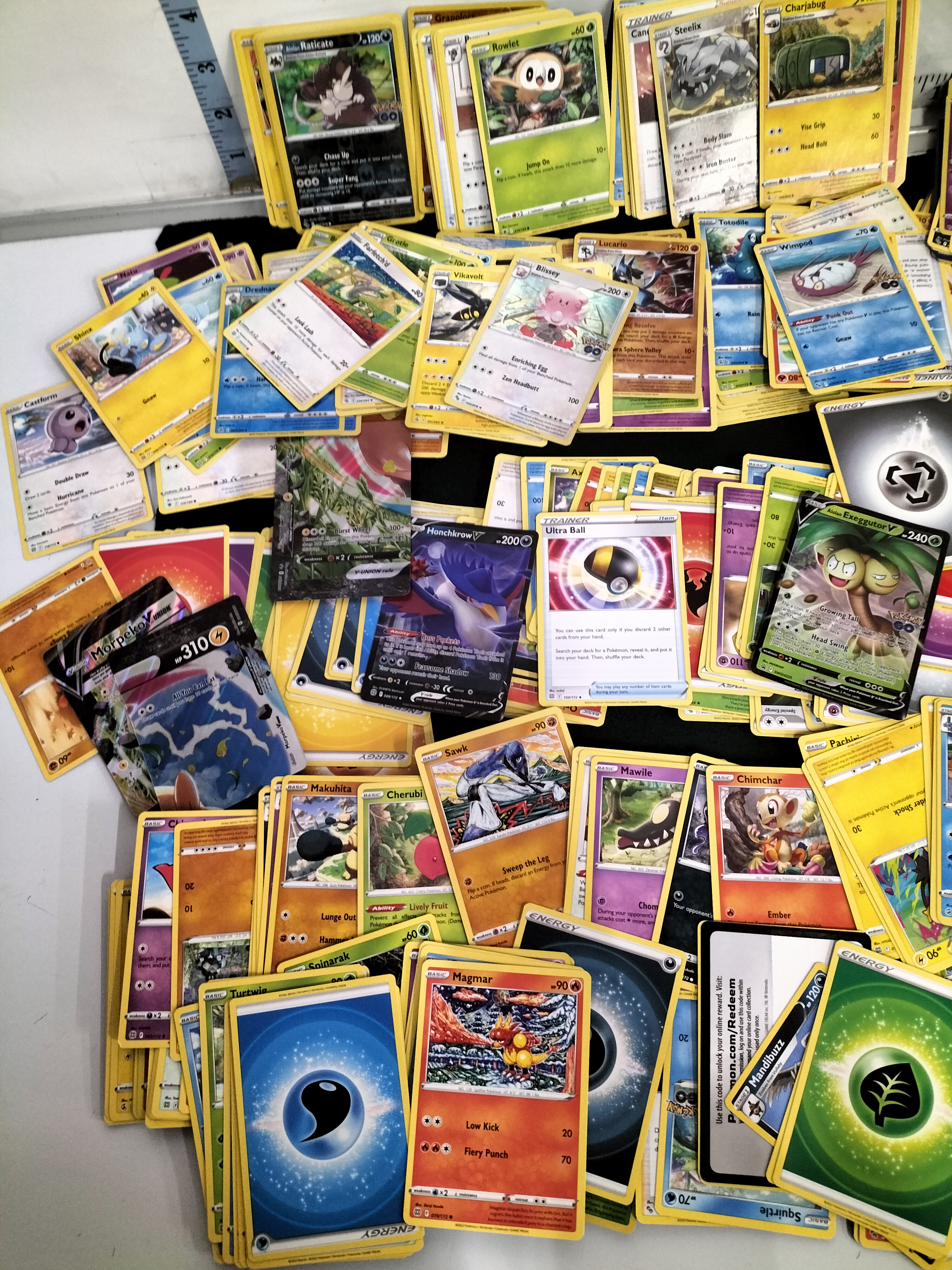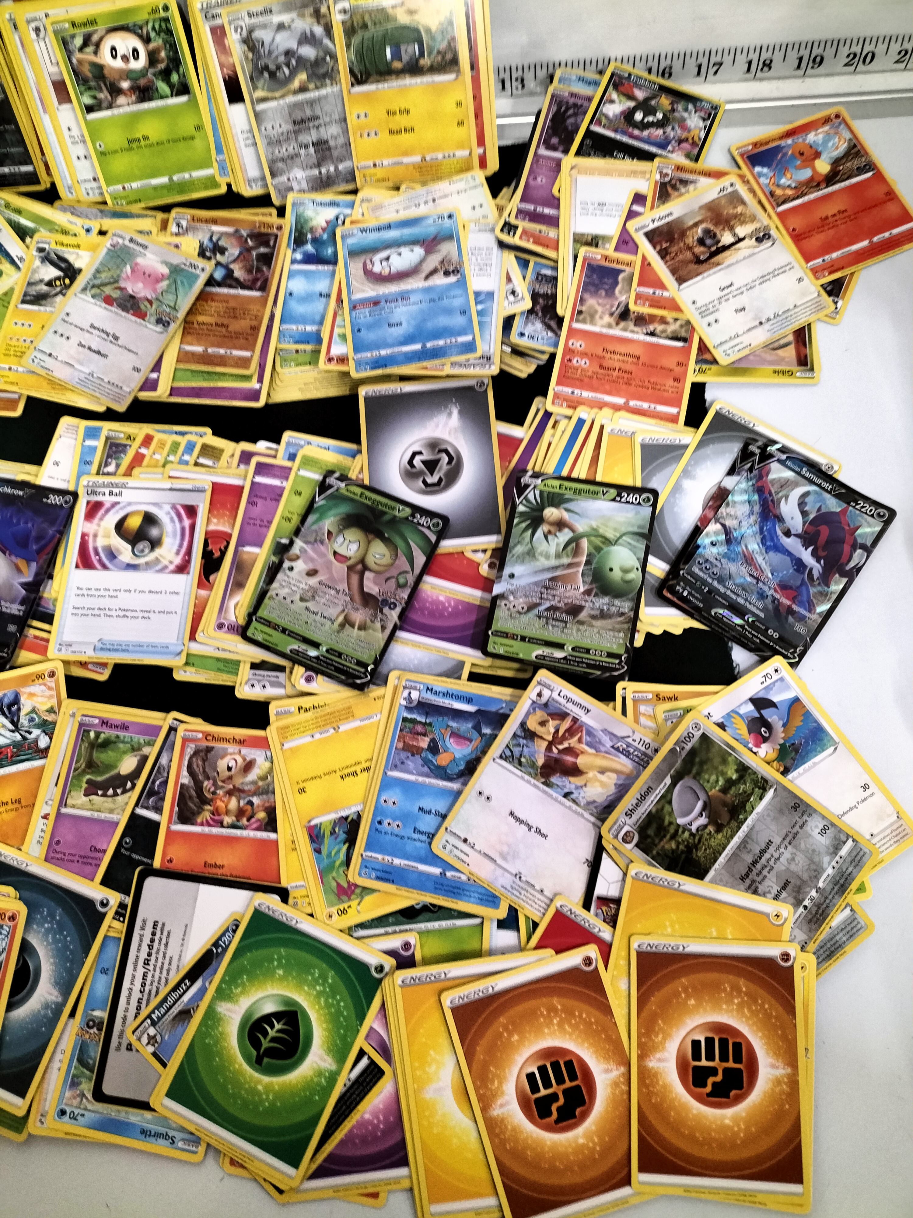 A collection of multicoloured Pokémon trading cards including character cards such as Alolan Exeggutor V, Hisuian Samurott V, and Magmar, alongside Trainer and Energy cards.