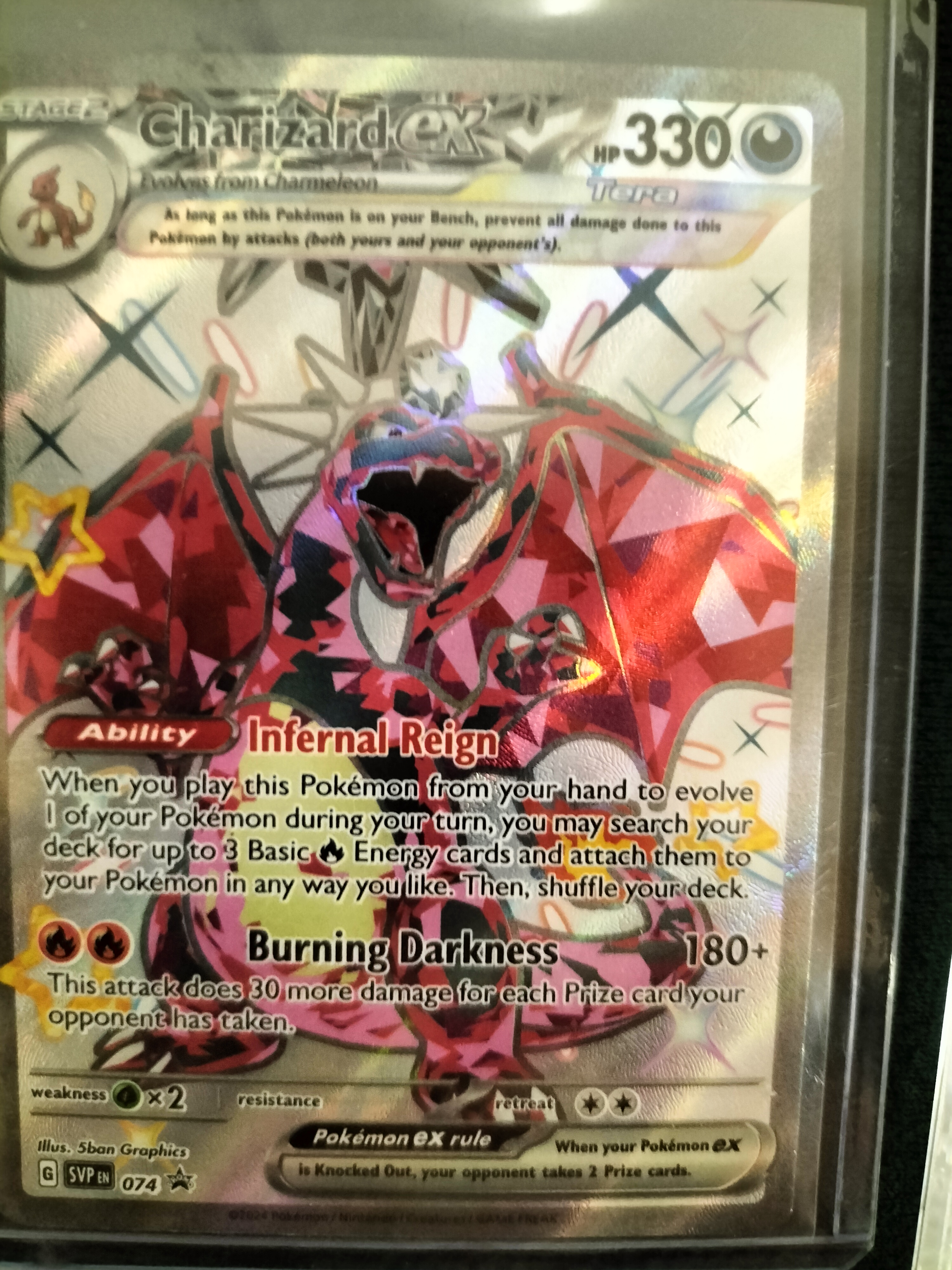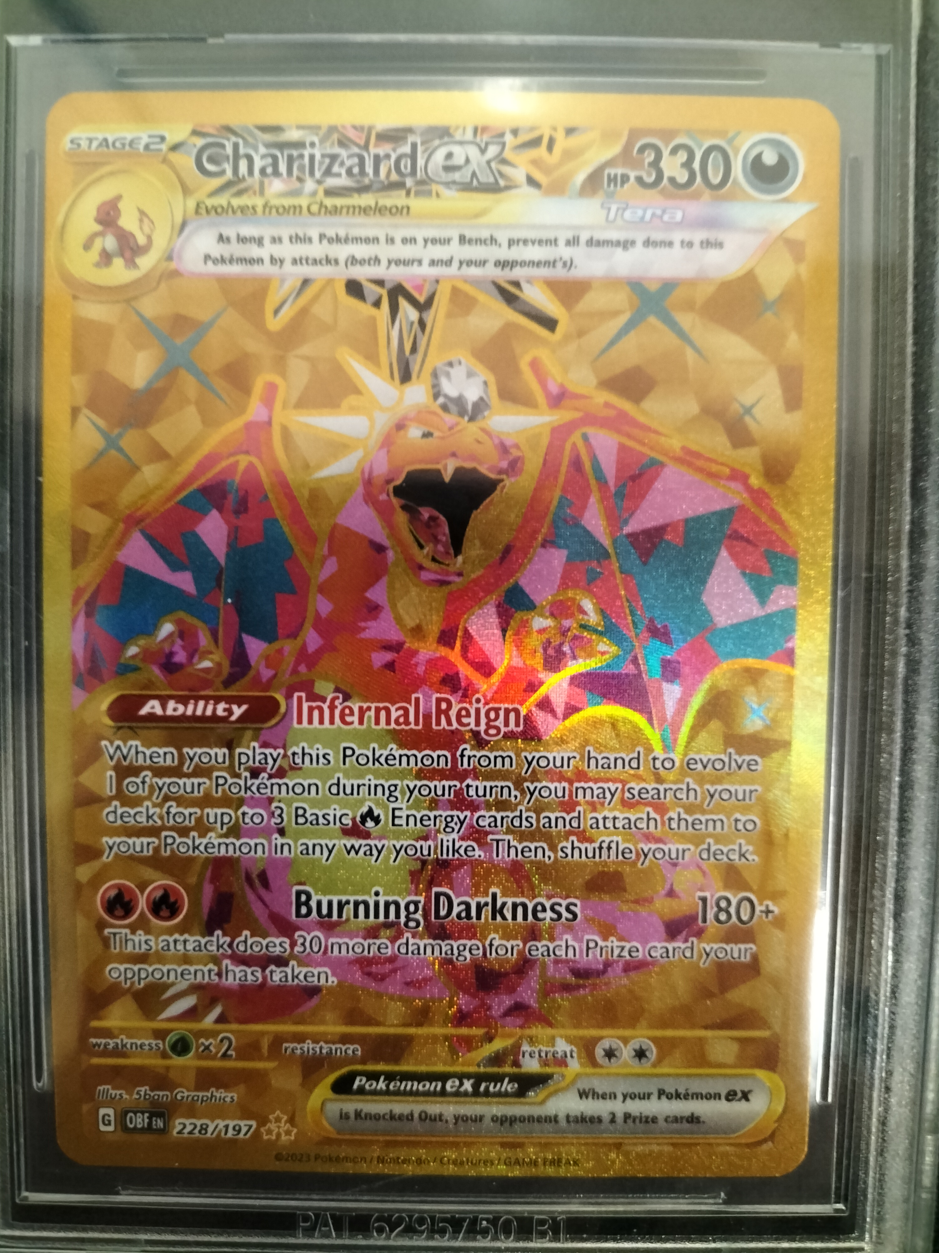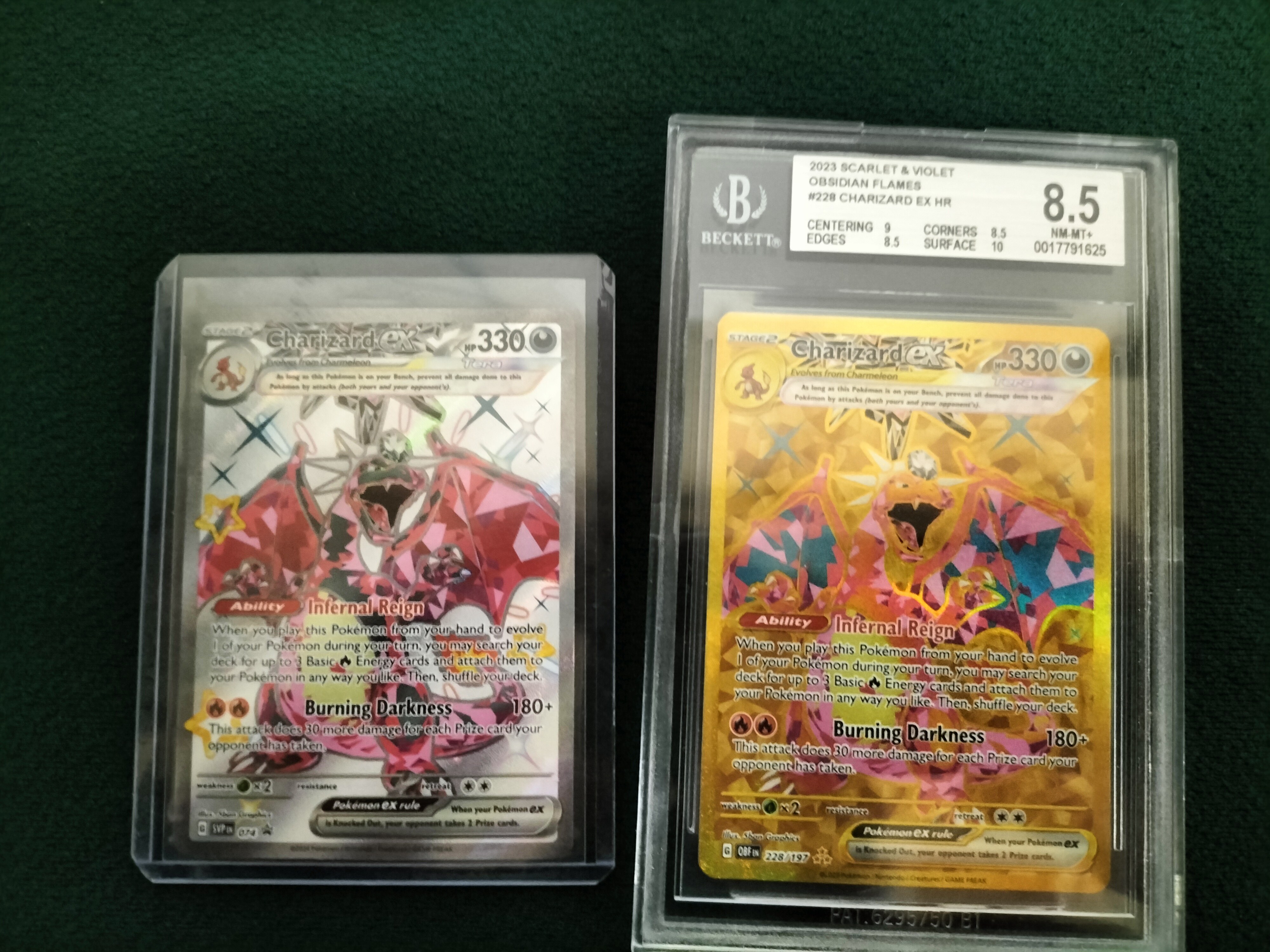 A pair of Pokémon cards consisting of a silver-toned Charizard ex promo and a gold-toned Charizard ex card from the 2023 Scarlet and Violet Obsidian Flames set, graded 8.5 by Beckett.