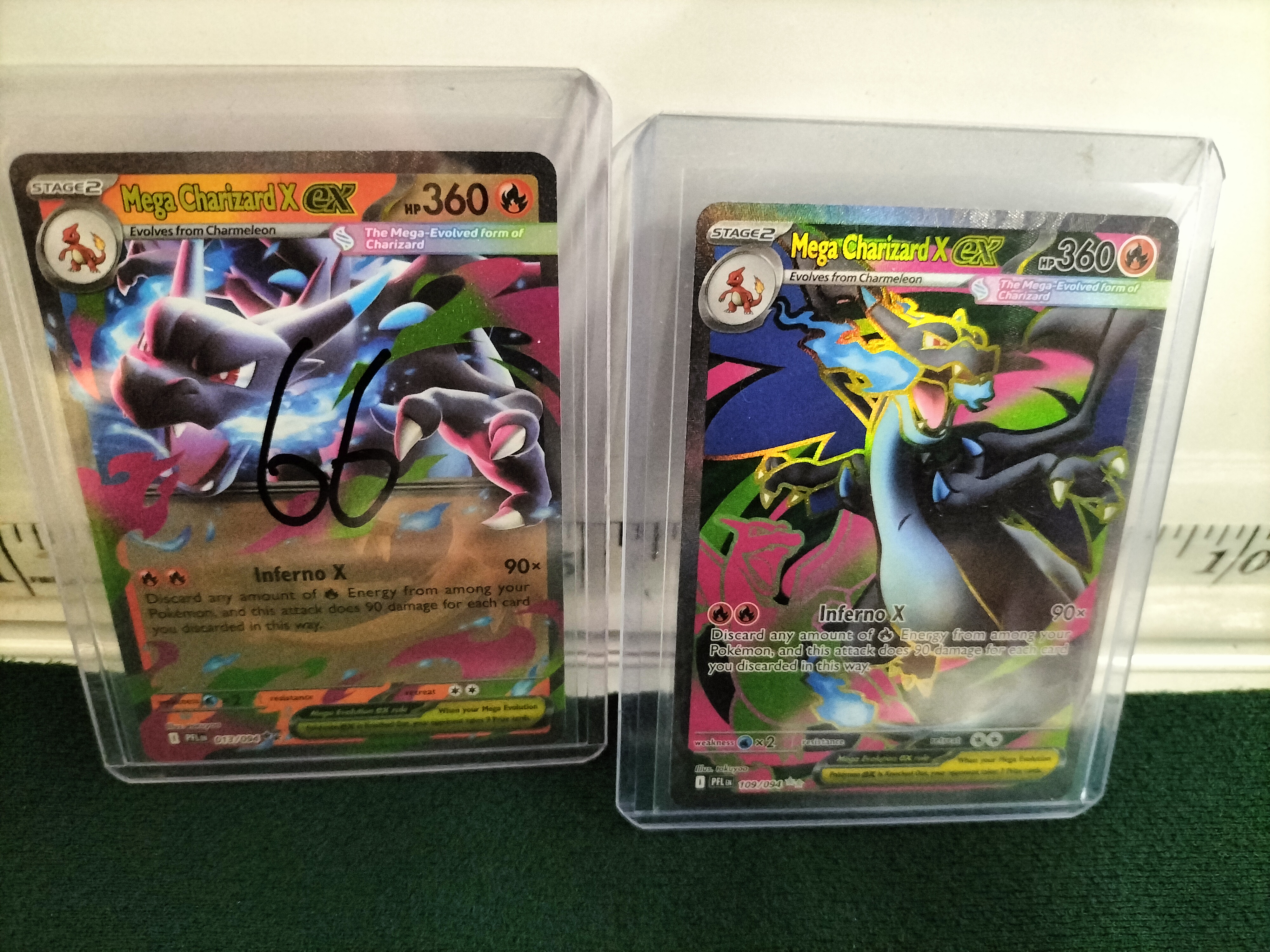 A pair of Pokemon Mega Charizard X ex trading cards numbered 013/094 and 109/094 from the Phantasmal Flames set, housed in protective cases.