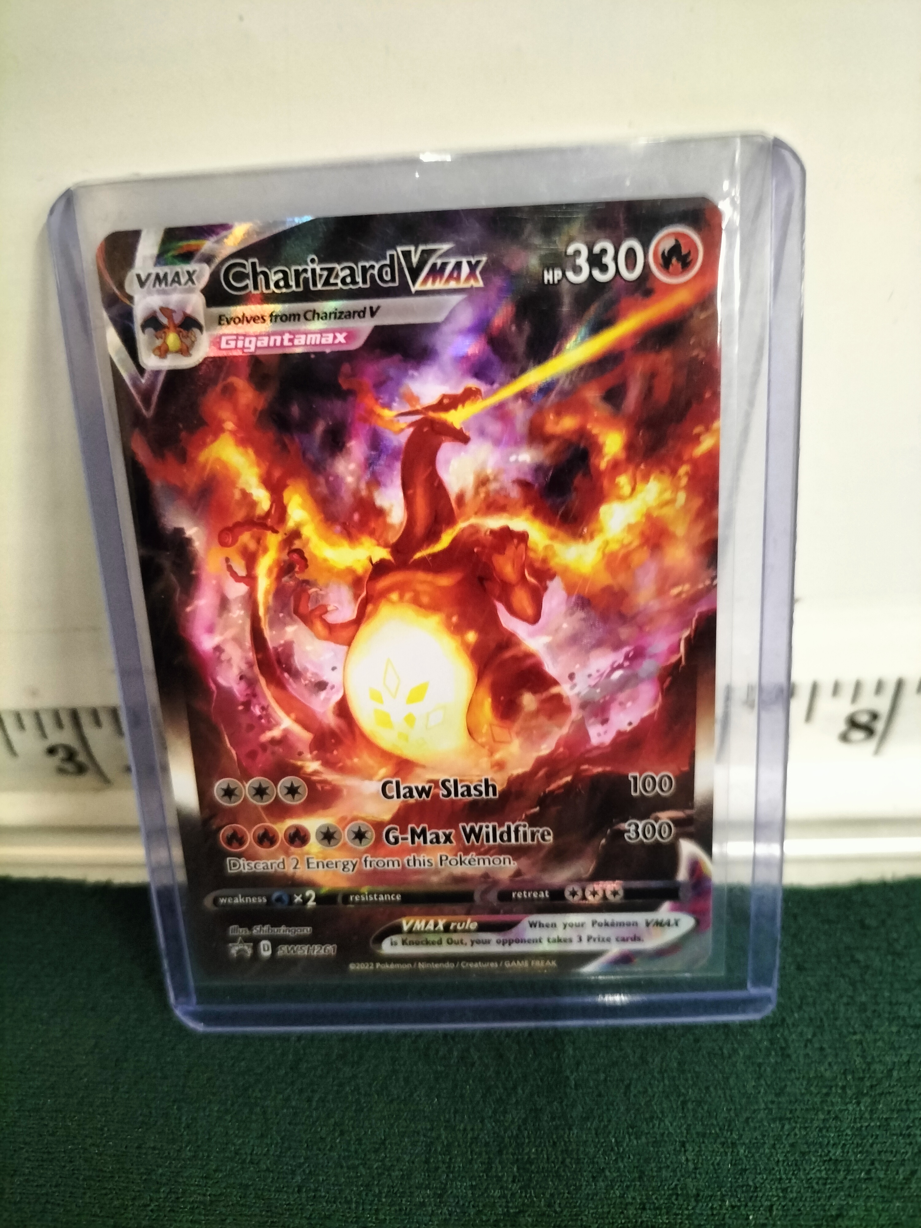 A Charizard VMAX Gigantamax Pokémon trading card featuring orange, red, and yellow colours, marked SWSH261 and dated 2022.