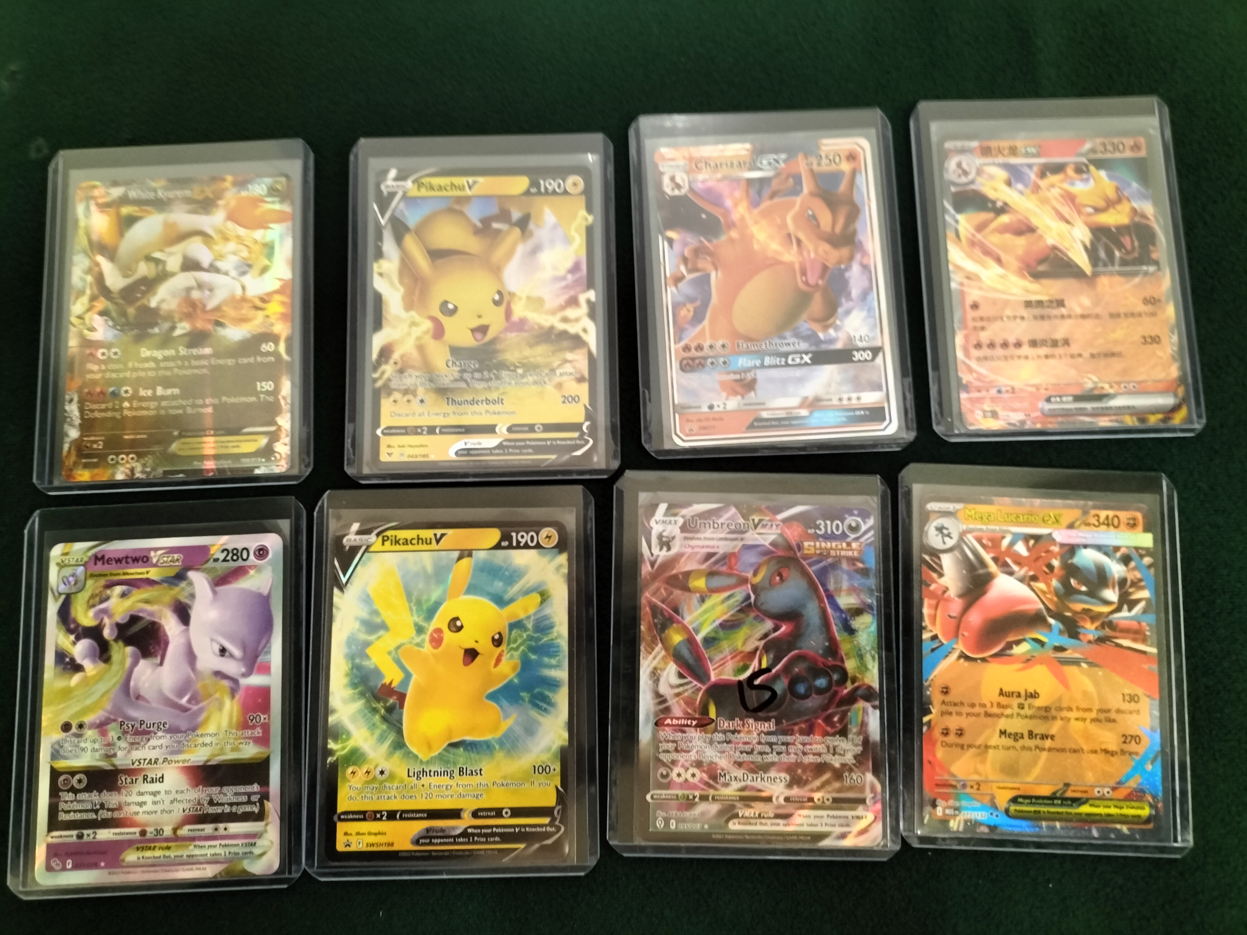 A collection of multi-coloured Pokémon trading cards featuring White Kyurem EX, Pikachu V, Charizard GX, Mewtwo VSTAR, Umbreon VMAX, and Mega Lucario EX, each in a protective sleeve.