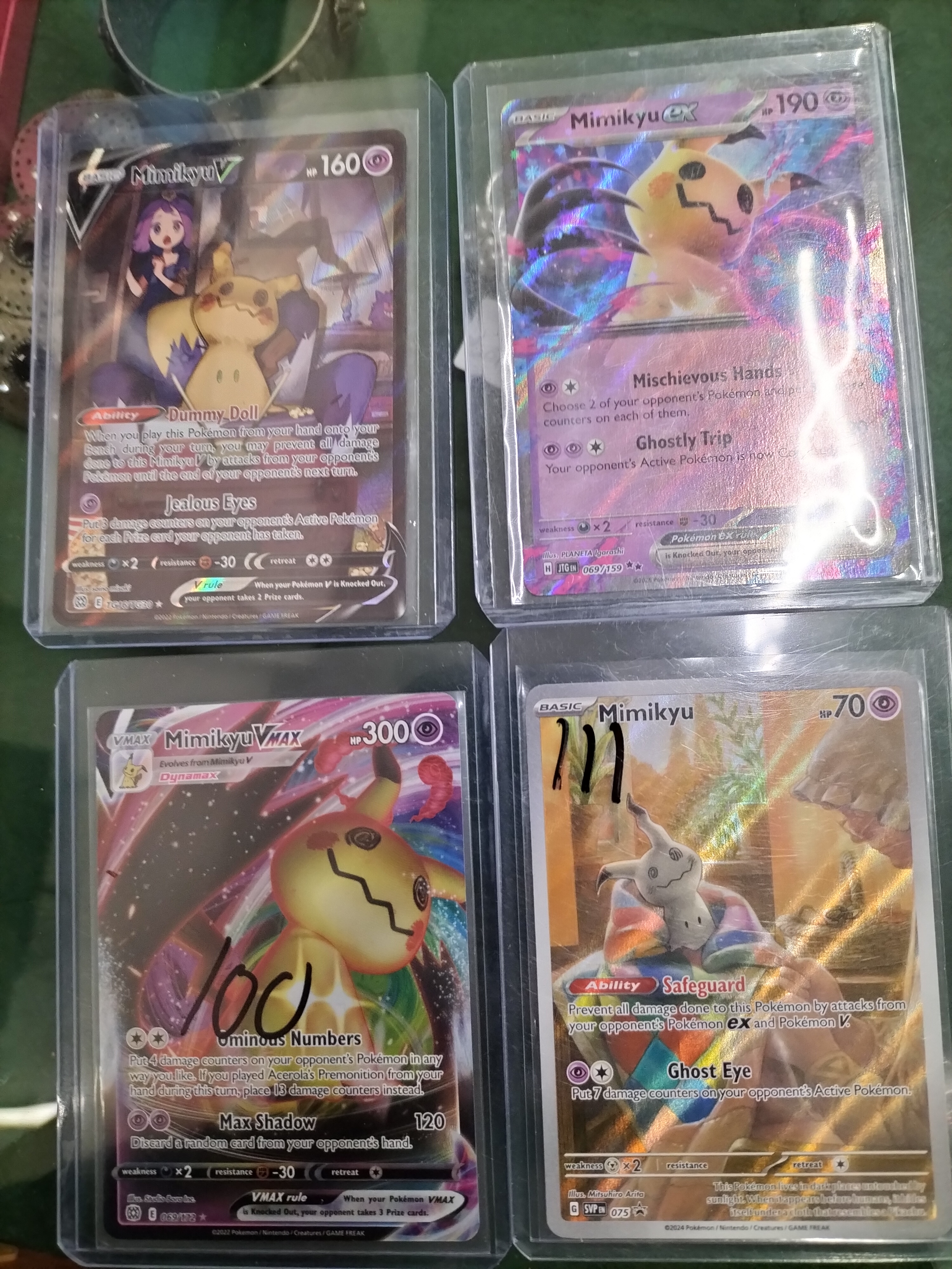 A collection of multi-coloured Mimikyu Pokémon trading cards including Mimikyu V, Mimikyu ex, Mimikyu VMAX, and Mimikyu, some featuring handwritten markings.