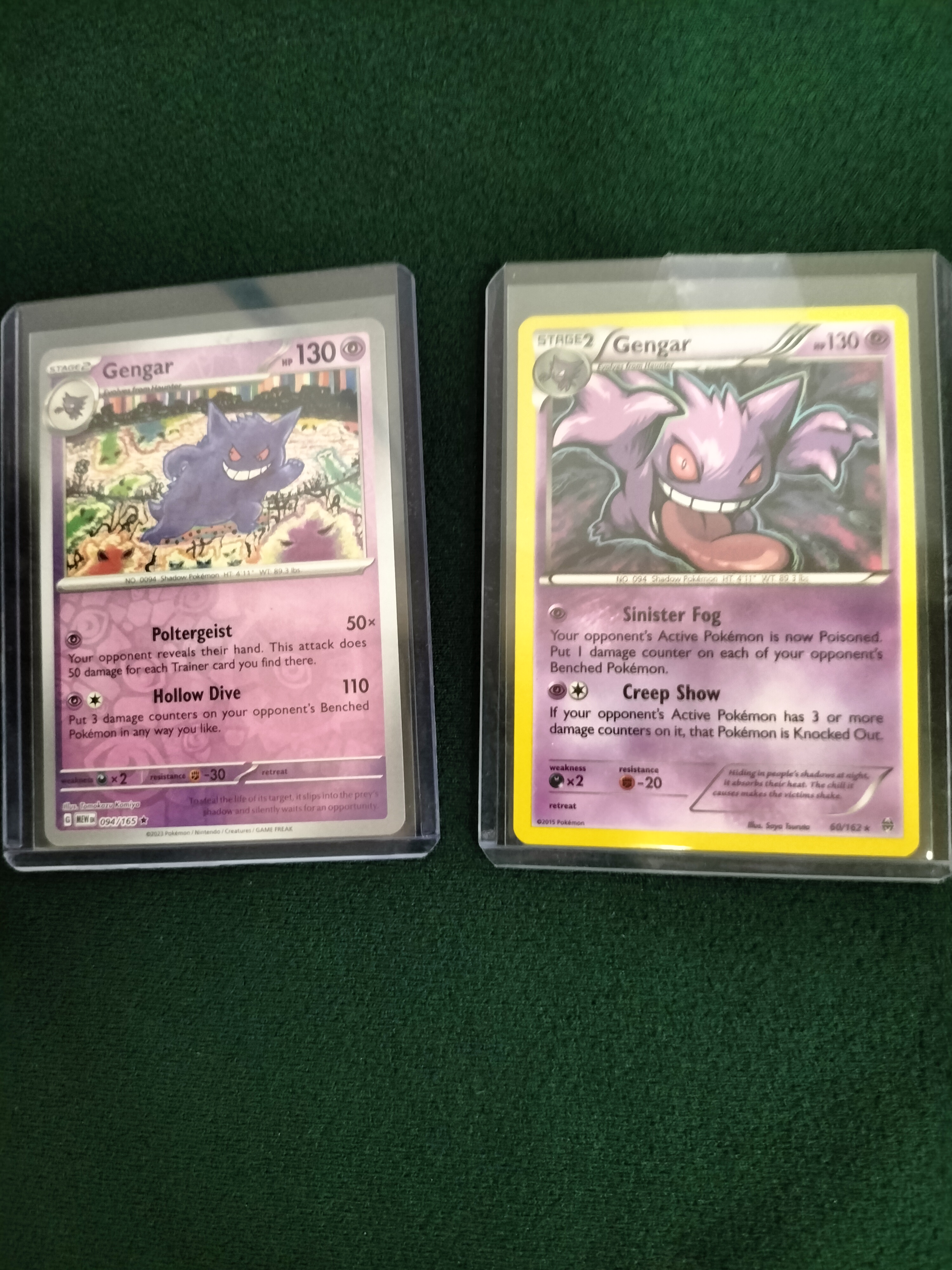 A pair of purple and yellow Gengar Pokémon trading cards including a 2015 BREAKthrough 60/162 holo rare and a 2023 094/165 card.