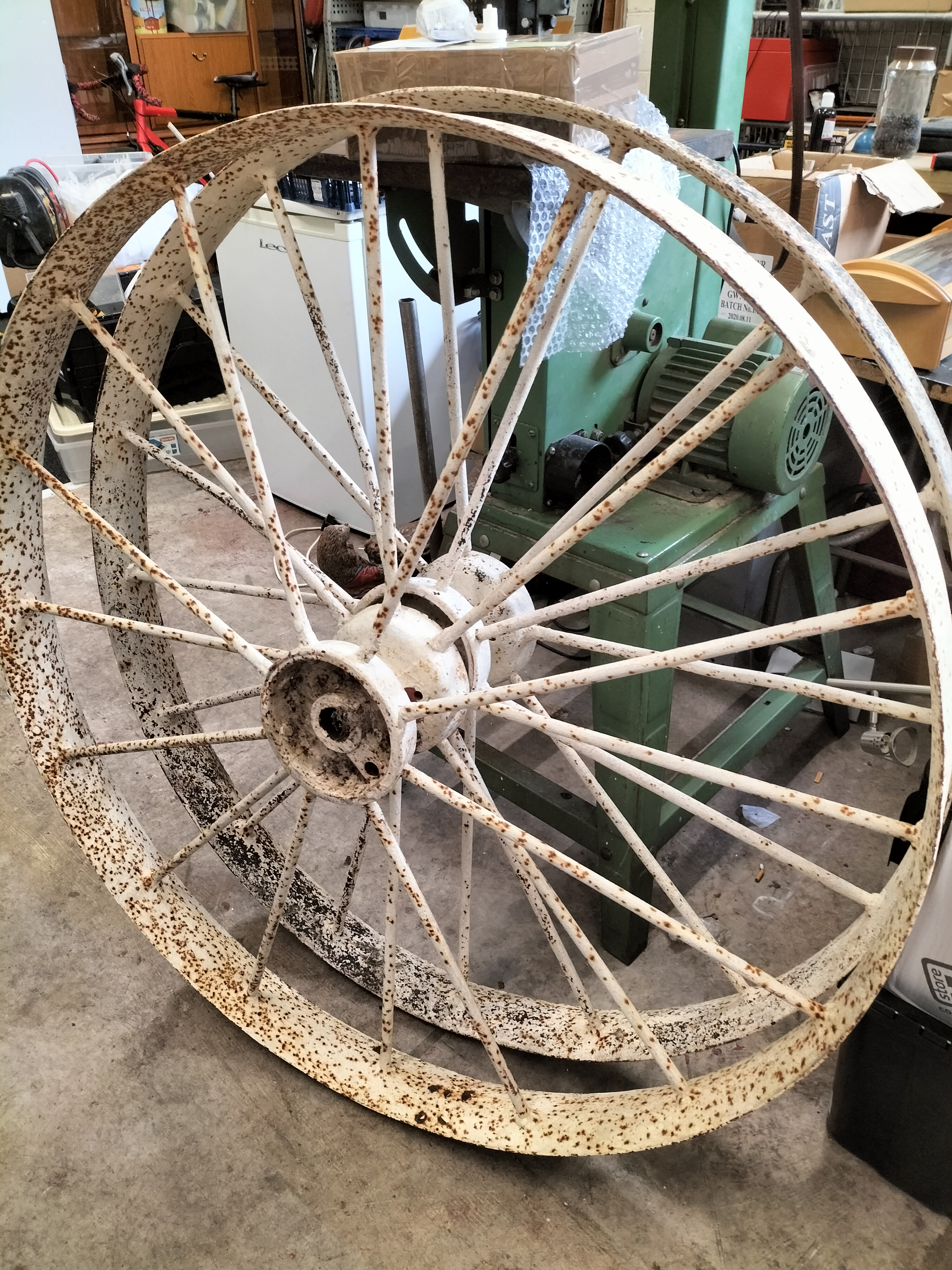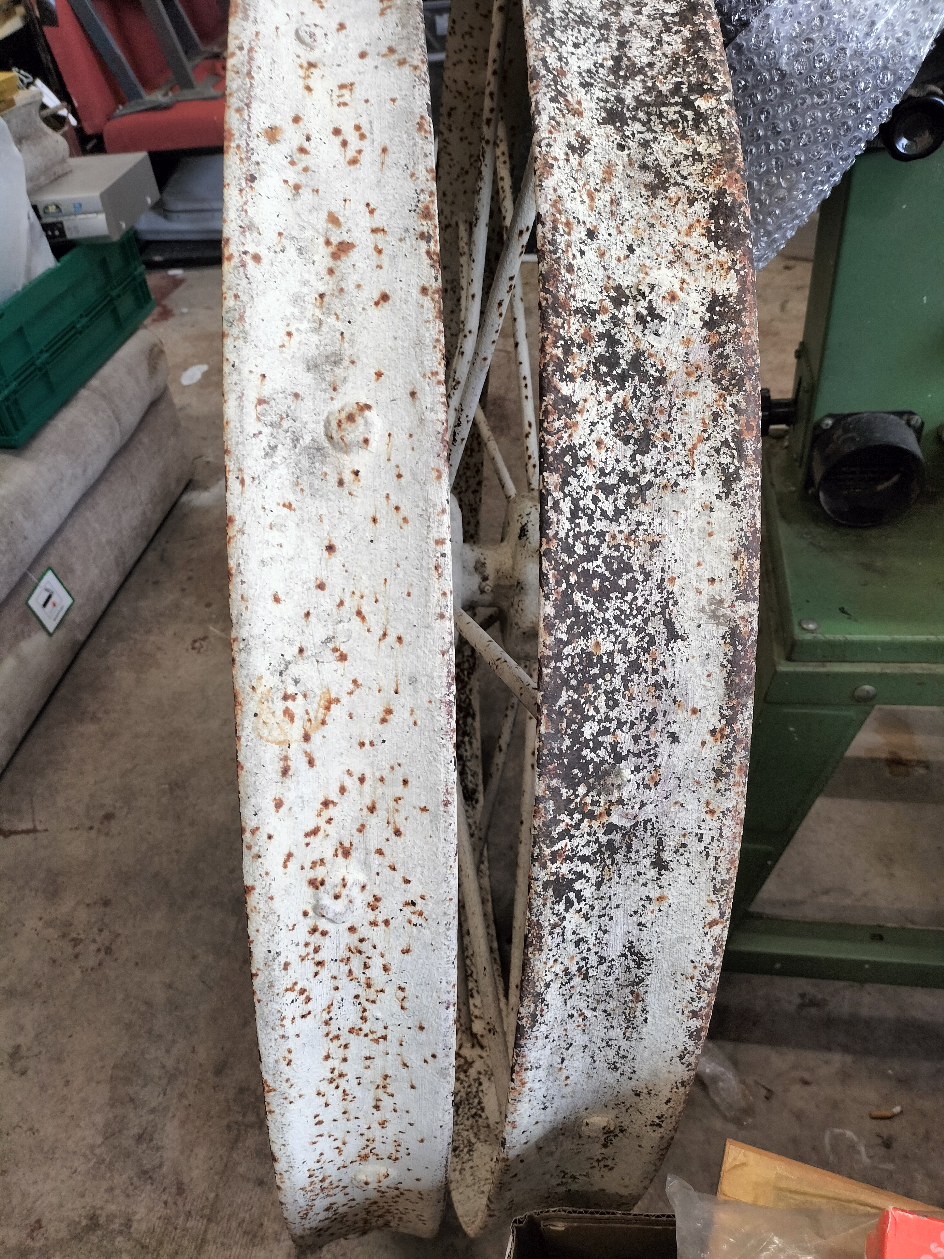 A pair of large white-painted metal spoked wheels featuring significant surface rust and vintage agricultural styling.