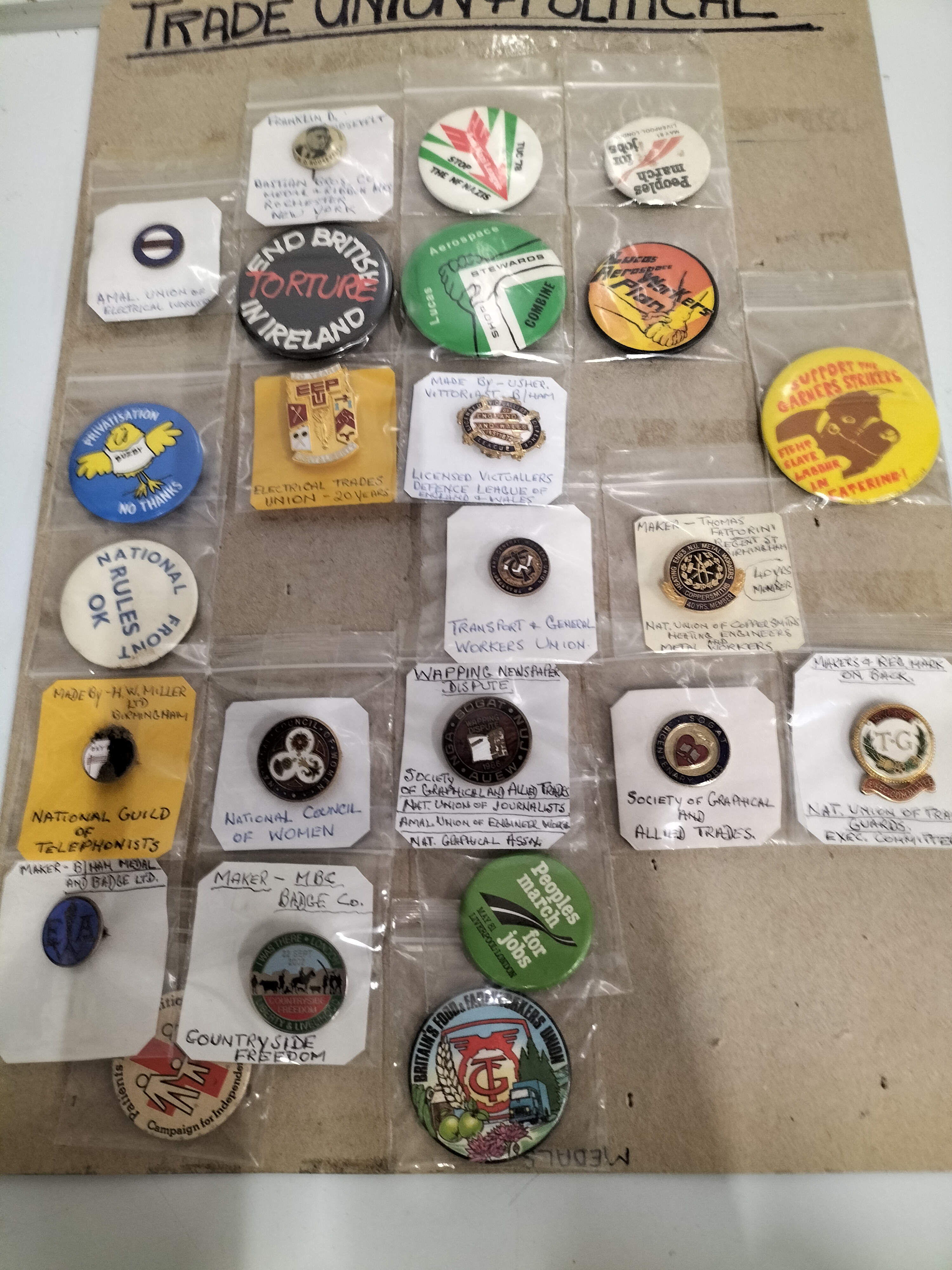 A collection of multicoloured trade union and political lapel badges and pins featuring various inscriptions and maker’s marks including Thomas Fattorini and H.W. Miller Ltd, with diameters ranging from approximately 1cm to 5cm.