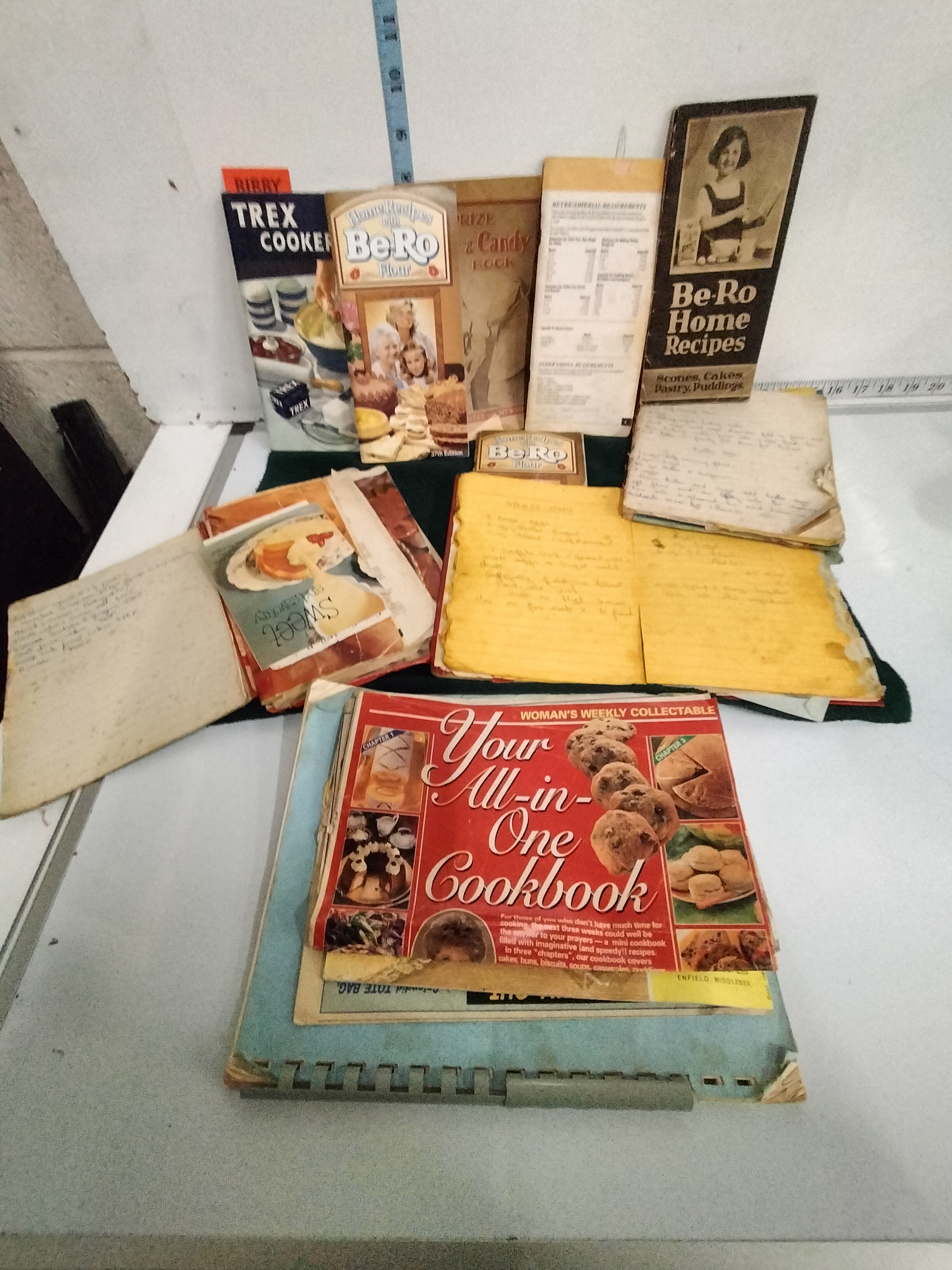 A collection of vintage recipe booklets including Be-Ro Home Recipes, Trex Cookery, and Woman’s Weekly titles, accompanied by various handwritten notes, ranging in size up to 25cm.